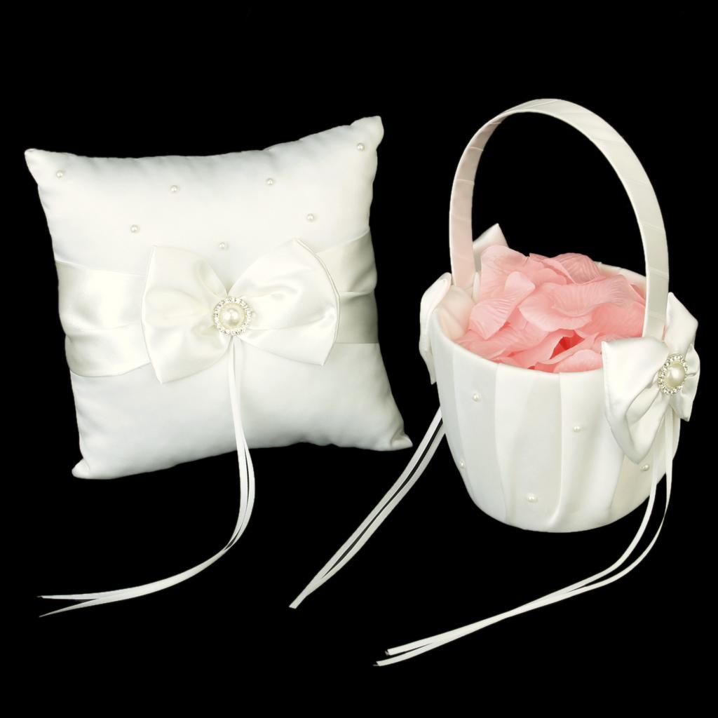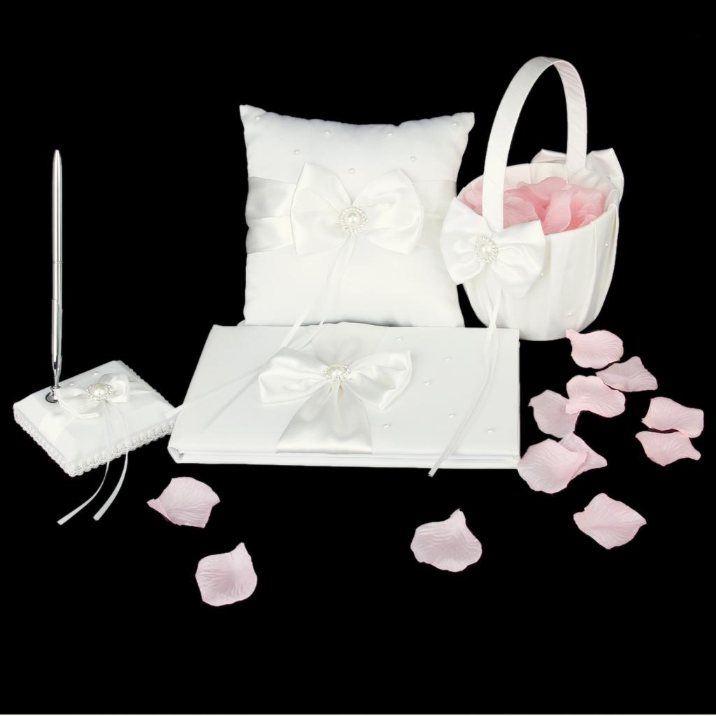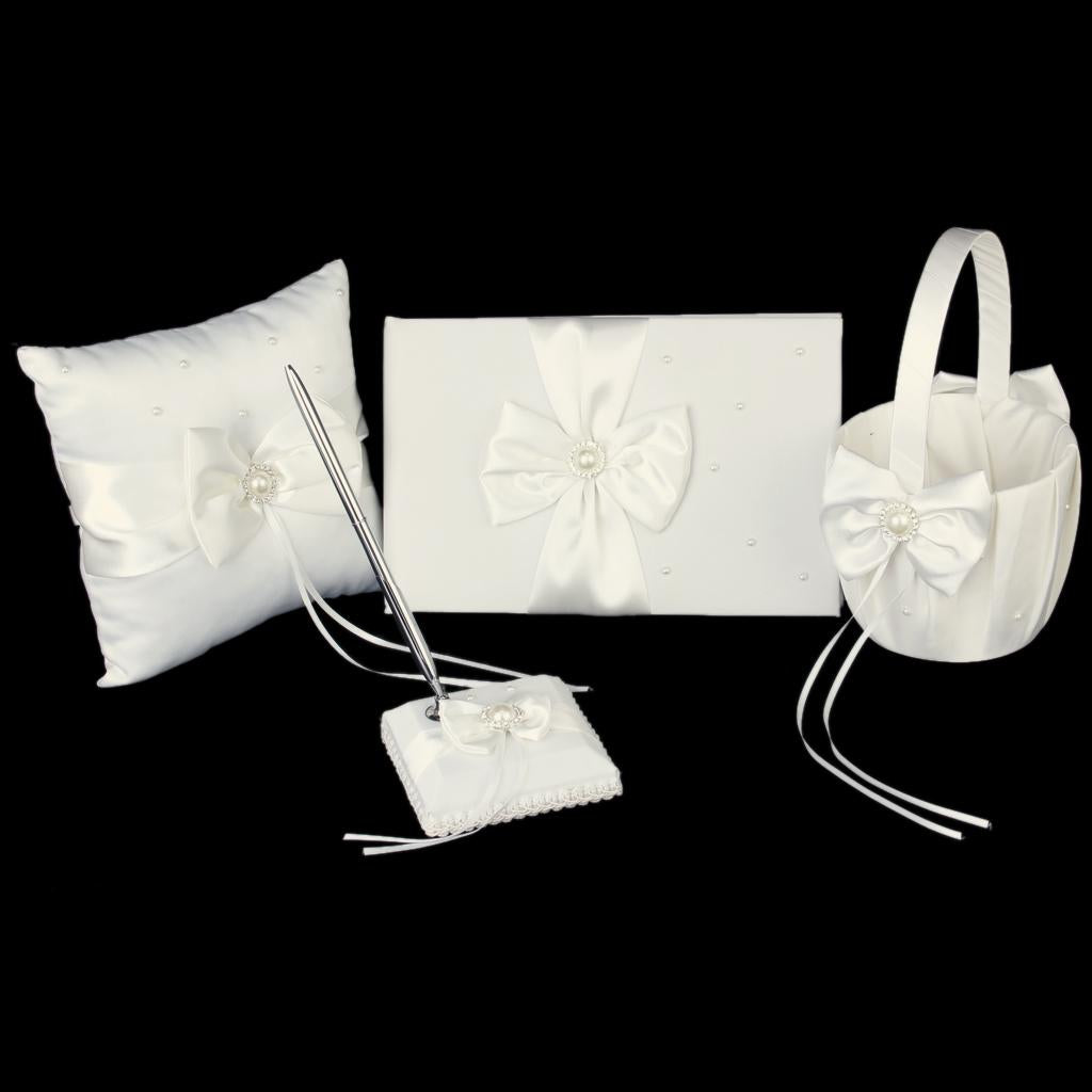 Pearl Bowknot Wedding Party Guest Book and Pen Ring Pillow Flower Basket Set