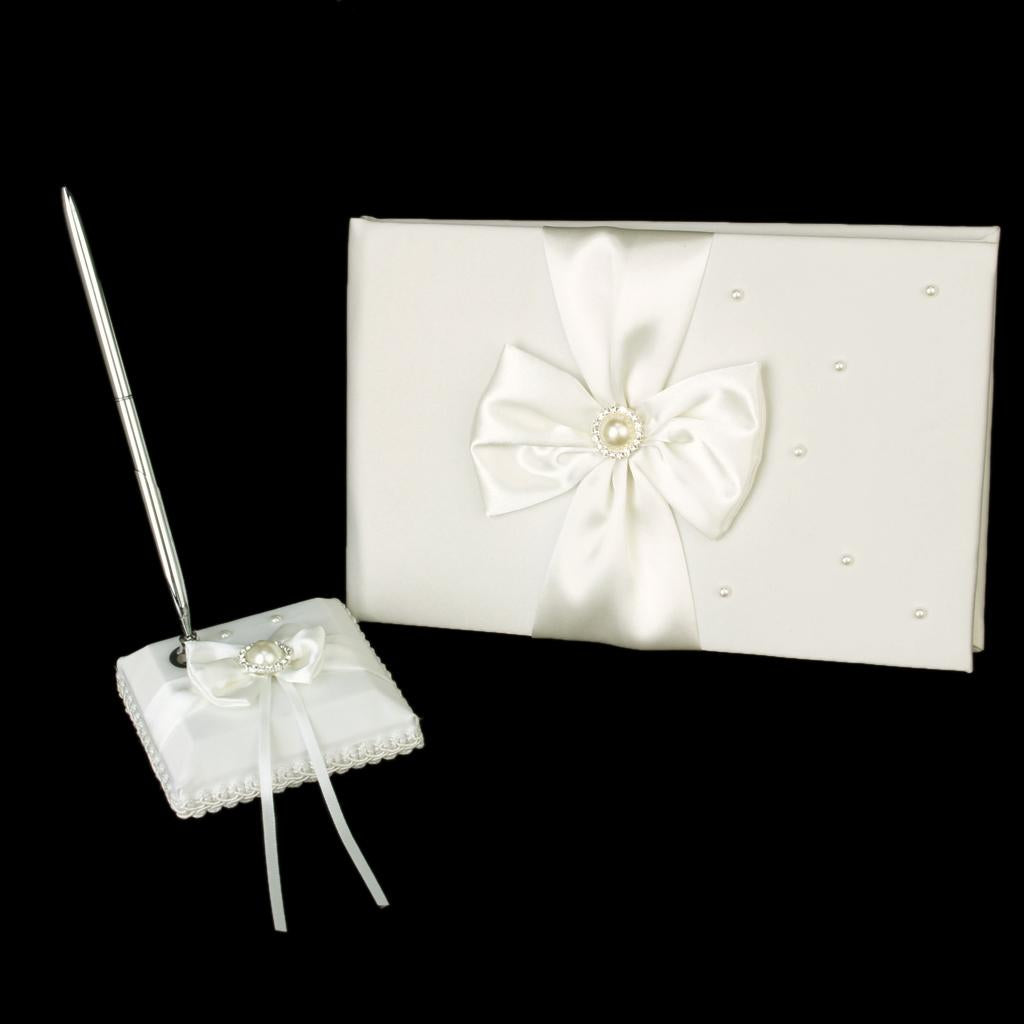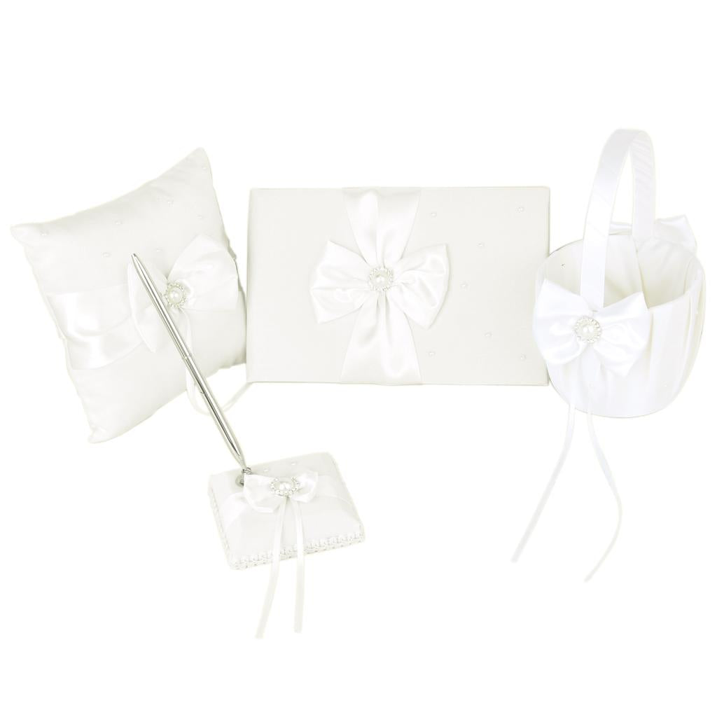 The listing comes with a complete set for a perfect wedding party.Guest book,pen stand,signing pen,ring pillow,flower basket,graceful ivory color,smooth satin material,pearl and bowknot accent,add a permanent wonderful memory for your big day.