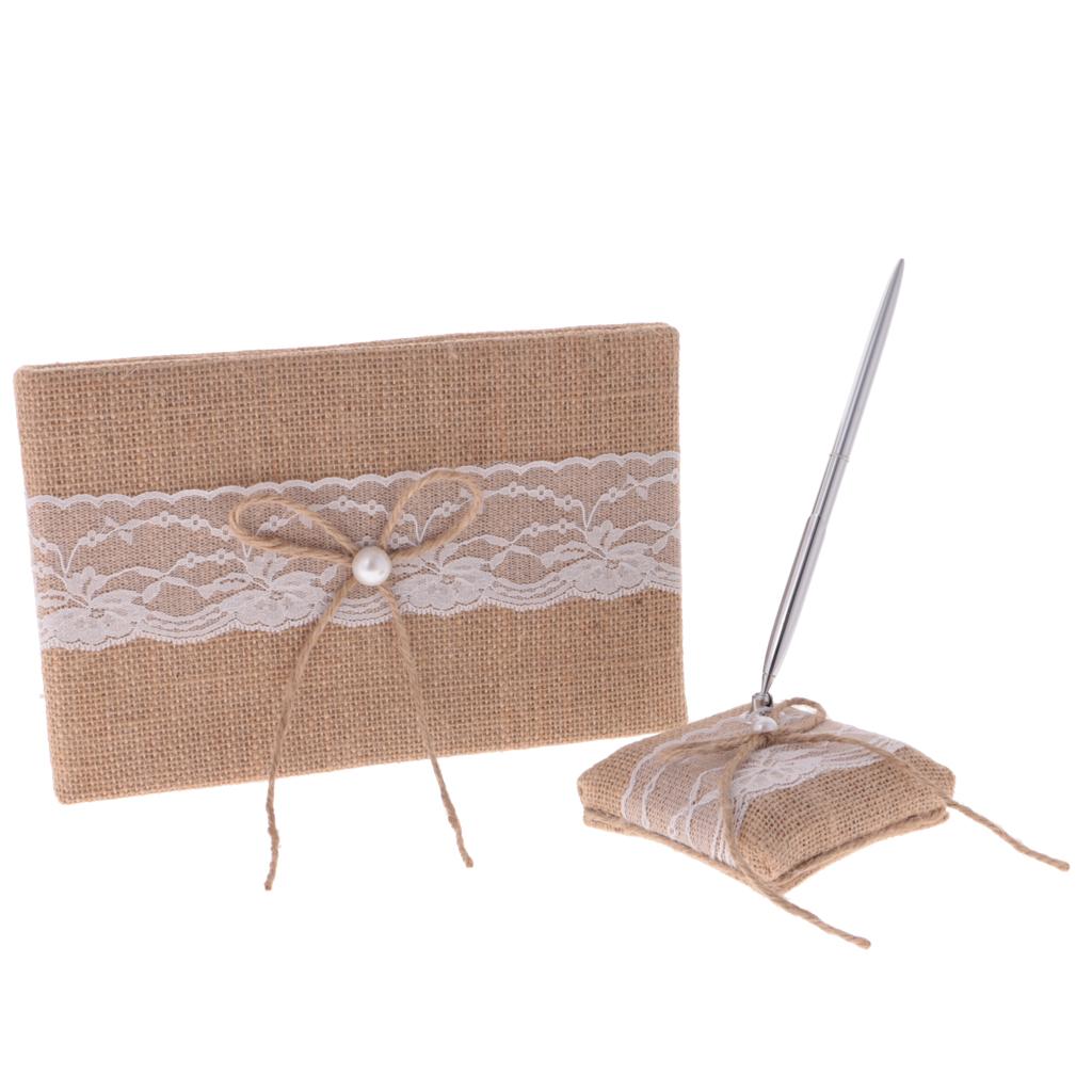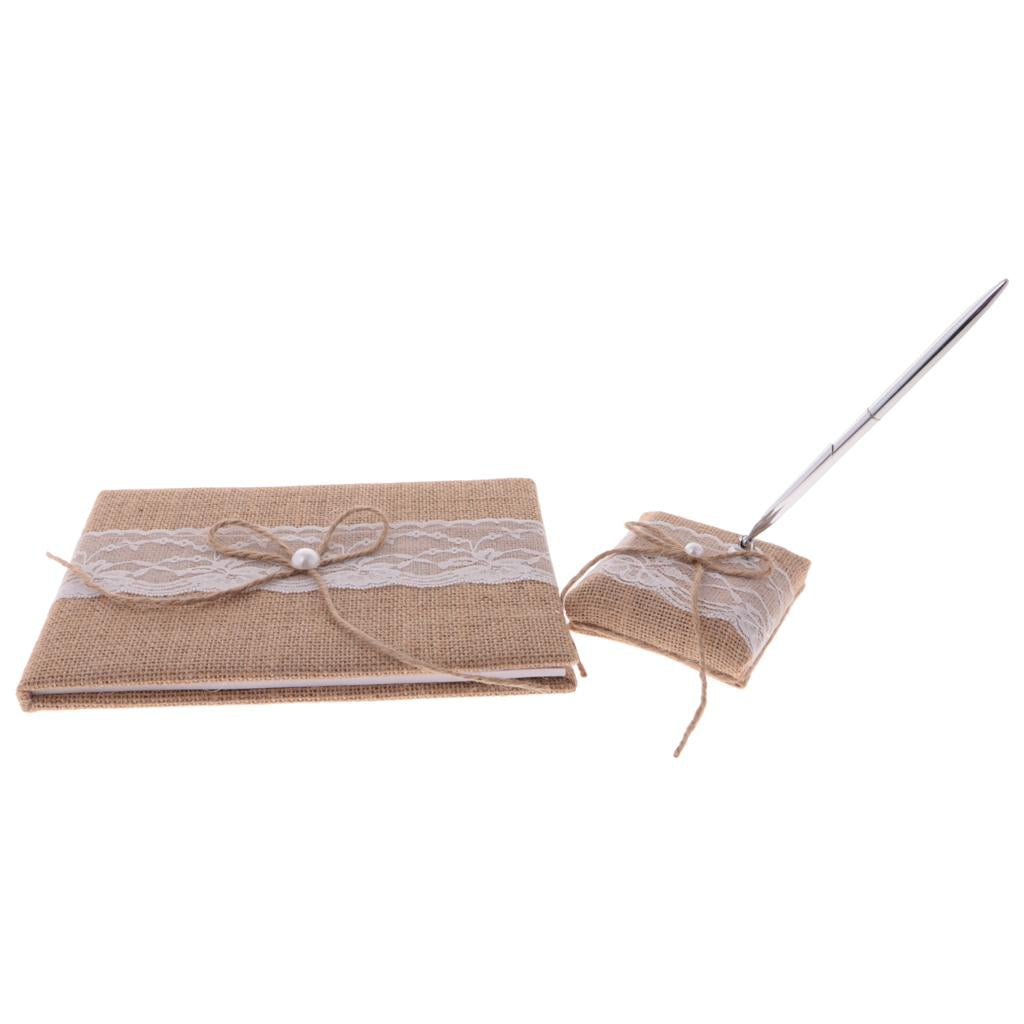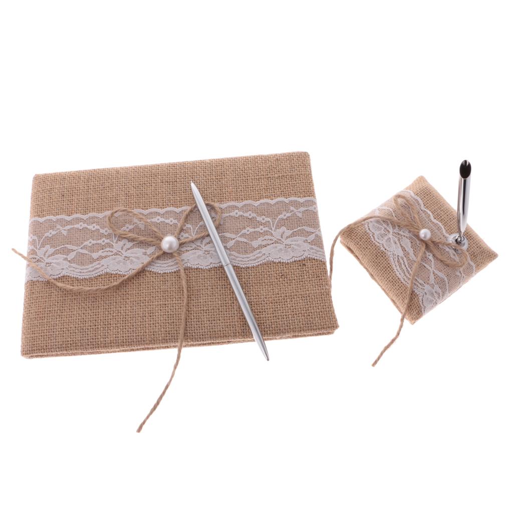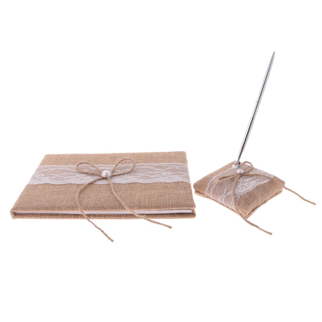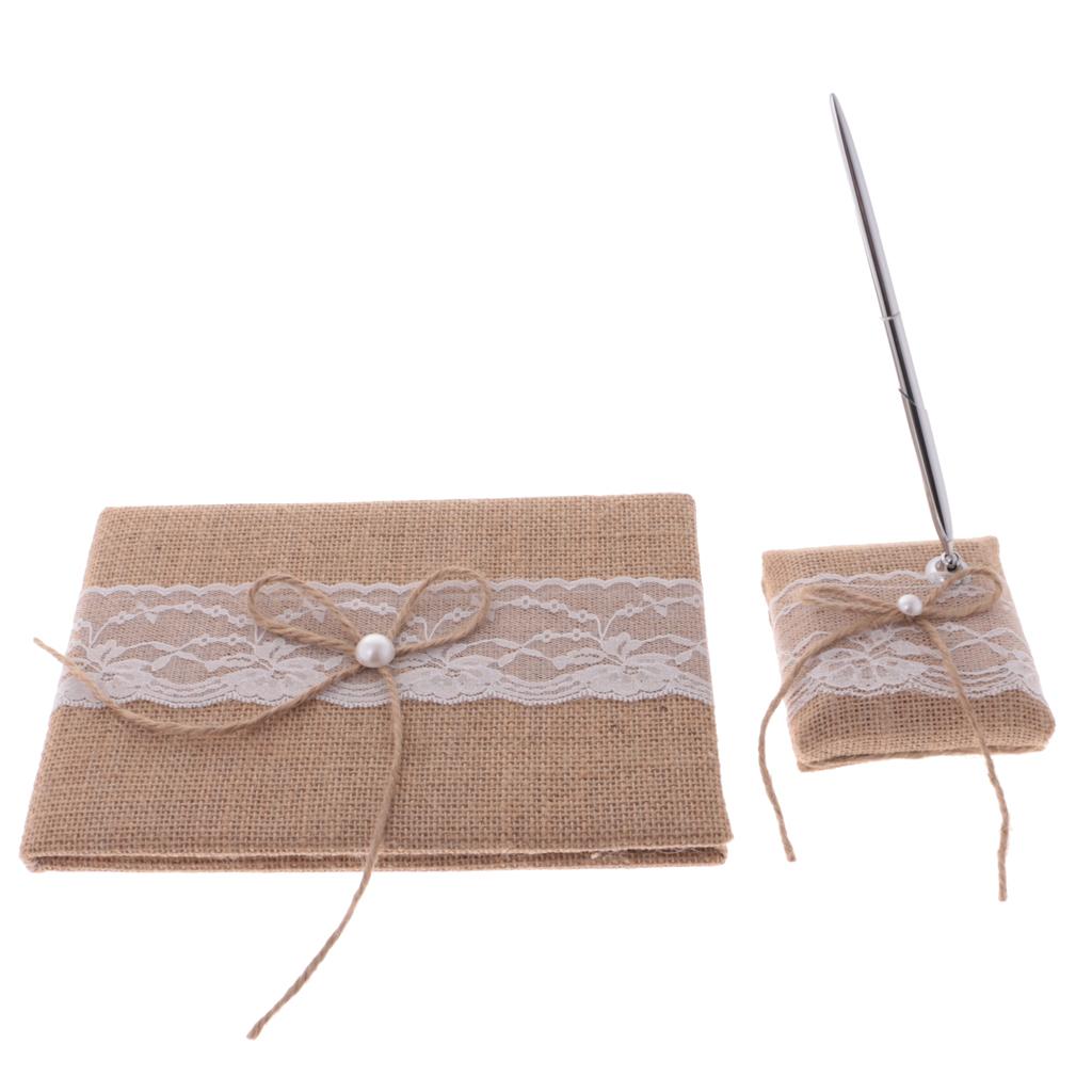 A set of rustic burlap bowknot pearls guest signing book and pen holder set