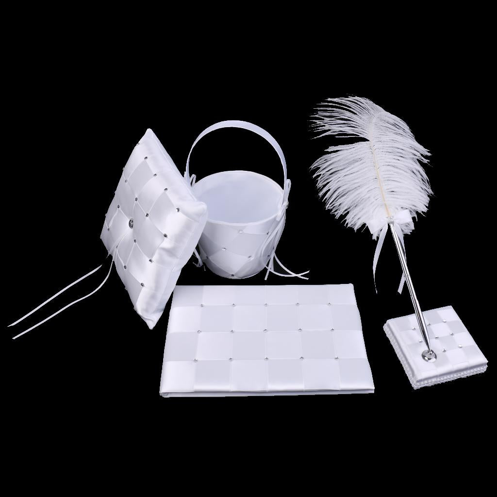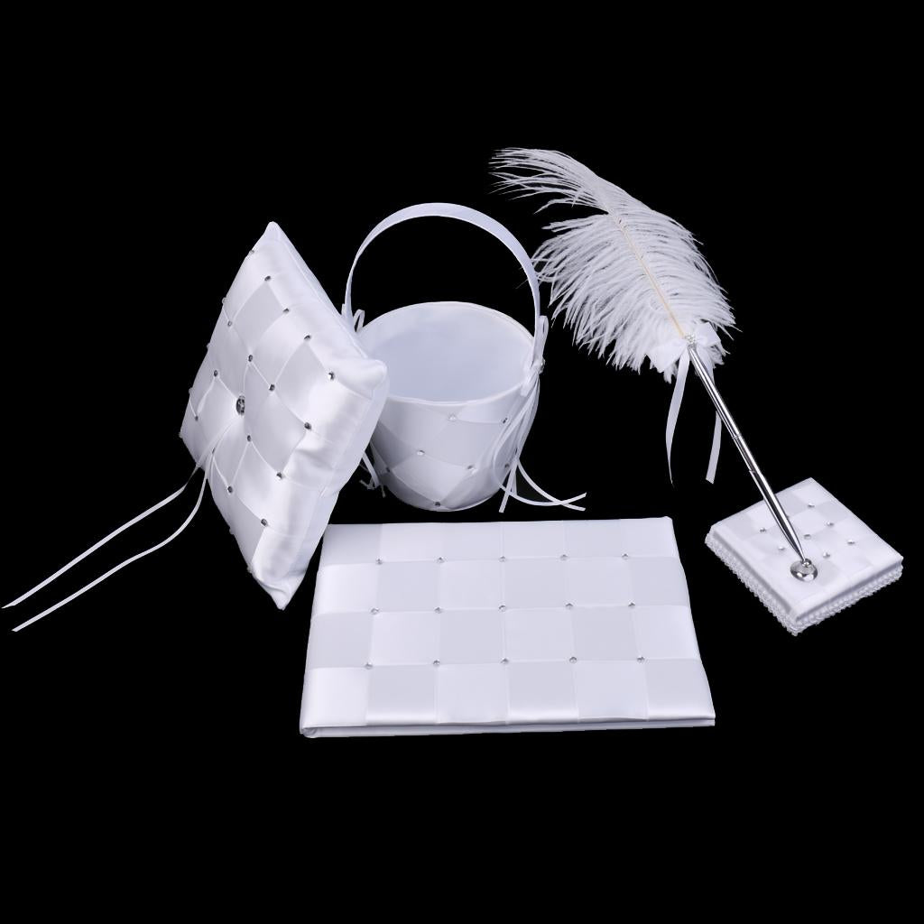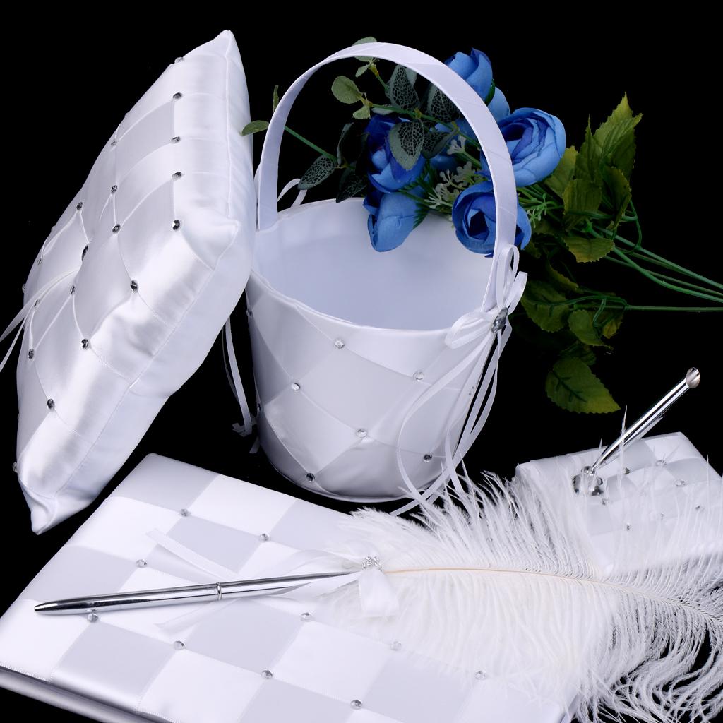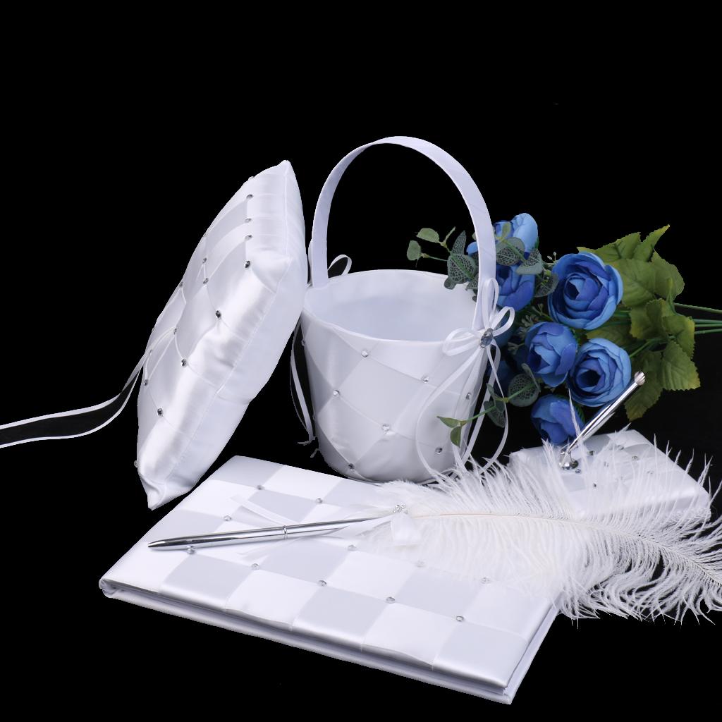 Including guest book,signing pen,pen stand,ring pillow,flower basket.