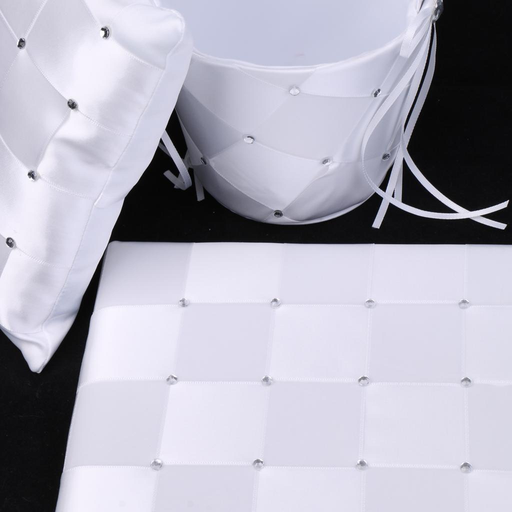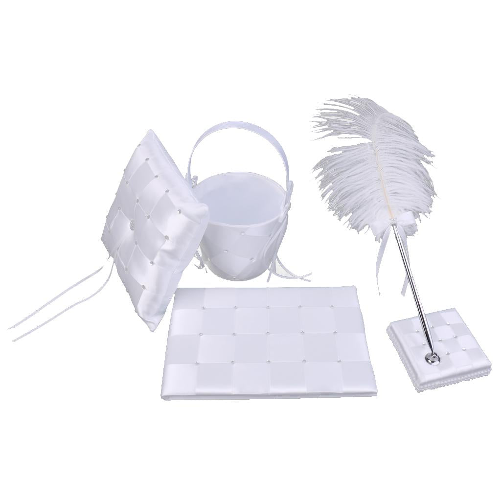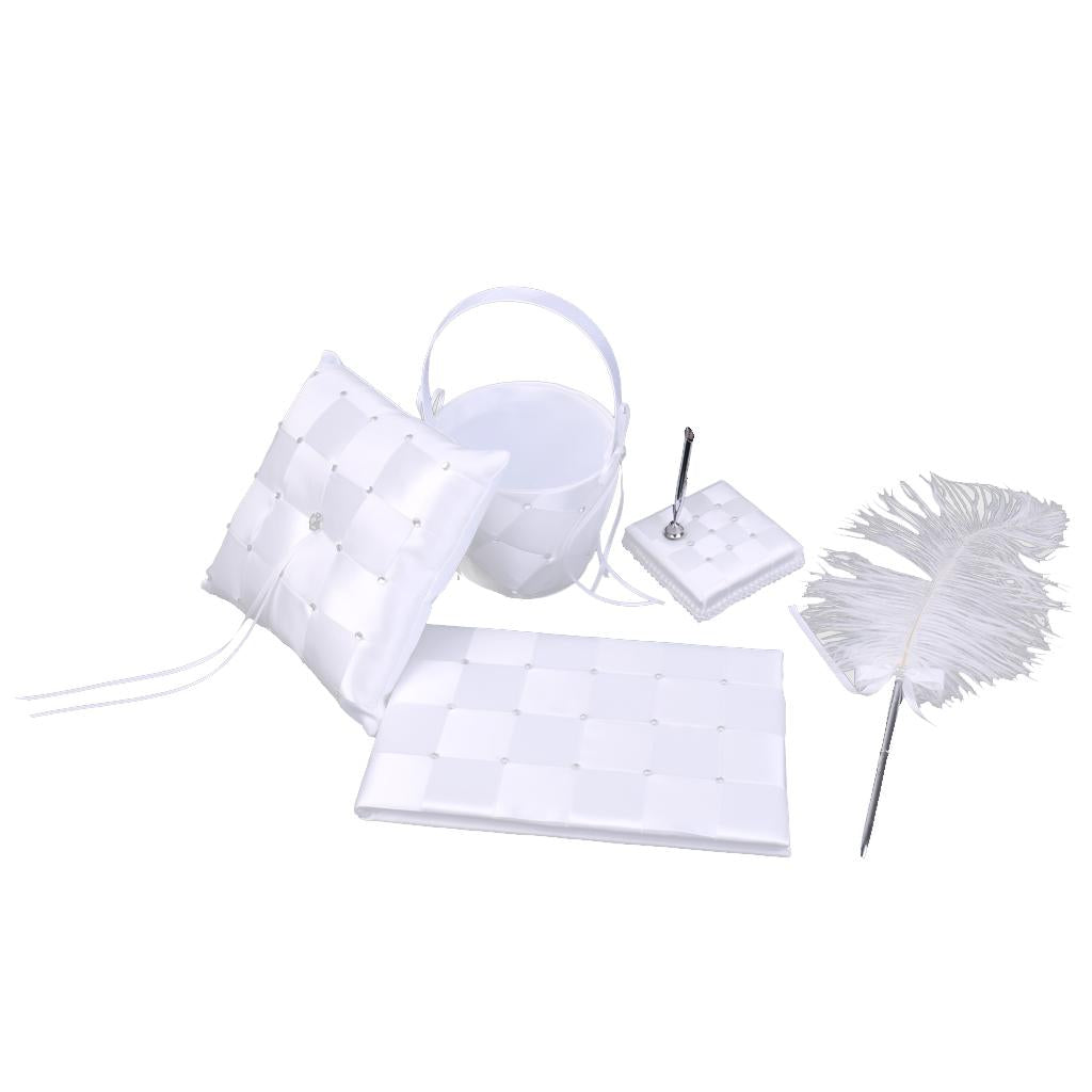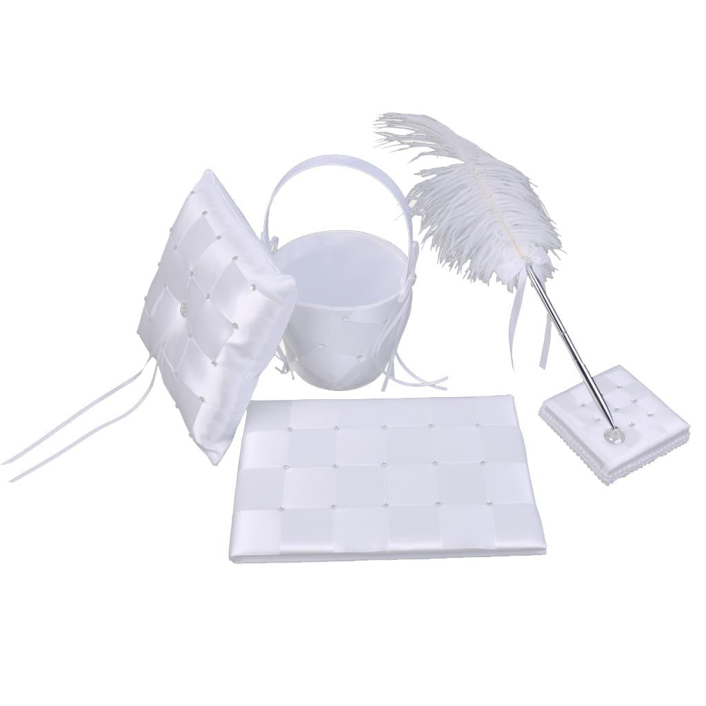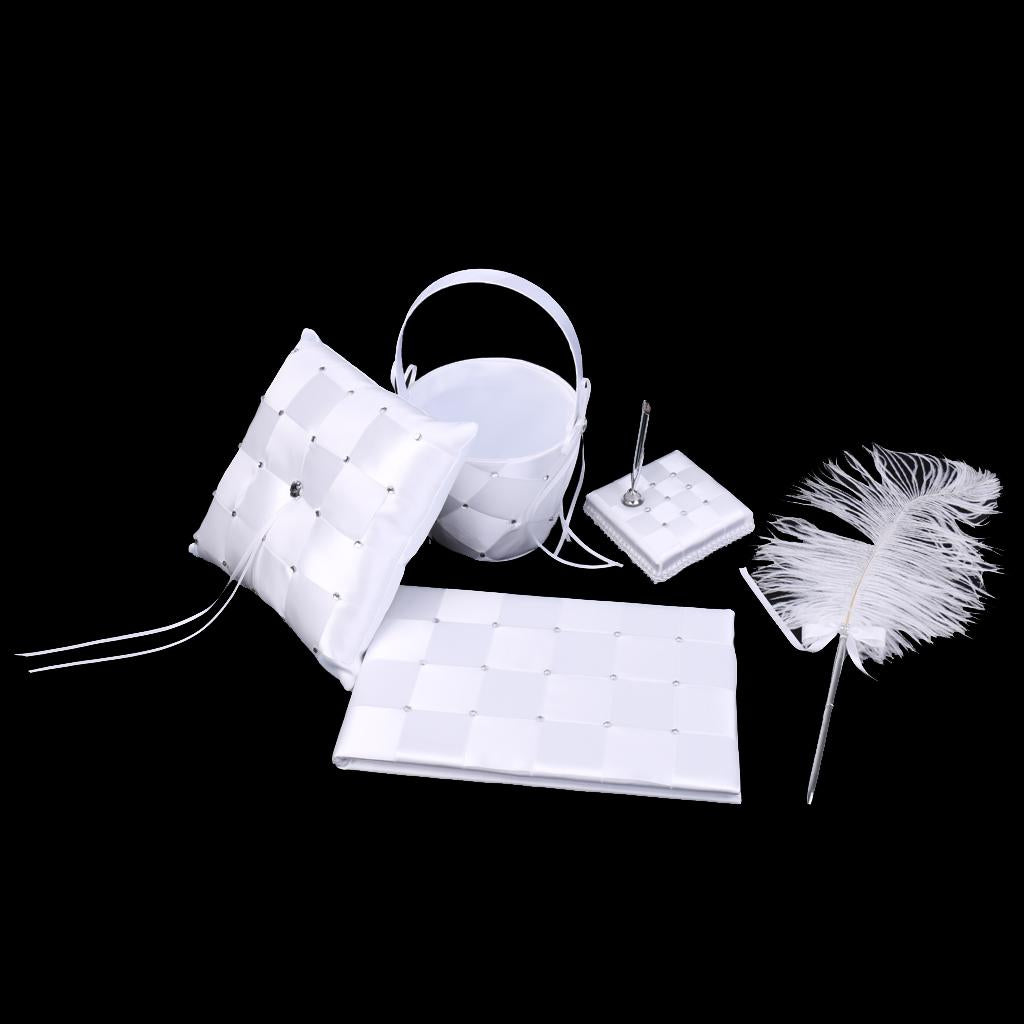 Including guest book,signing pen,pen stand,ring pillow,flower basket.
