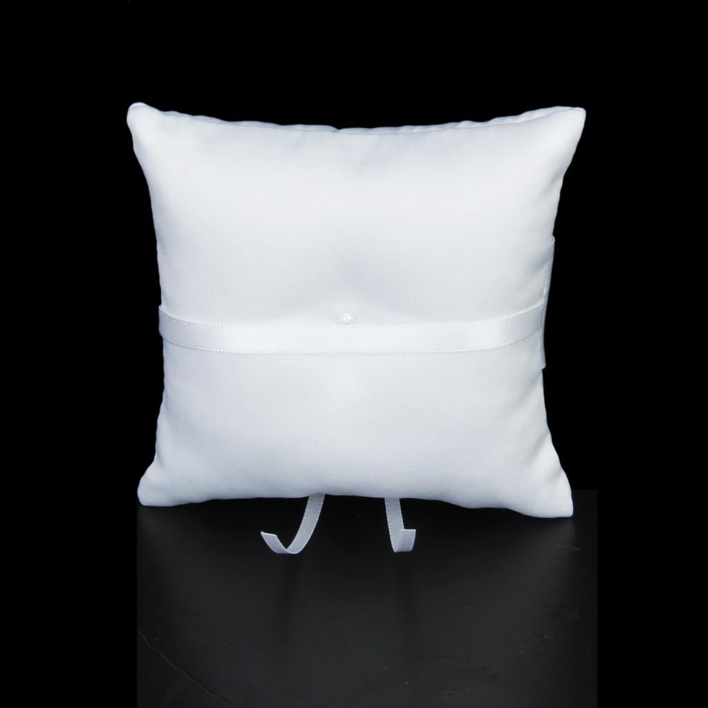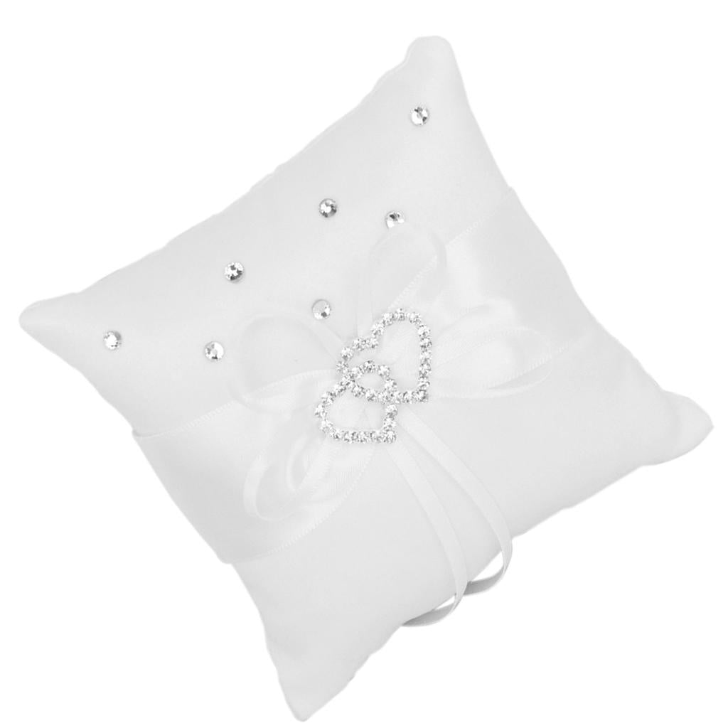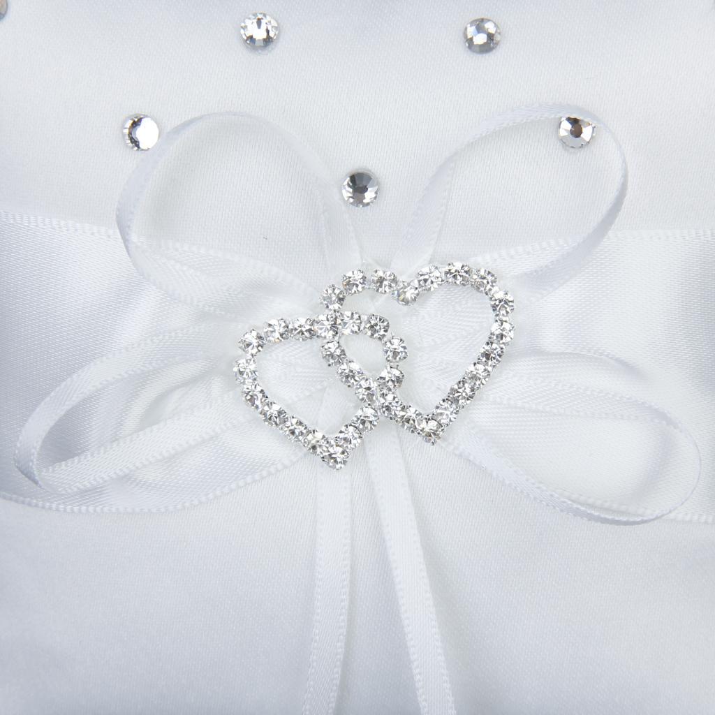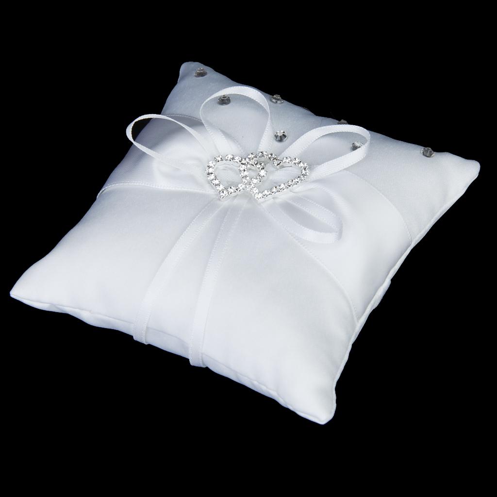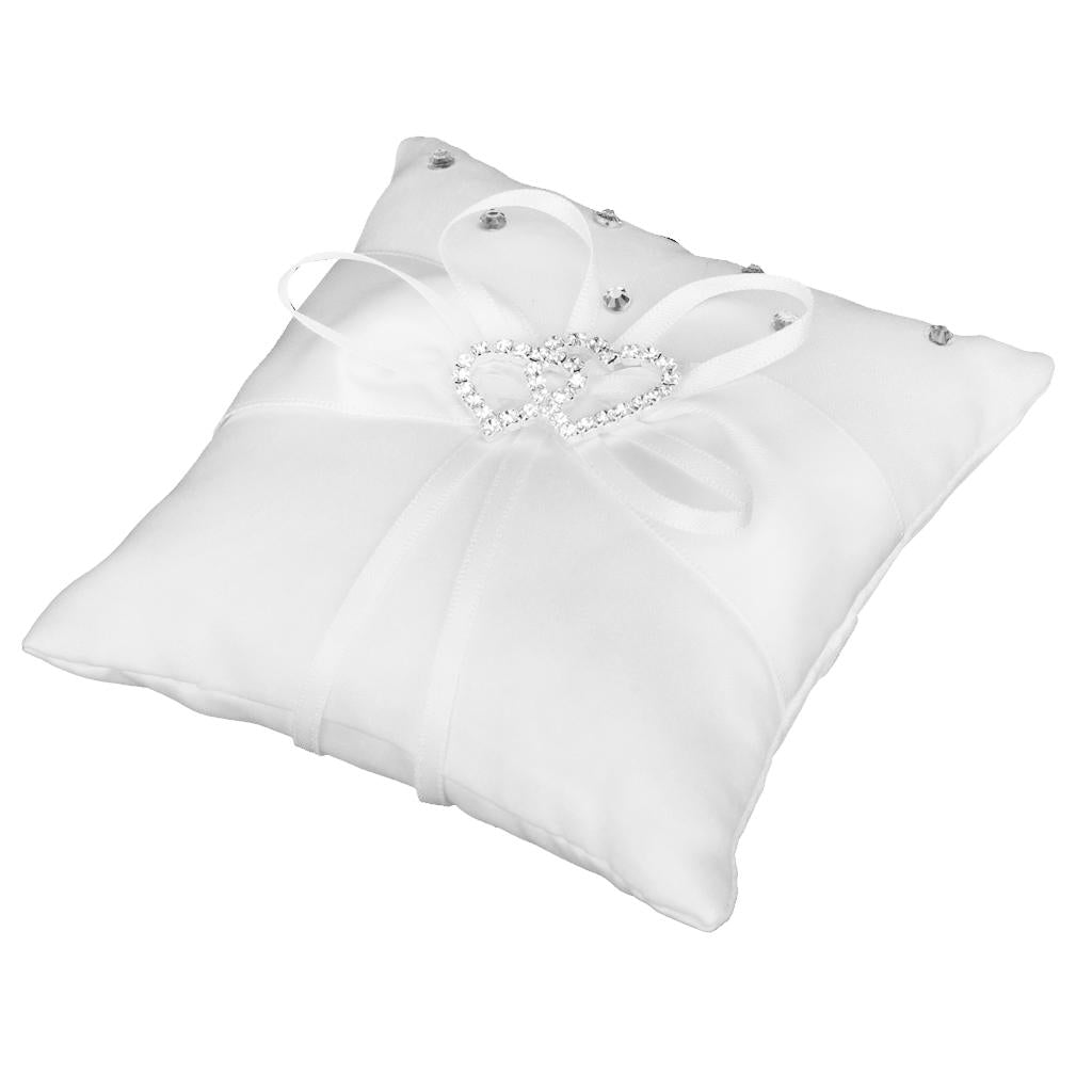 • White ring pillow decorated with satin ribbon and sparking double heart diamante buckle to tie the ring