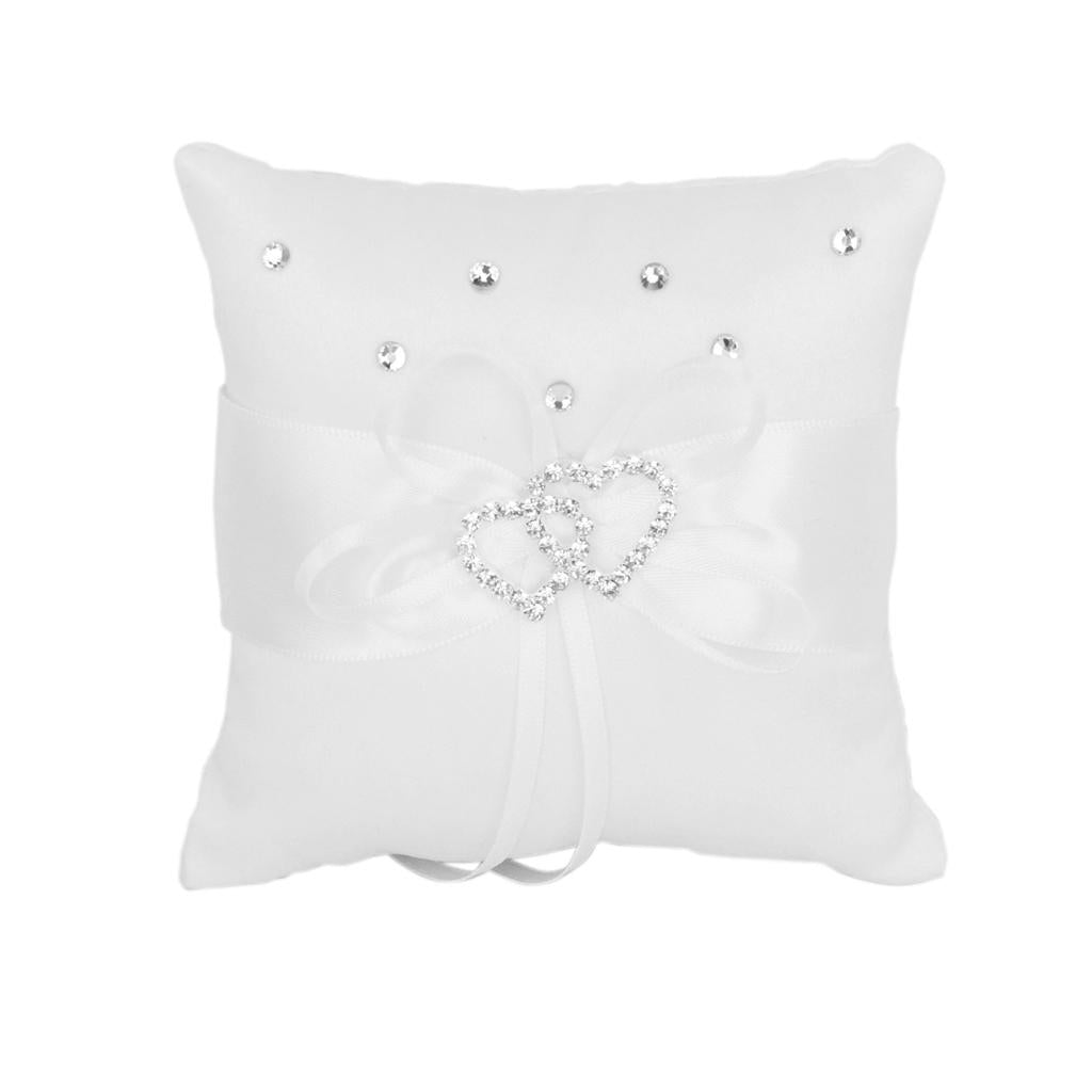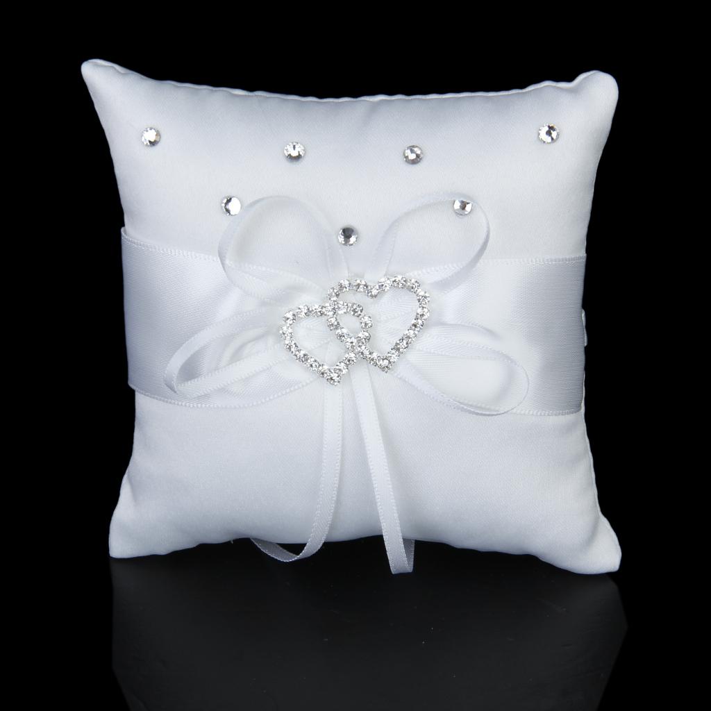 Satin Pocket Ring Pillow Double Heart Crystal Rhinestone Cushion Wedding Party Anniversary Supplies White