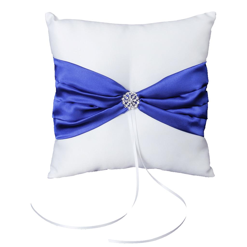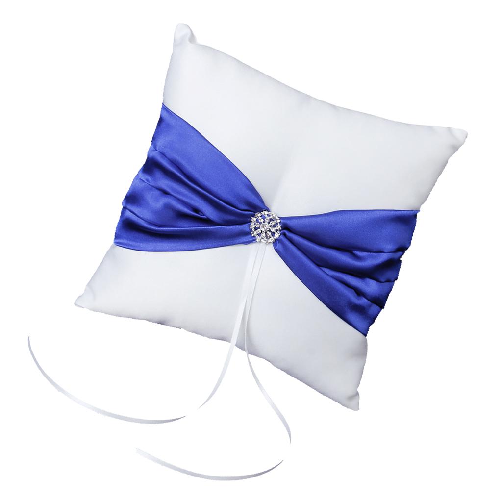 • White ring pillow decorated with royal blue ribbon and shiny diamante buckle to tie the ring