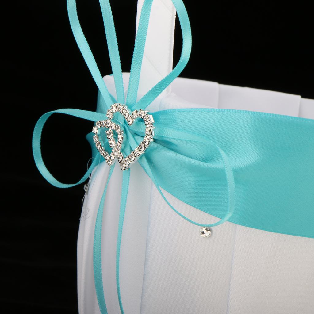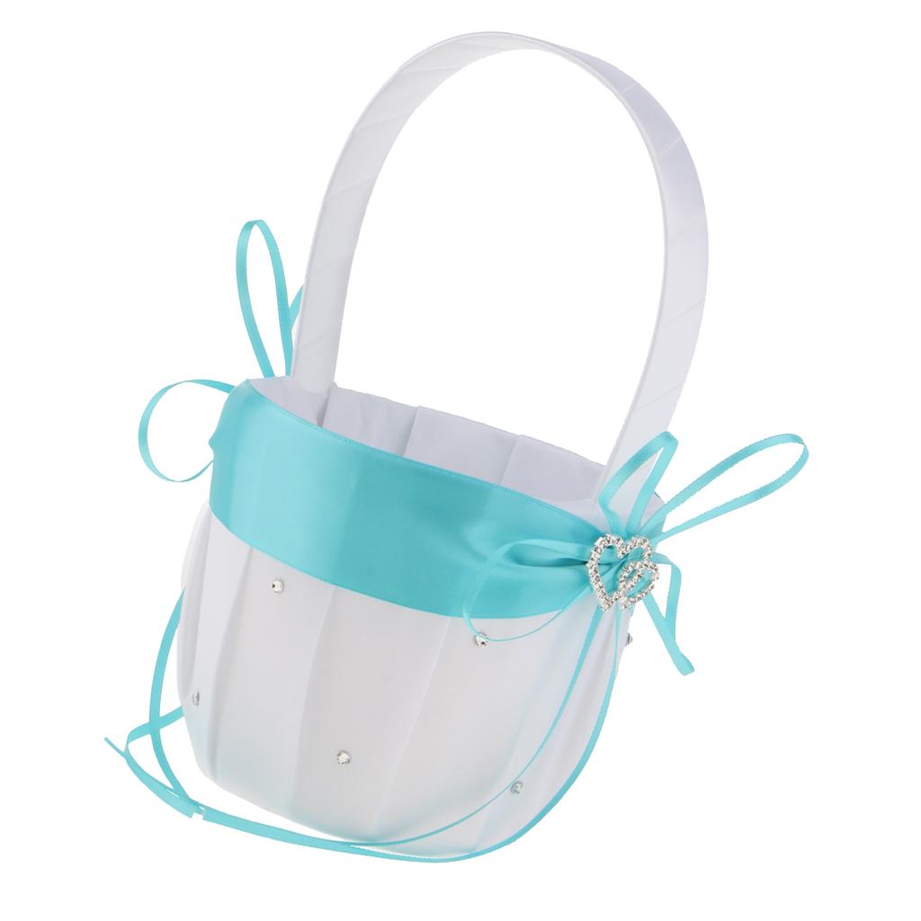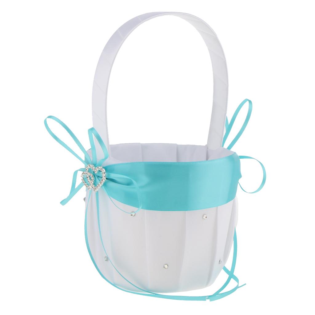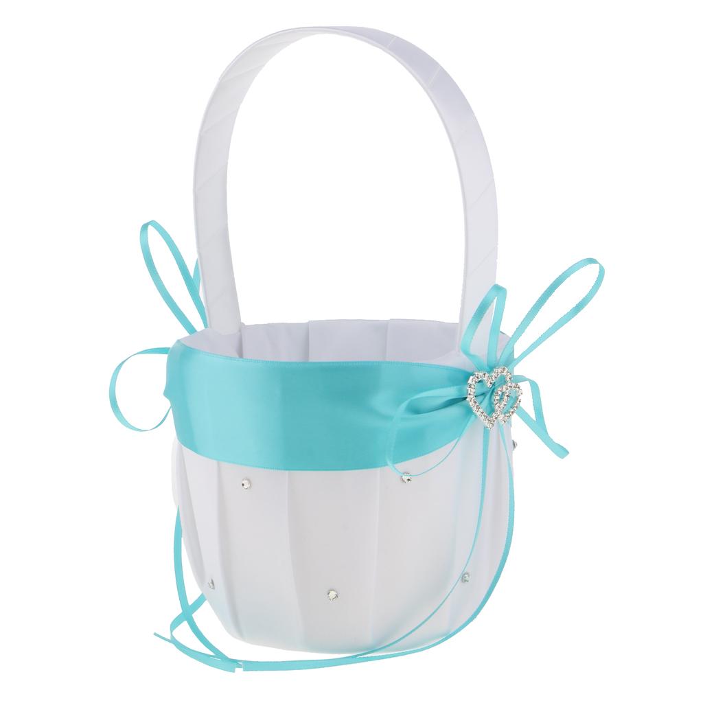 Satin Wedding Flower Girl Basket Double Heart Rhinestone Decor Light Blue