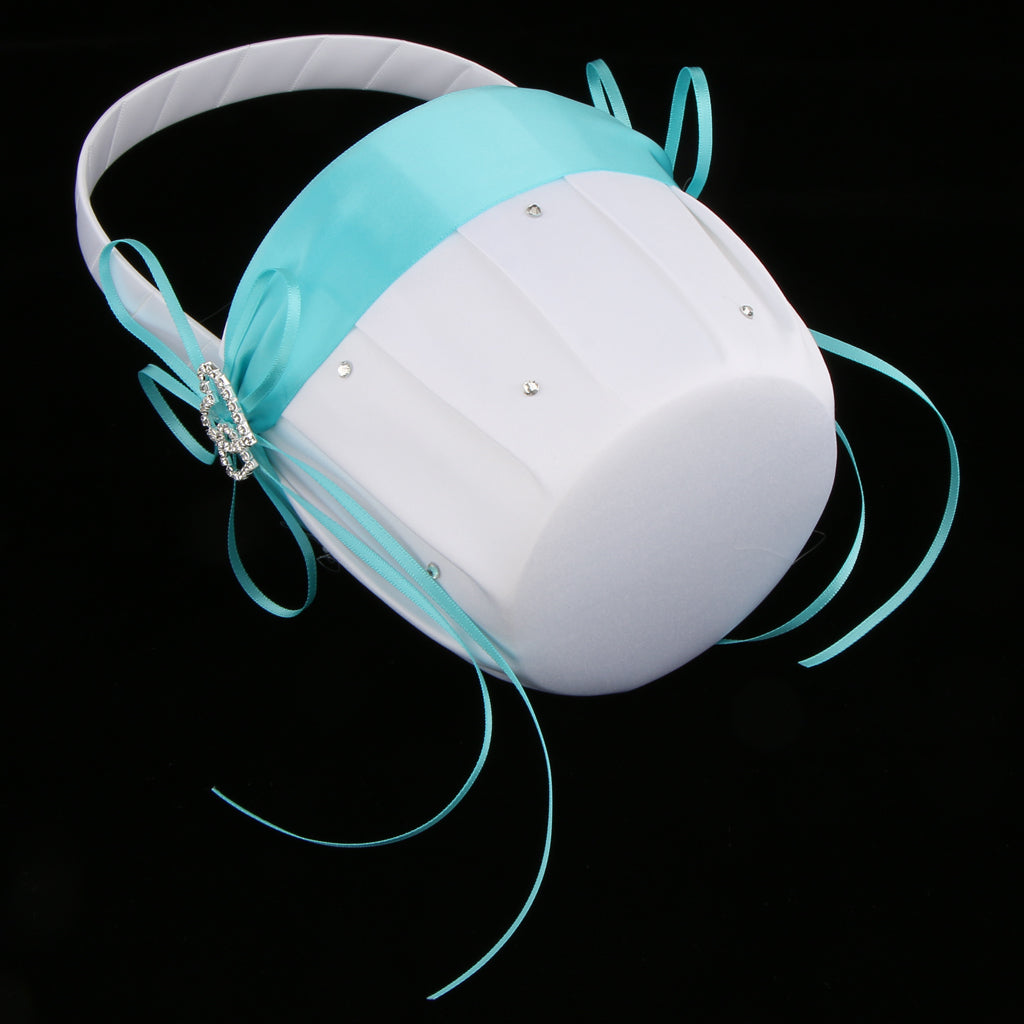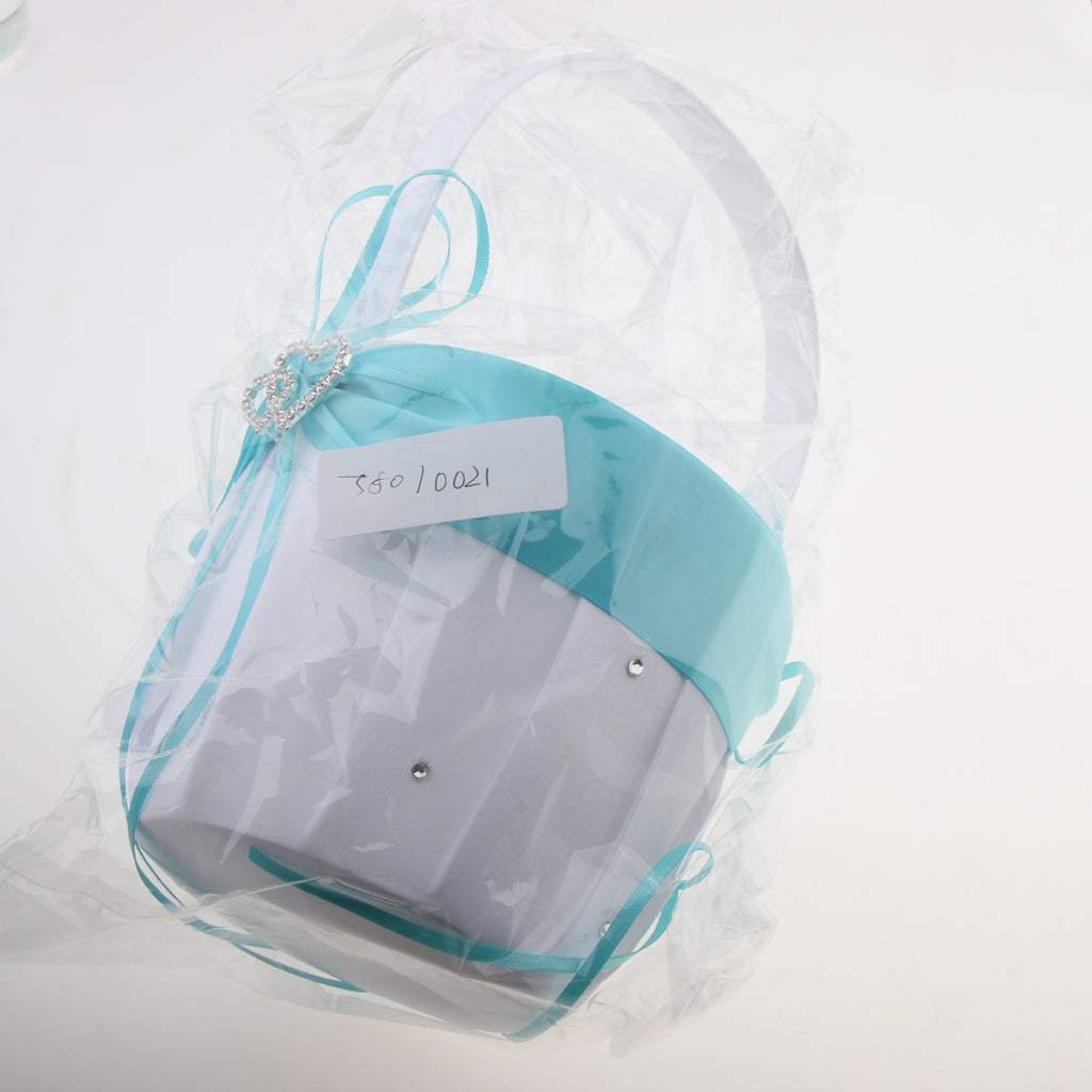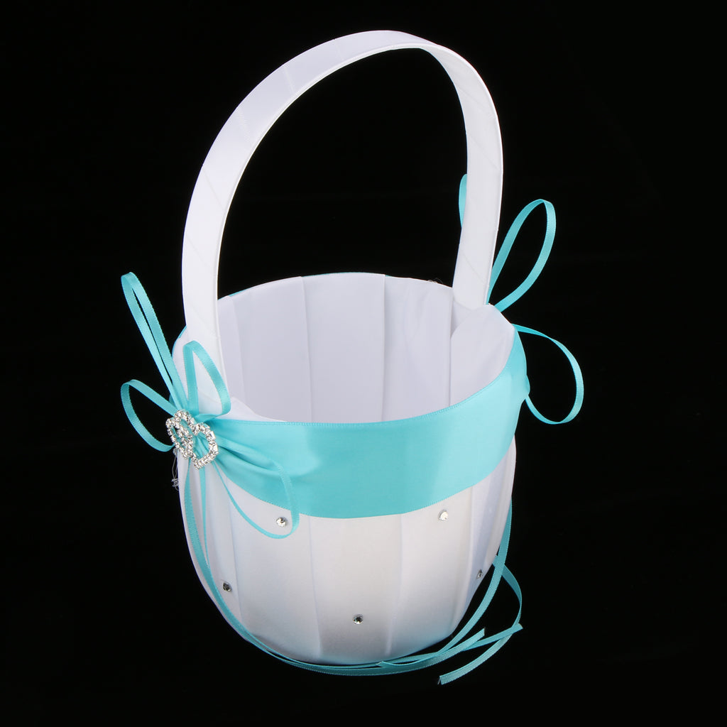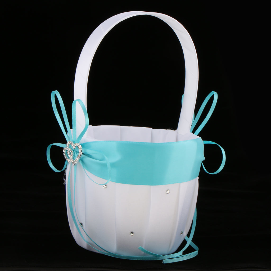 Satin Wedding Flower Girl Basket Double Heart Rhinestone Decor Light Blue