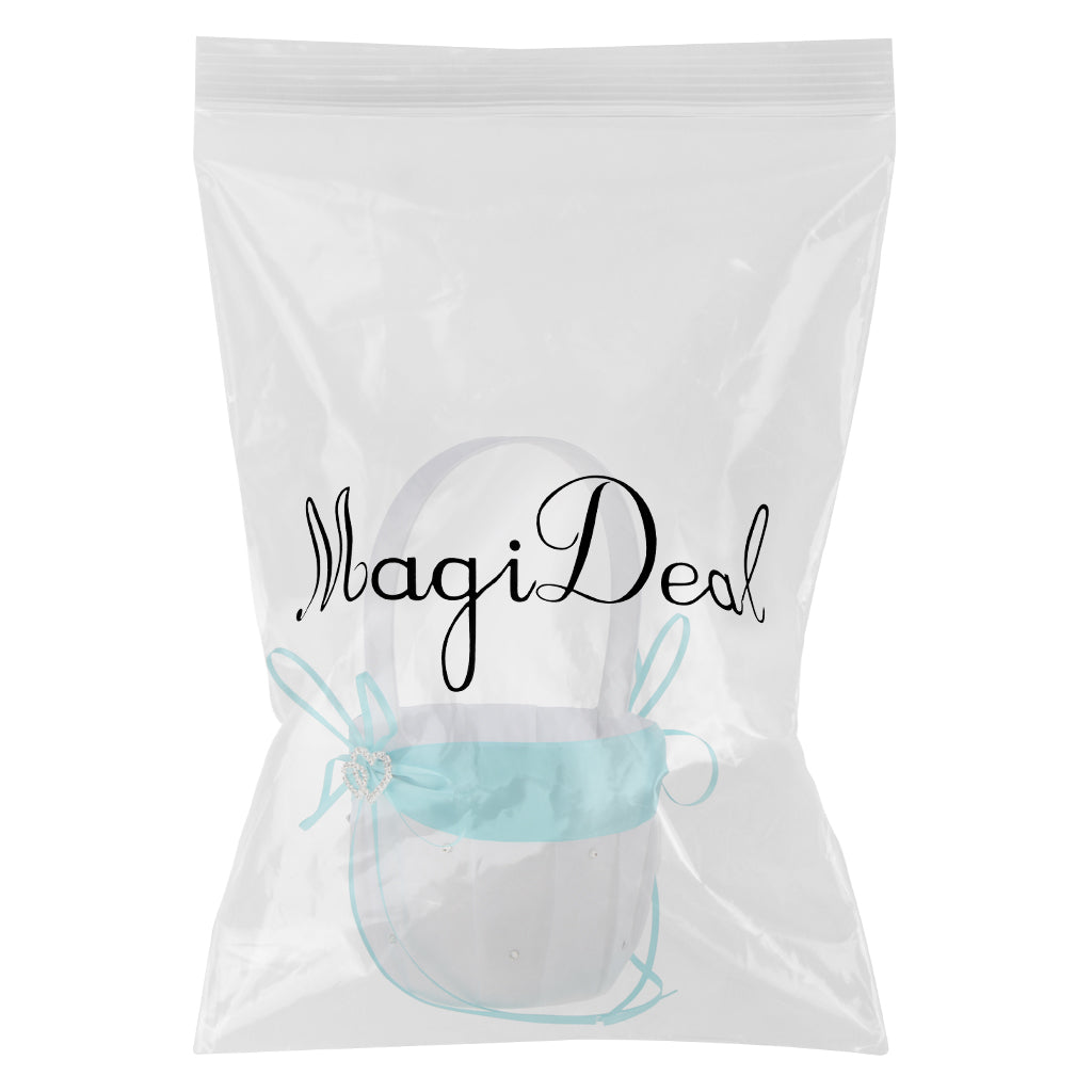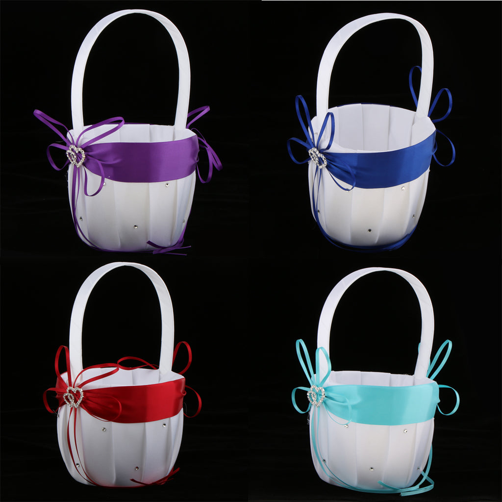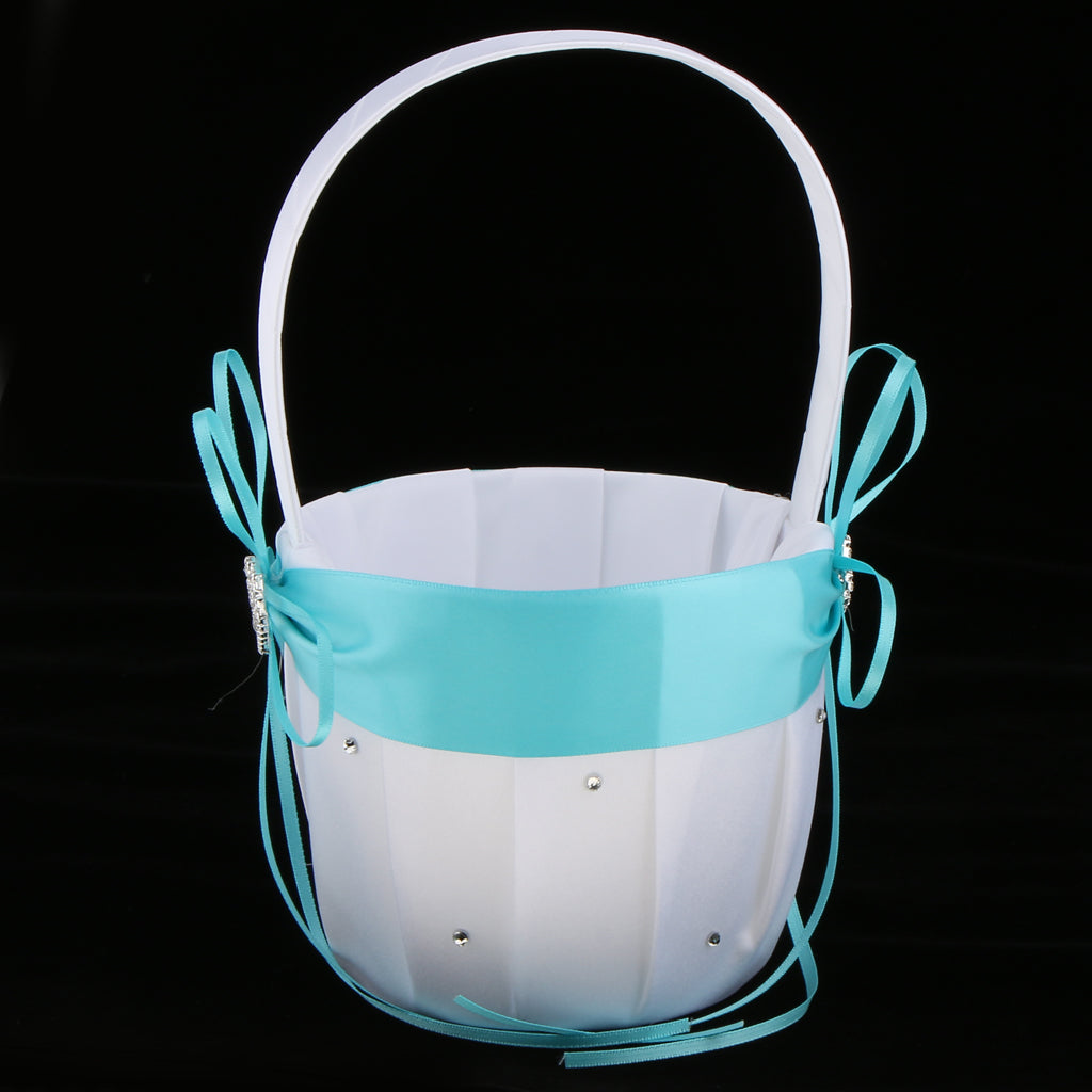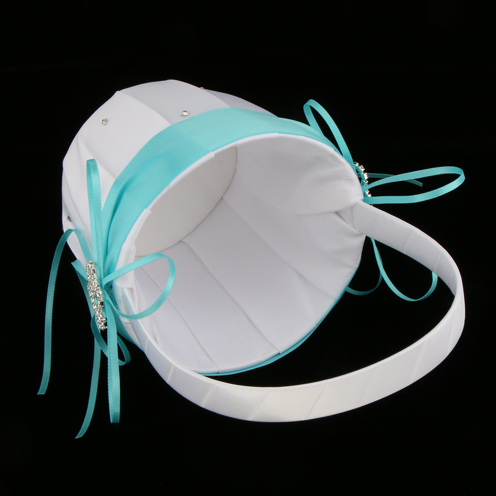 Satin Wedding Flower Girl Basket Double Heart Rhinestone Decor Light Blue