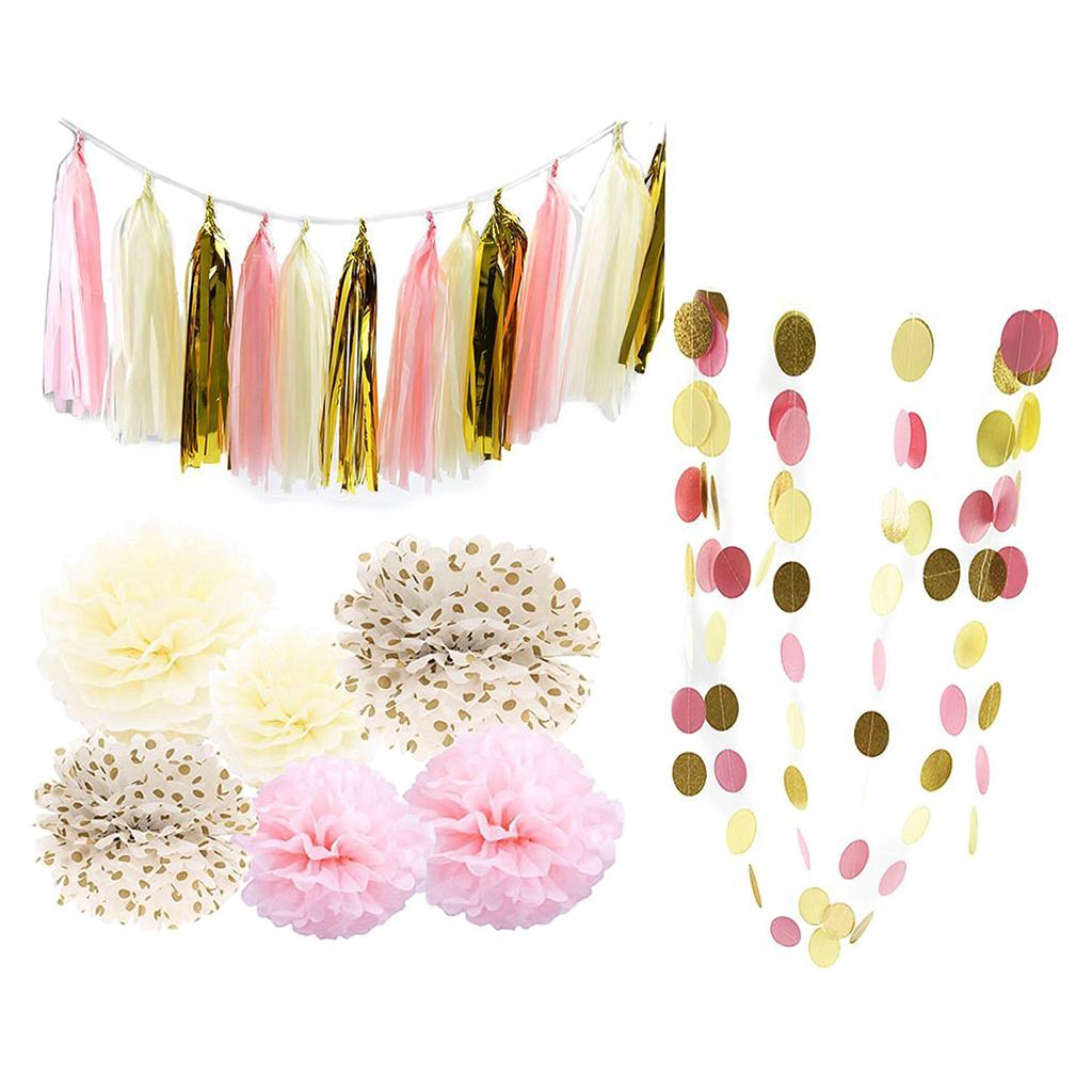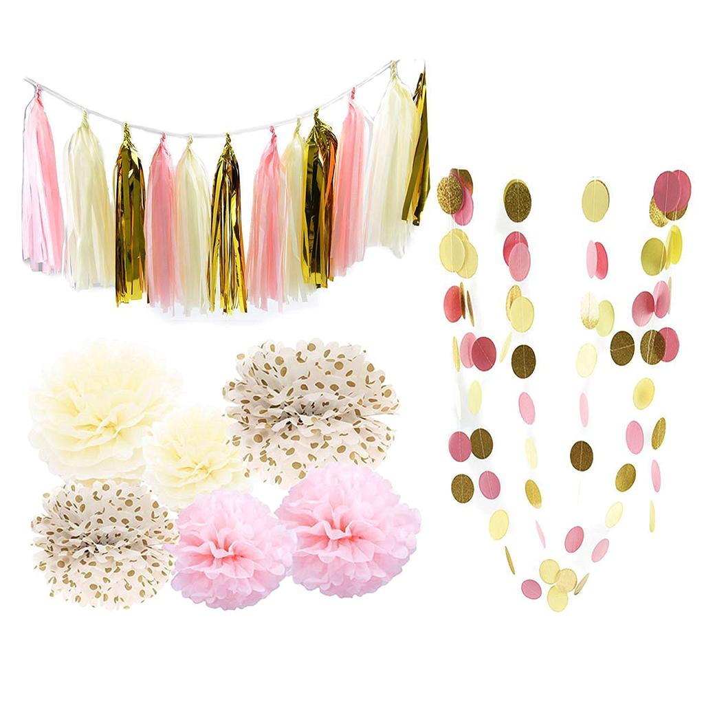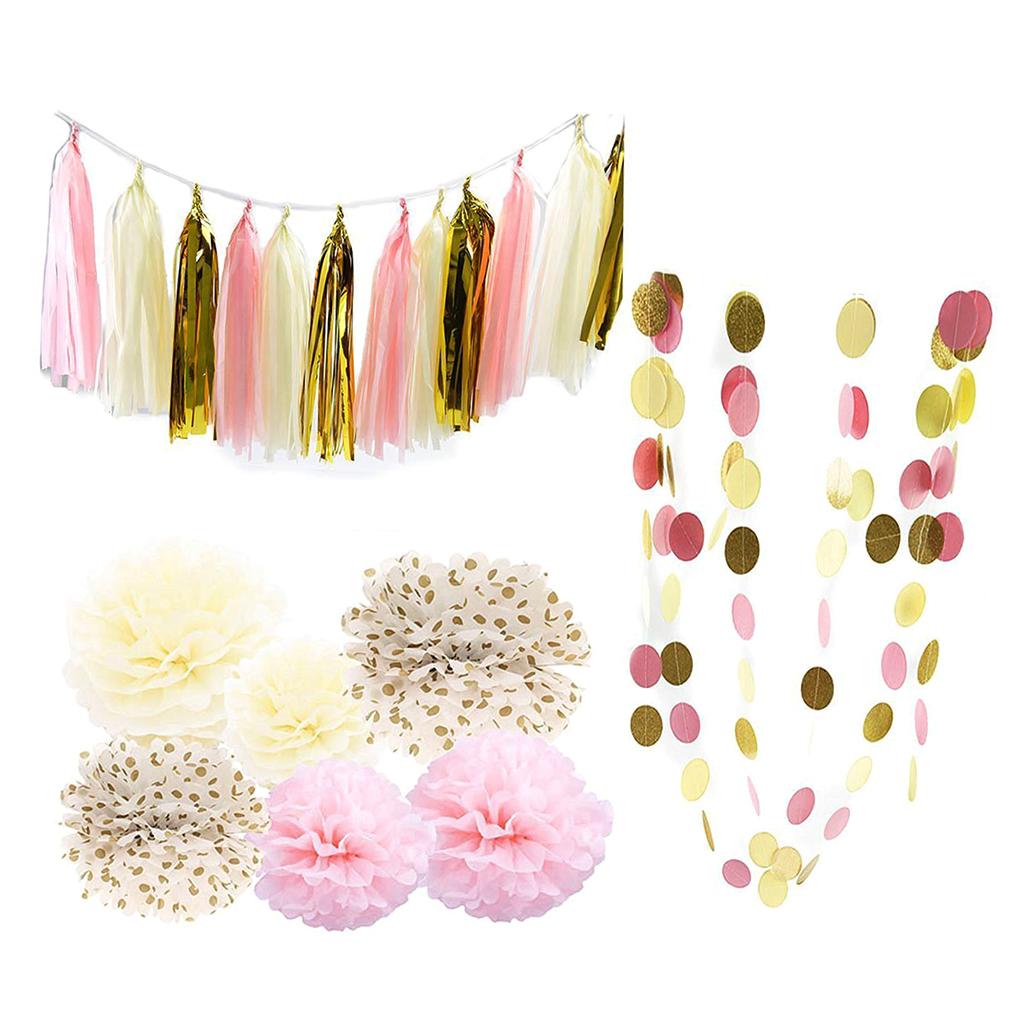 6 Pieces Tissue paper flowers have 2 sizes:3x12";3x10",and 12 Pieces tassel bunting,including 2 pieces polka dot paper garland