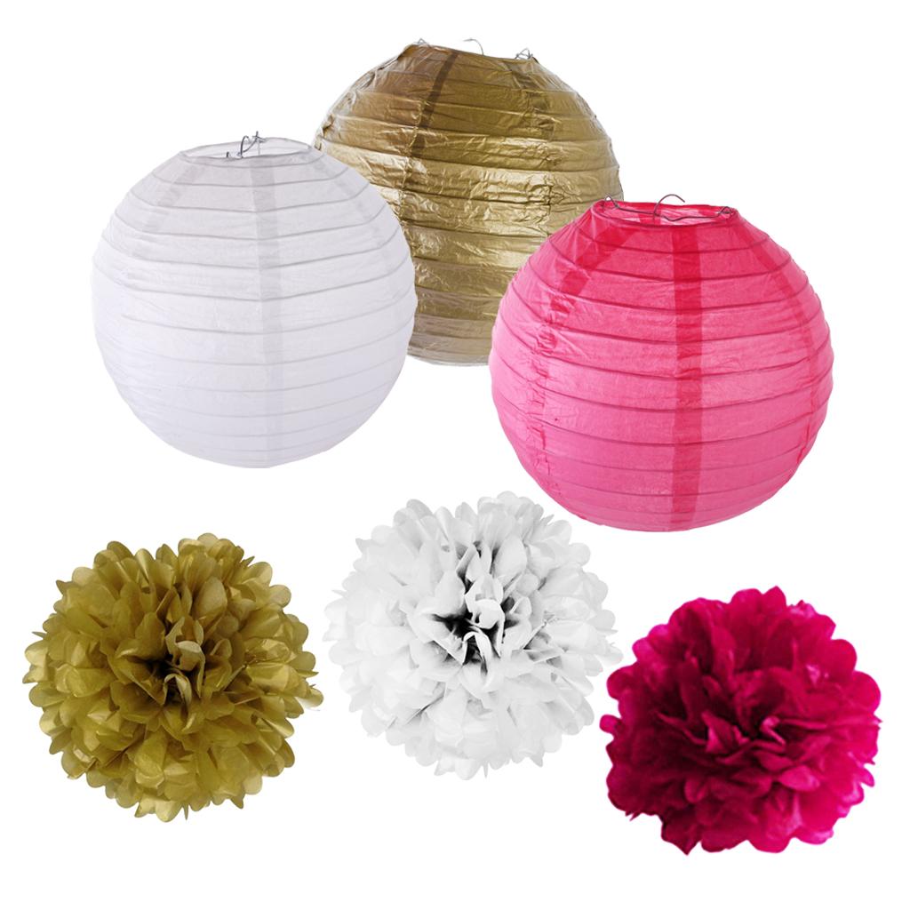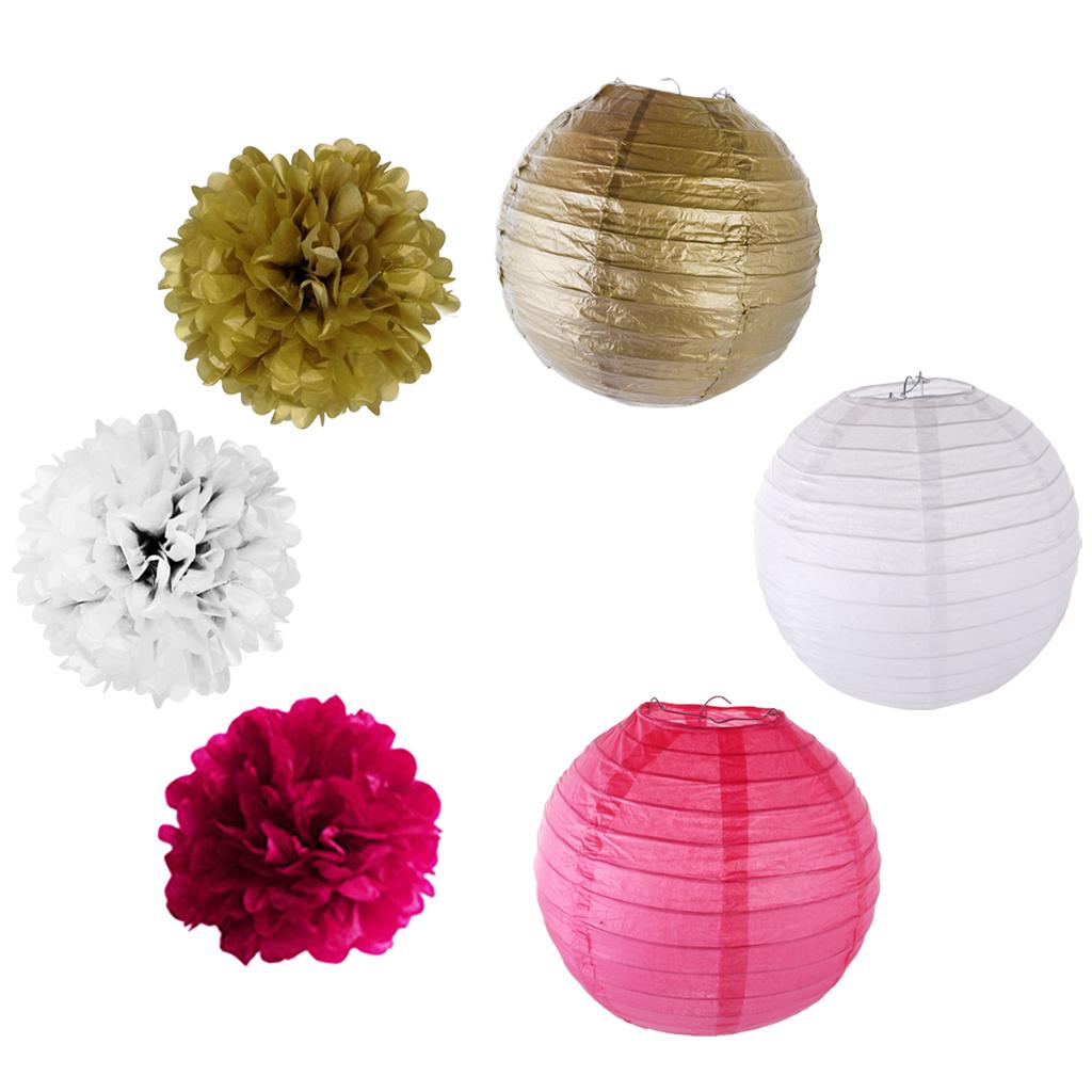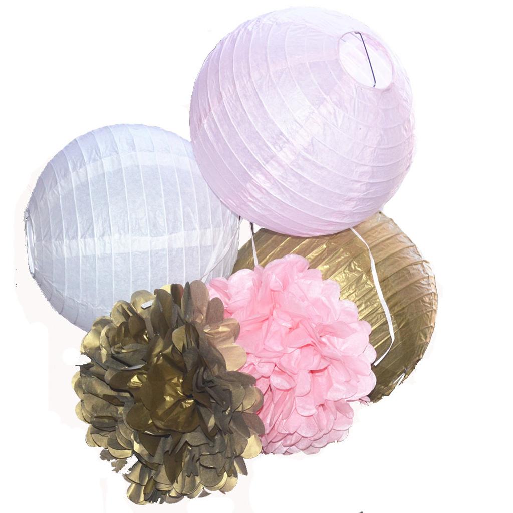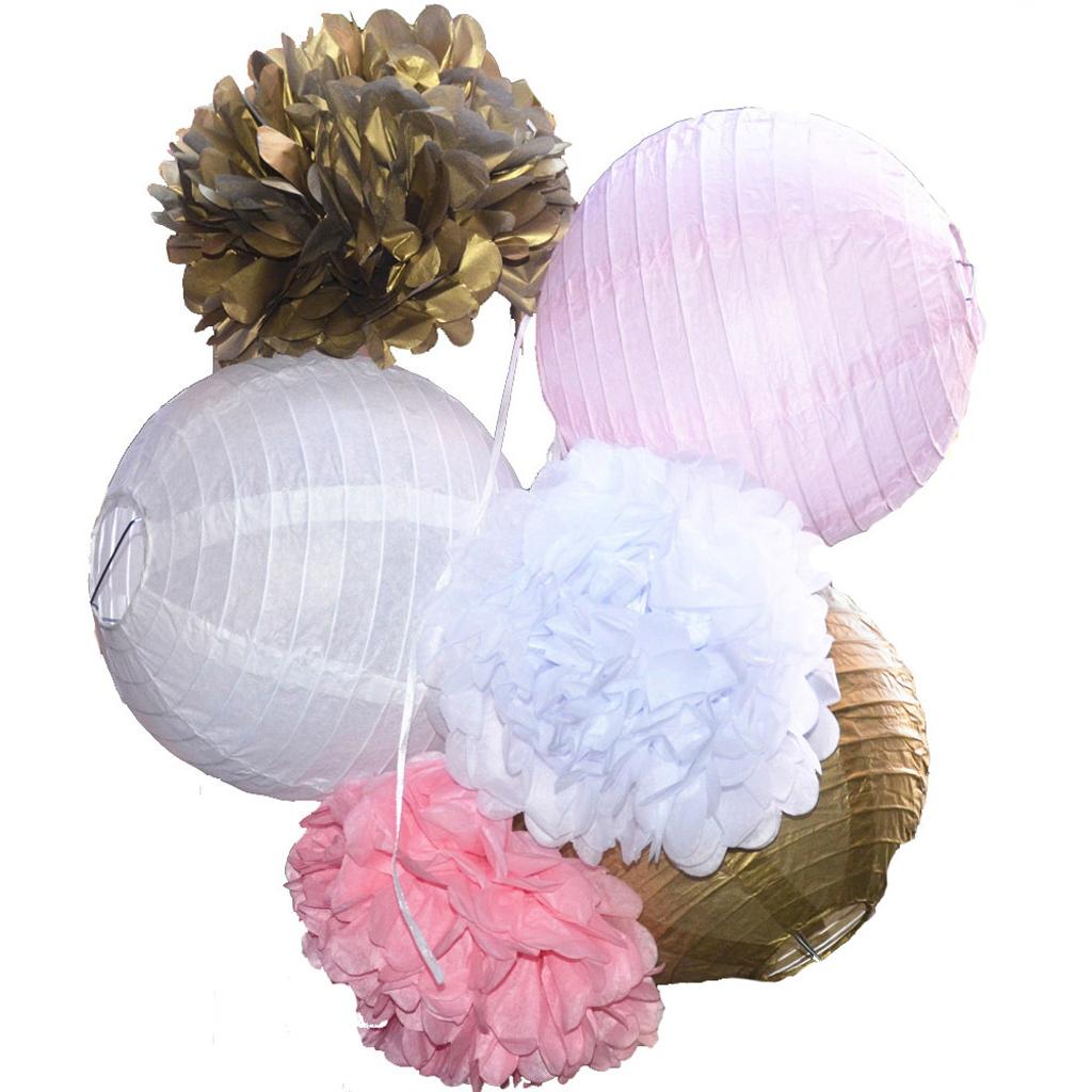 Set Of Mixed Style Paper Pom Poms With Lanterns Wedding Birthday Party Baby Shower Party Decor Rose White Gold