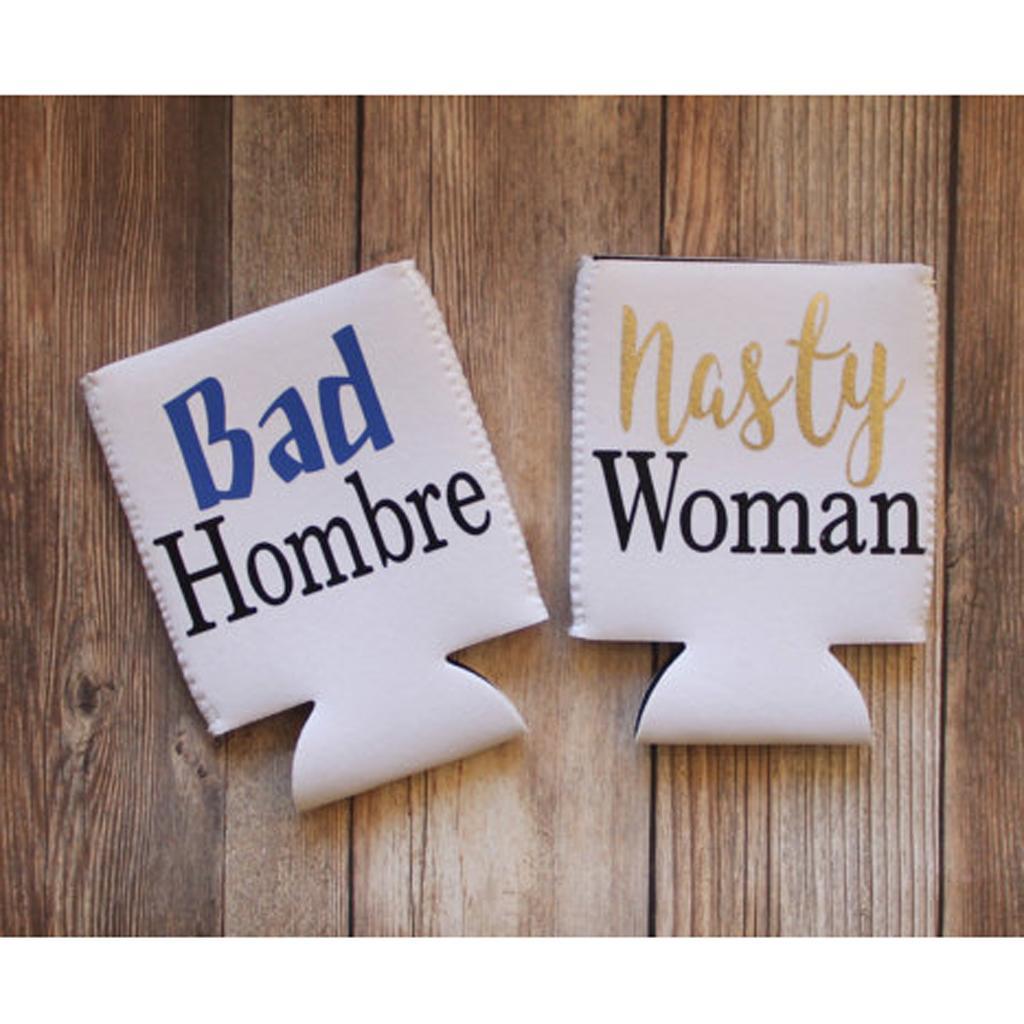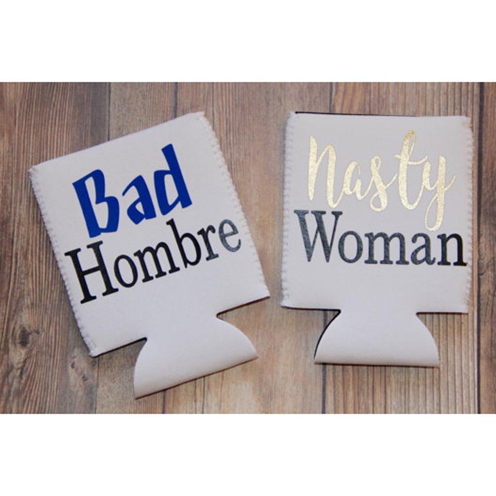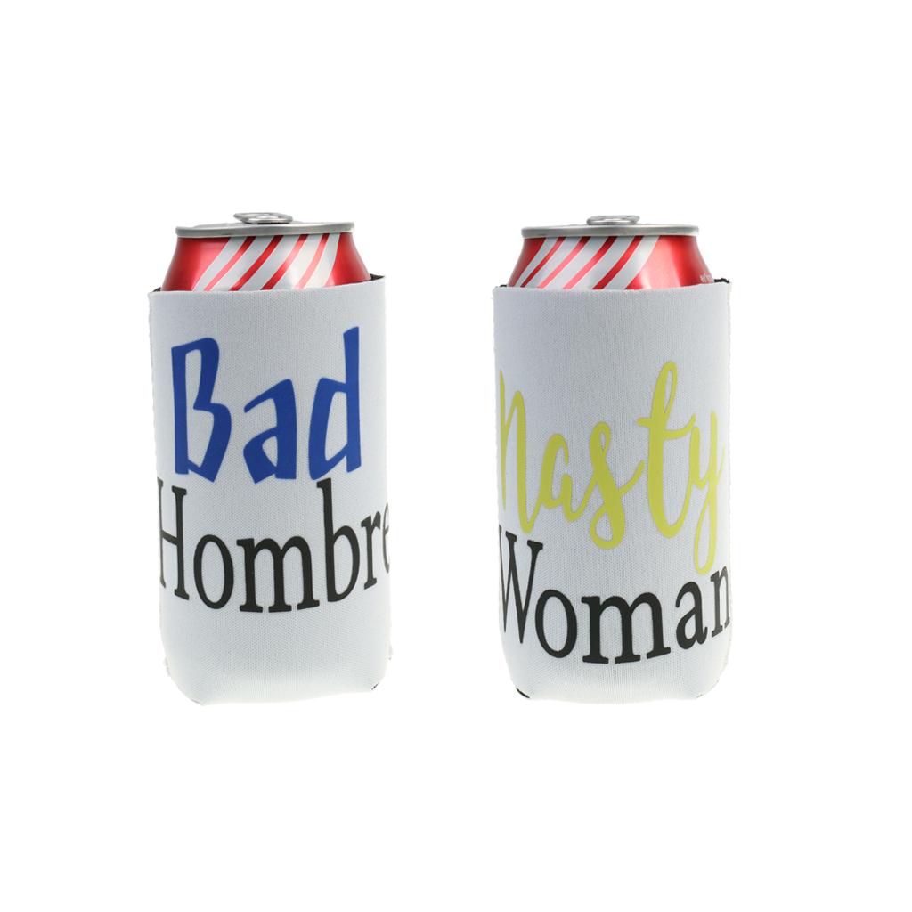 Novelty beer soda can sleeves with Bad Hombre and nasty Woman printed.