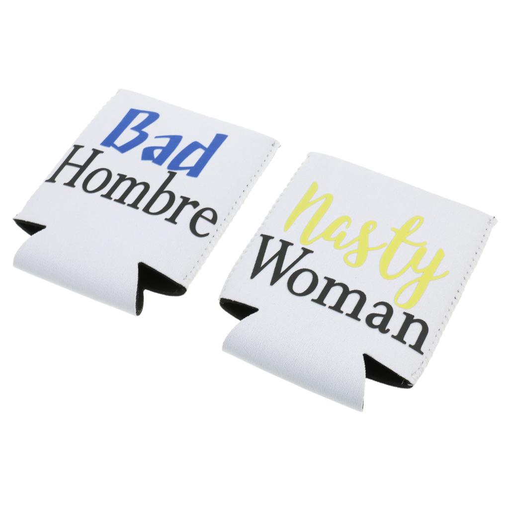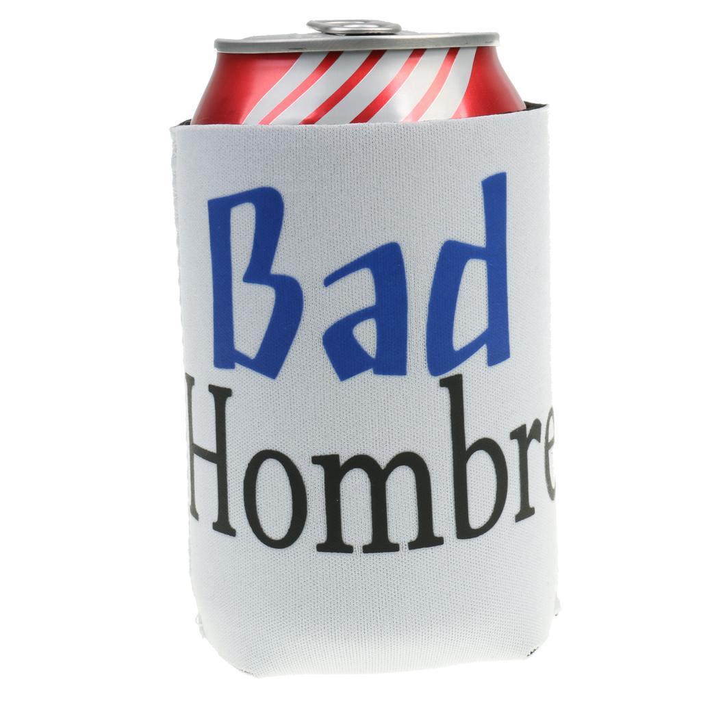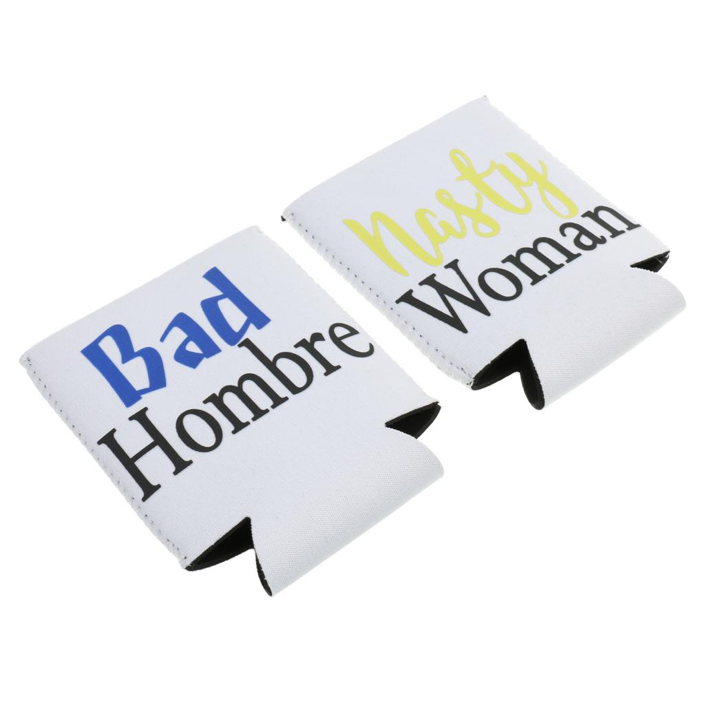 Novelty beer soda can sleeves with Bad Hombre and nasty Woman printed.