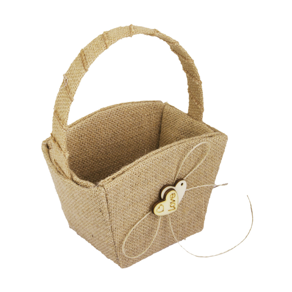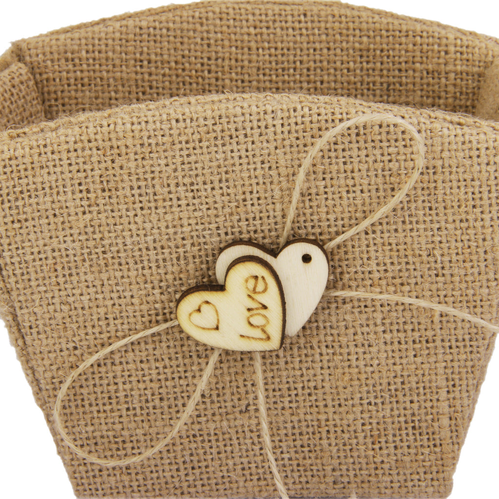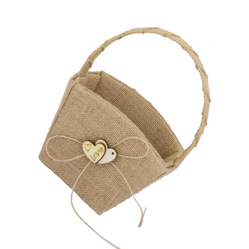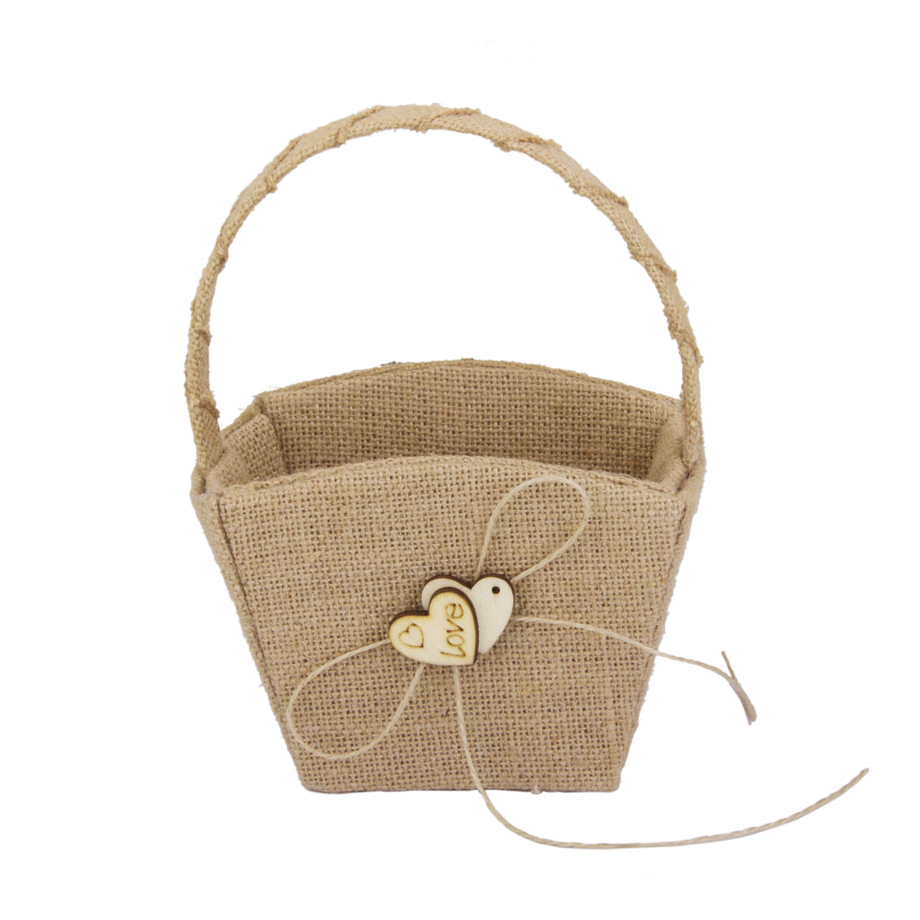 The body of the basket is covered in burlap and accented by two wooden love heart and burlap rope bowknot