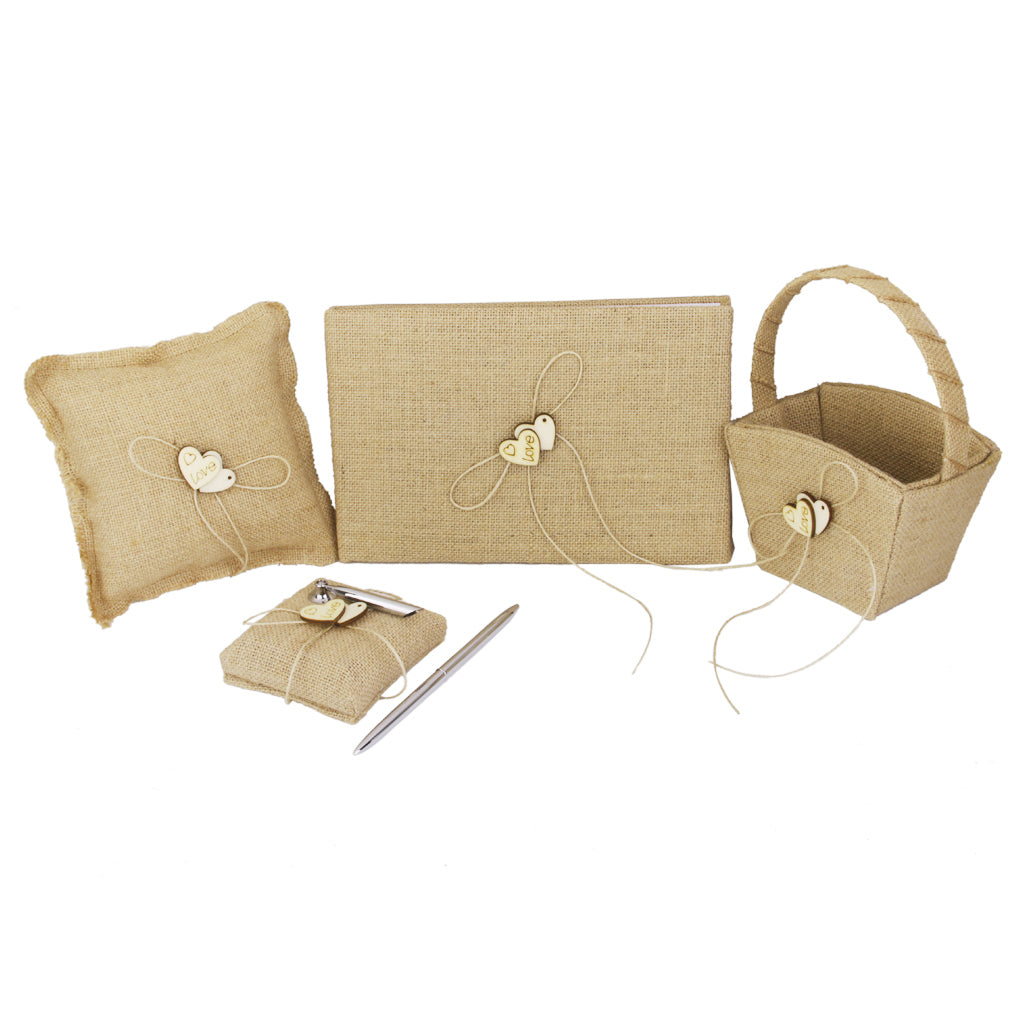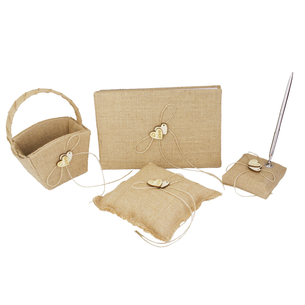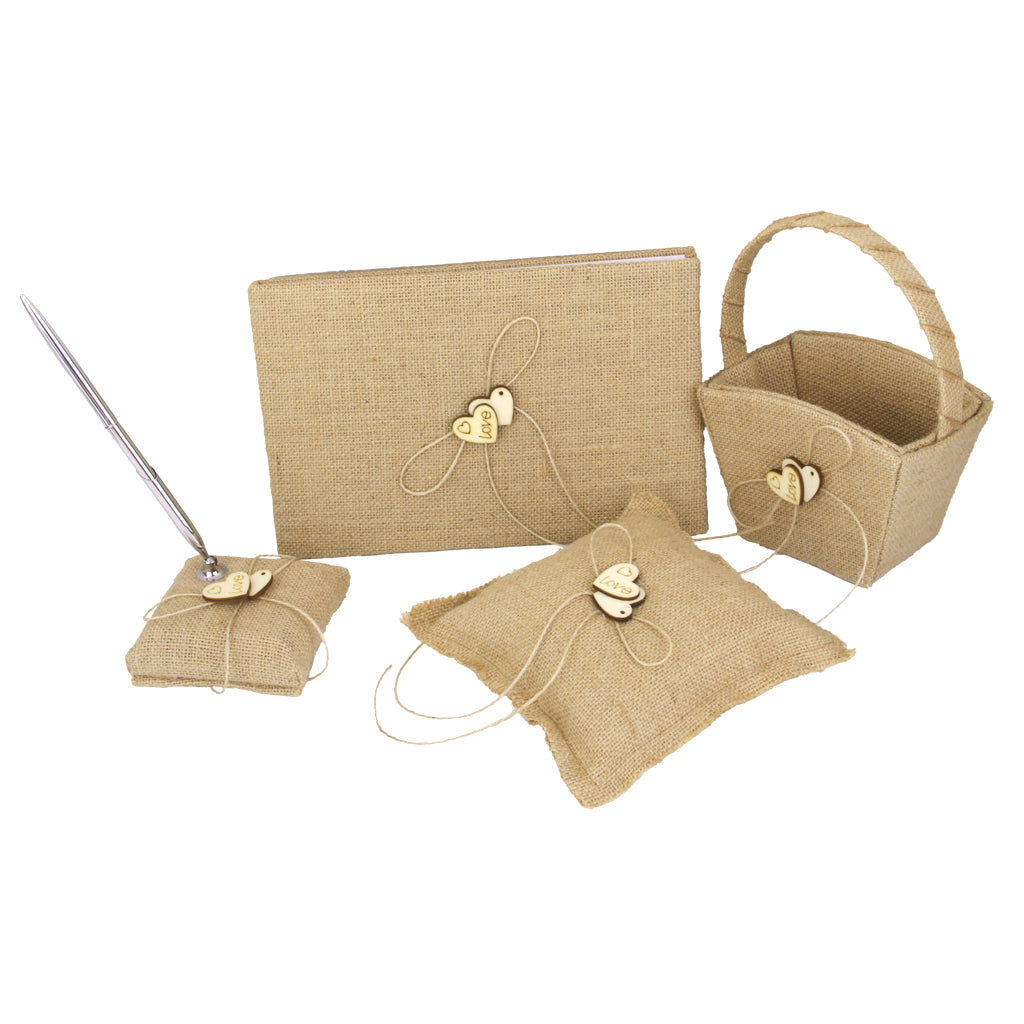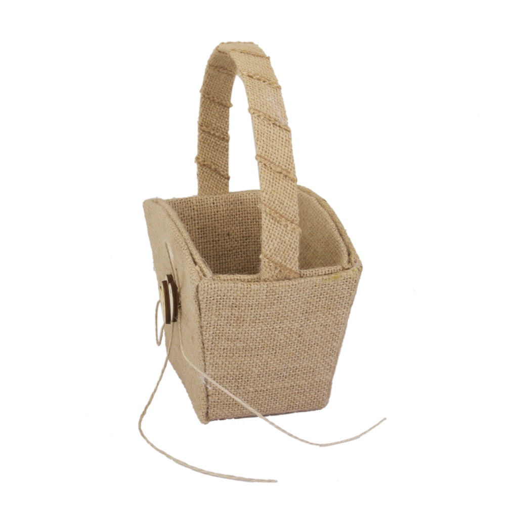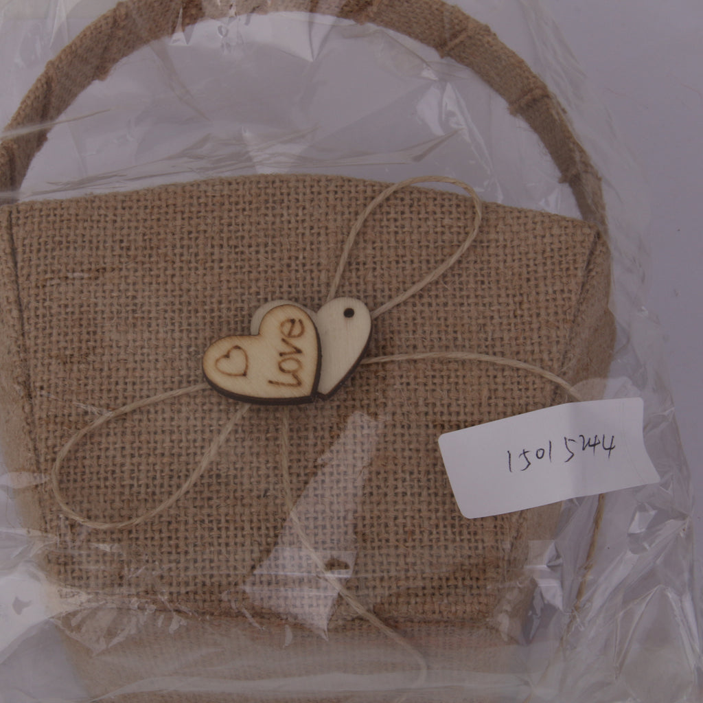 The body of the basket is covered in burlap and accented by two wooden love heart and burlap rope bowknot