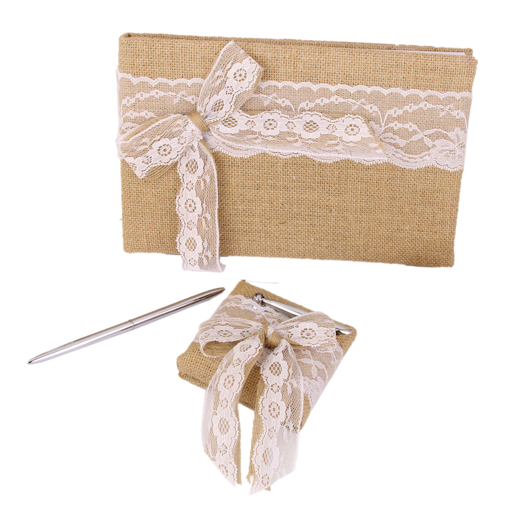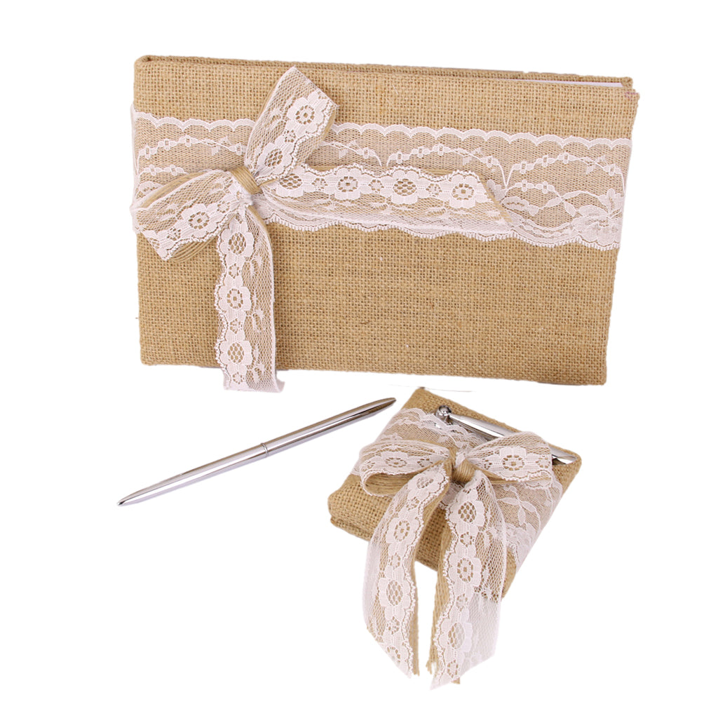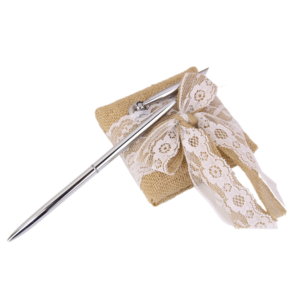 Vintage Wedding Burlap Hessian Lace Bowknot Guest Book Pen Set