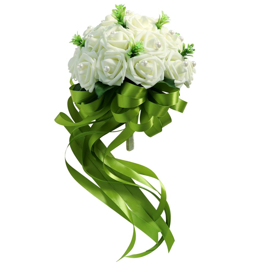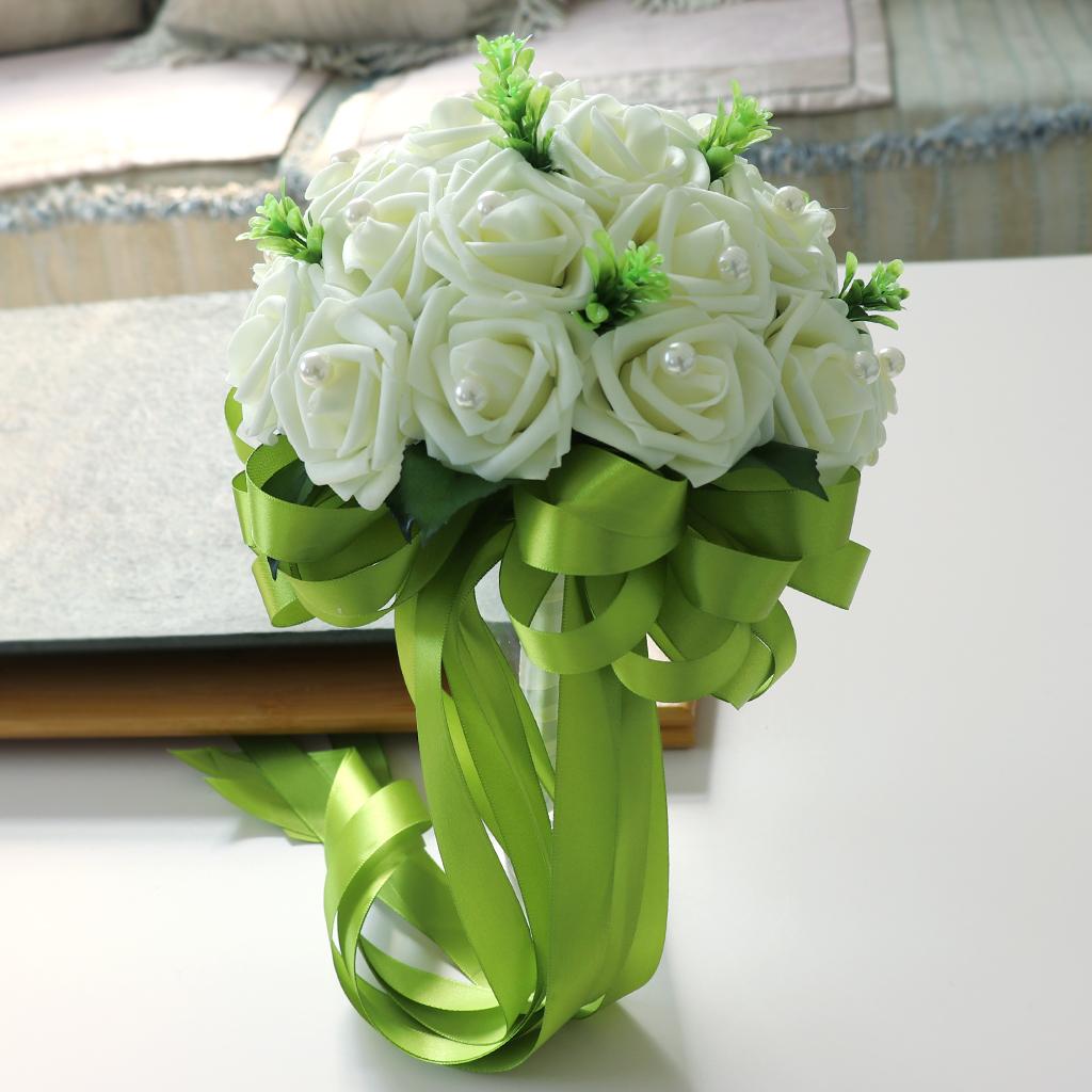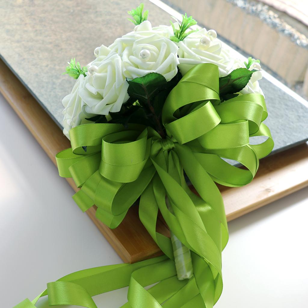 The bridal holding flower is decorated with green silk ribbons.