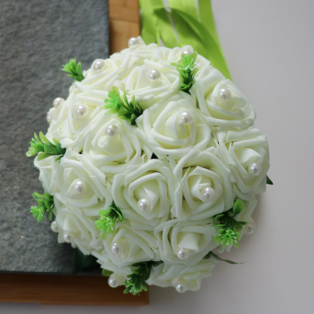 The rose bouquet is made of real-looking foam flower with faux pearls decoration.