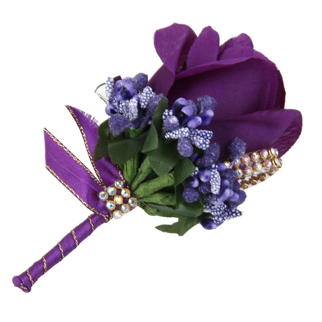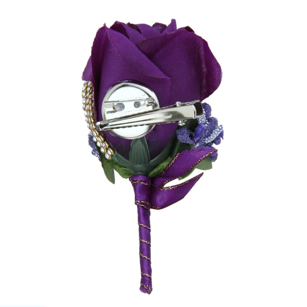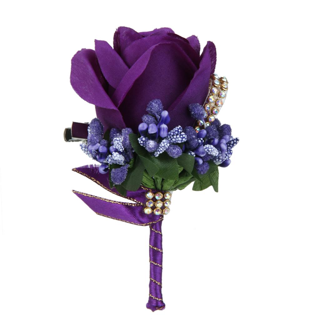 Wedding Bridal Men Groom Crystal Boutonniere Corsage Rose Silk Flower Purple