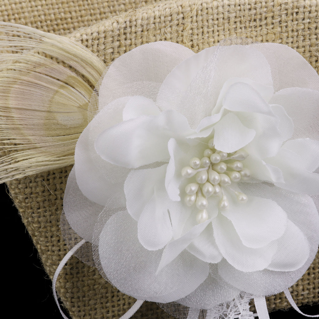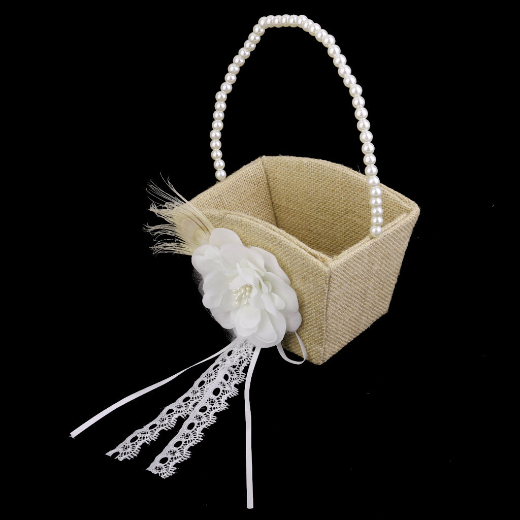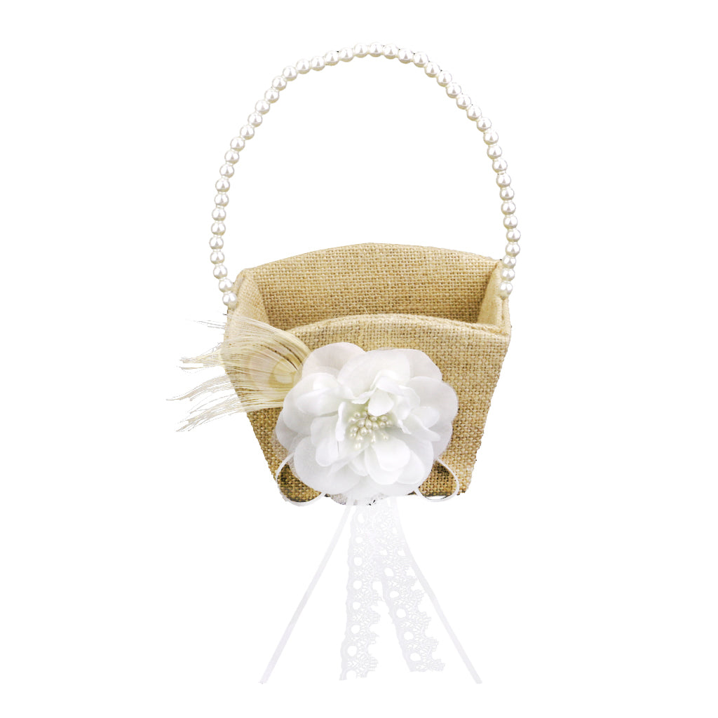 • The body of the basket is covered in burlap and accented by an ivory flower and natural peacock feather