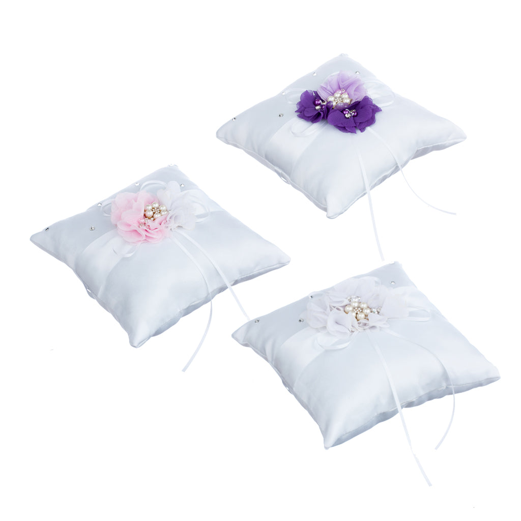 • Ring pillow decorated with satin ribbon and bud flower and crystal and faux pearl decor.