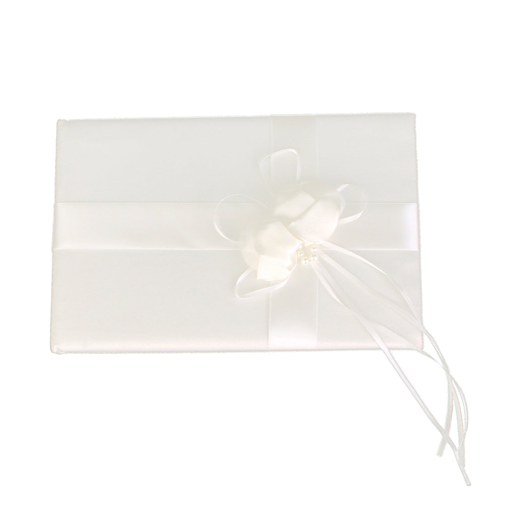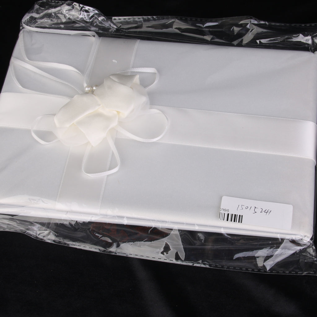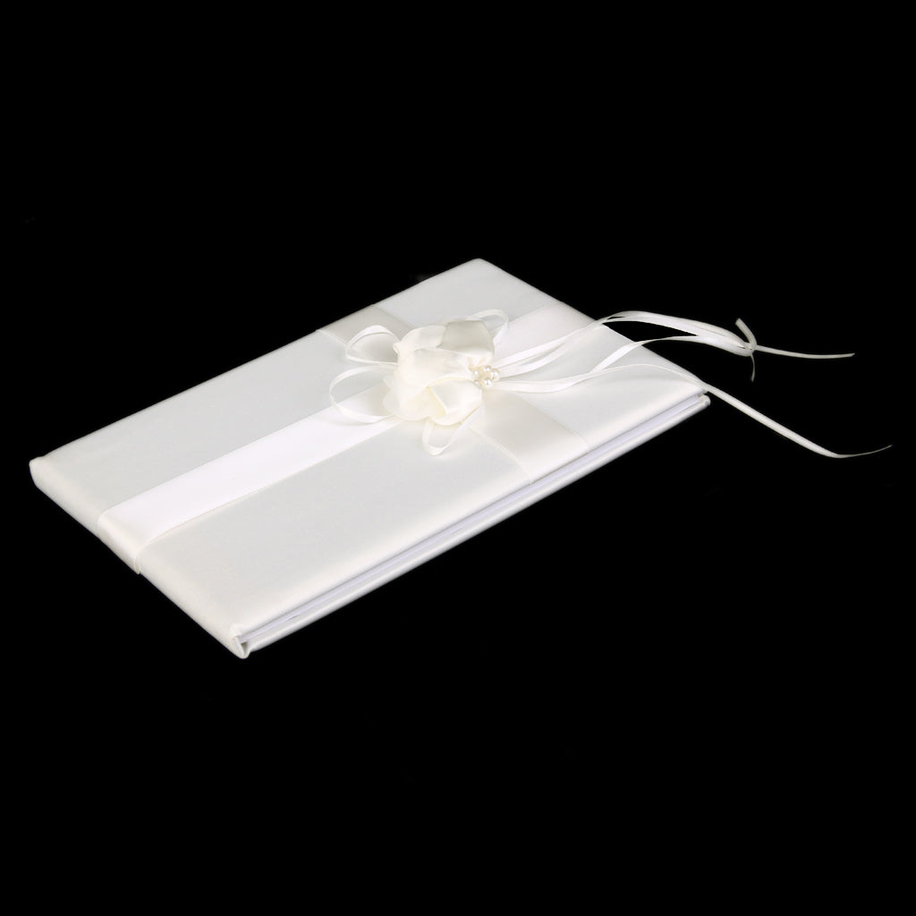Well boxed gorgeous Ivory satin coverd guest book with Satin Flower Faux Pearl Decoration and Ivory ribbon.