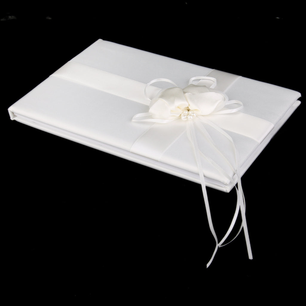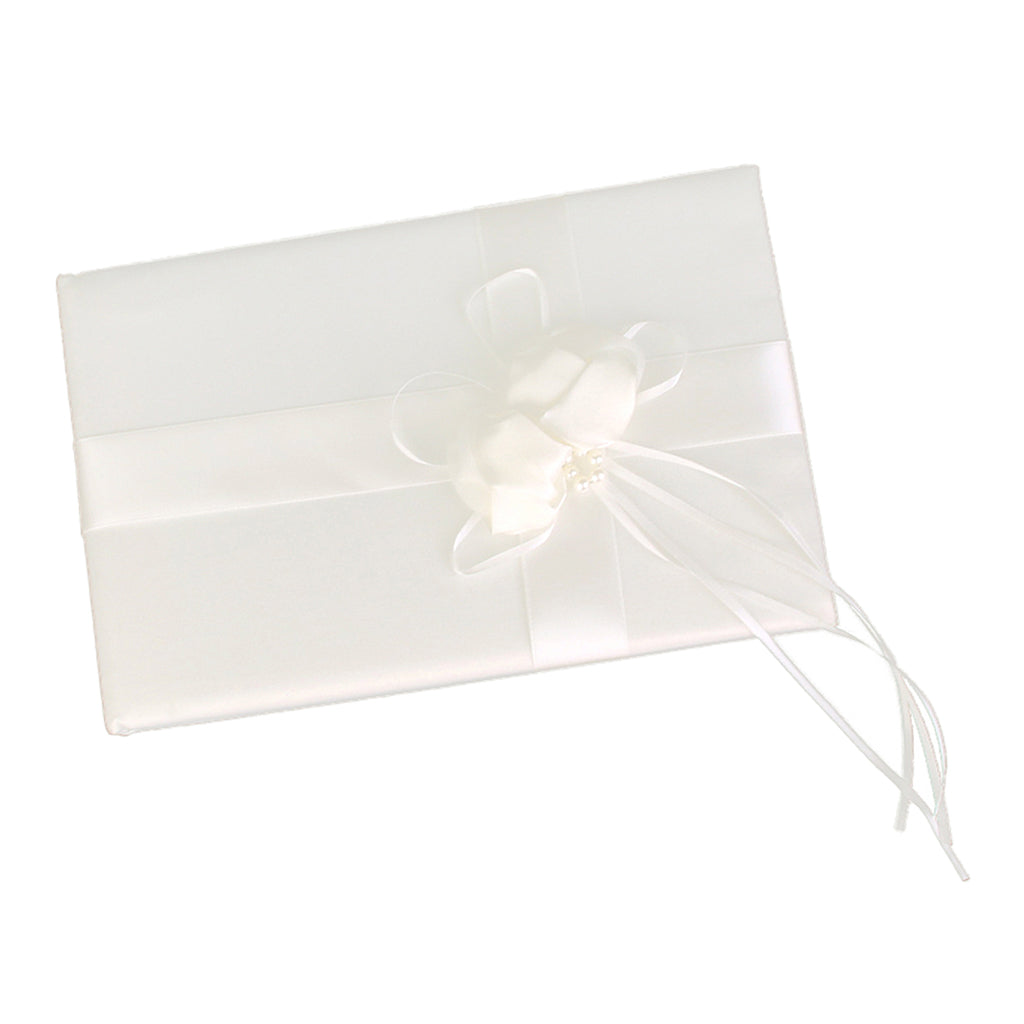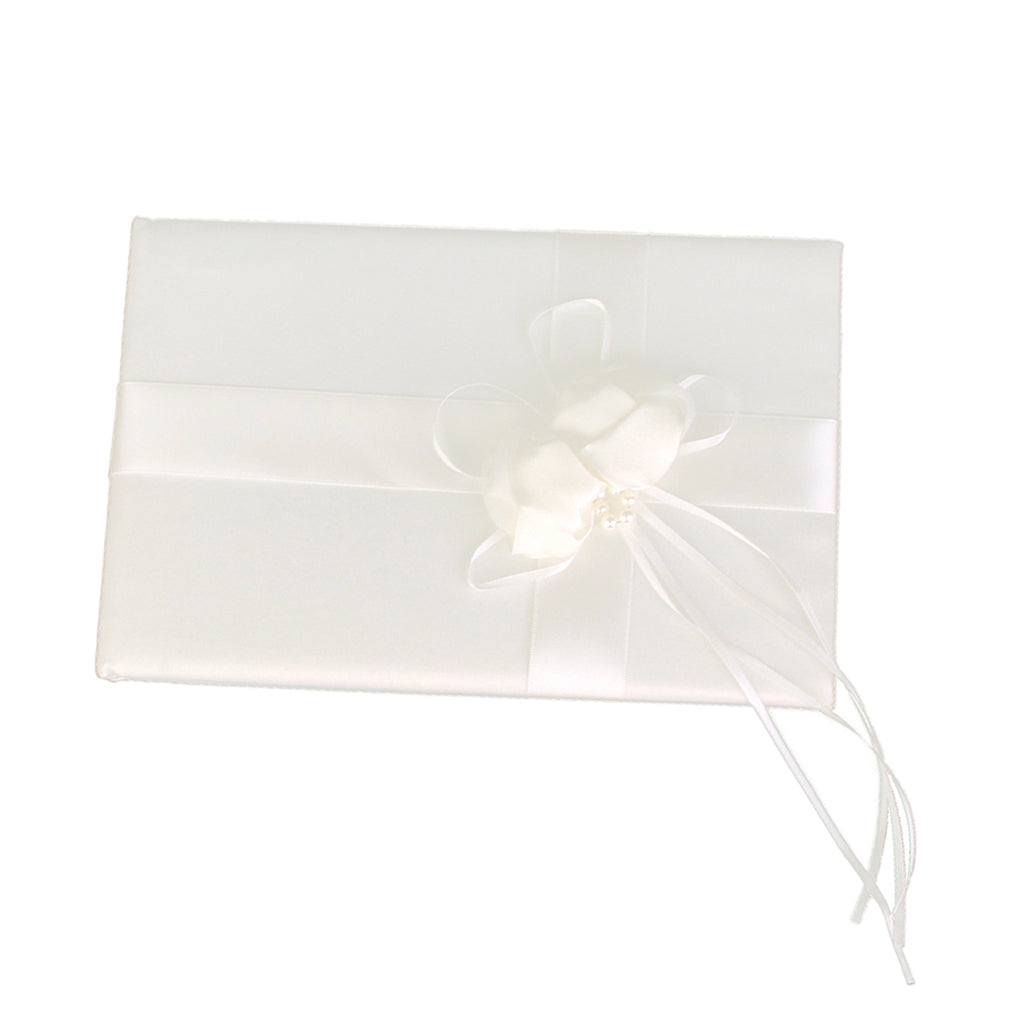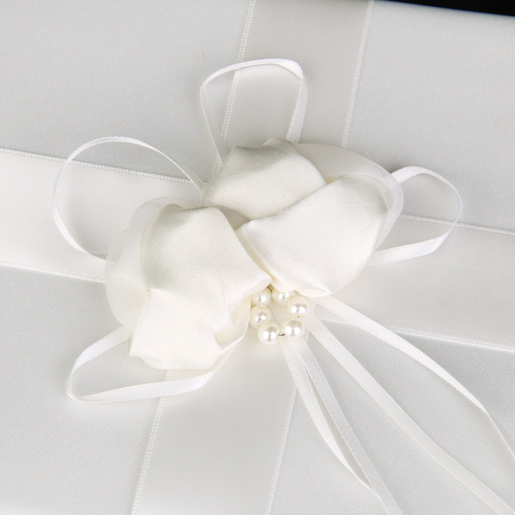 Well boxed gorgeous Ivory satin coverd guest book with Satin Flower Faux Pearl Decoration and Ivory ribbon.