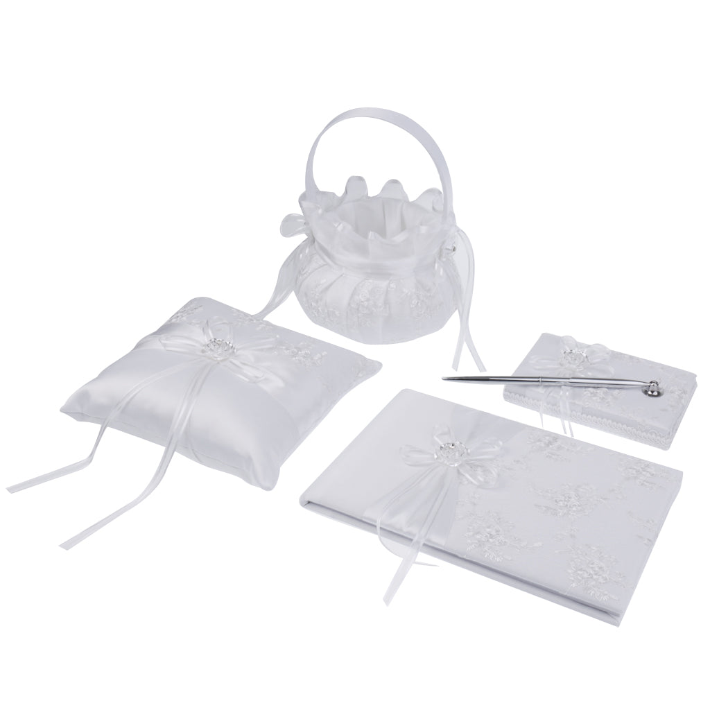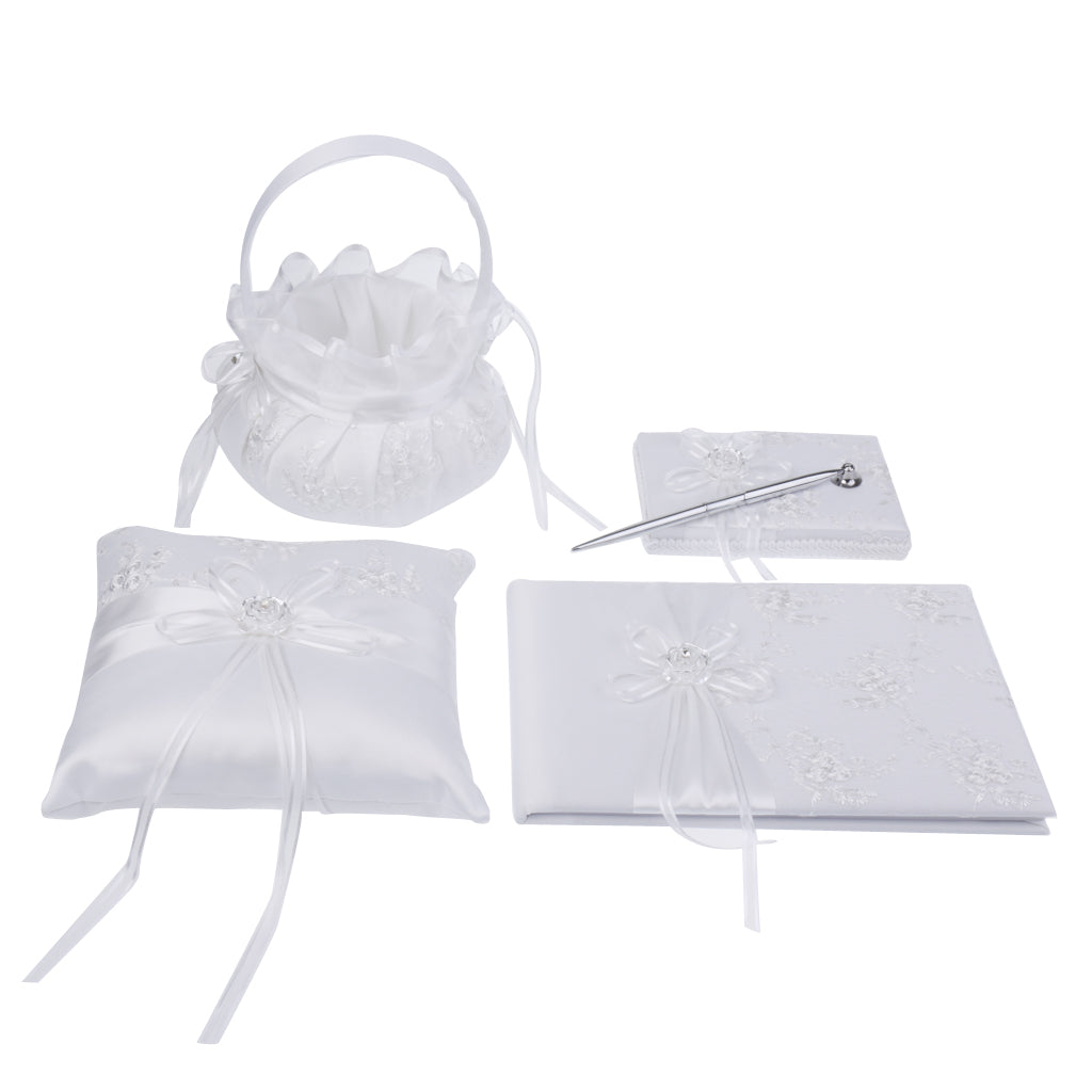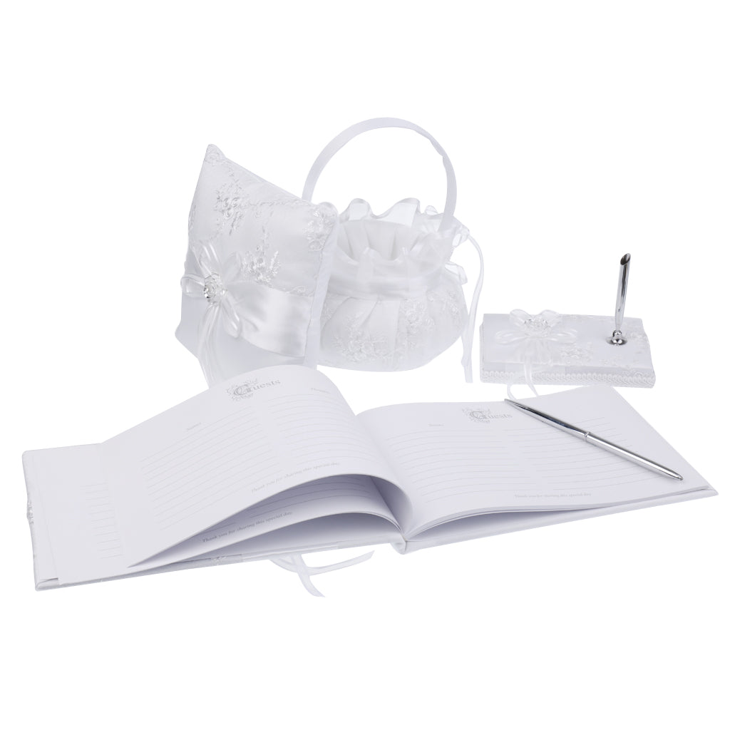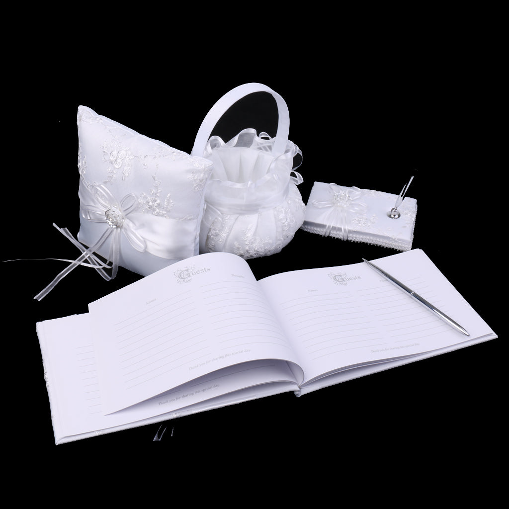Including guest book,signing pen,pen stand,ring pillow,flower basket.