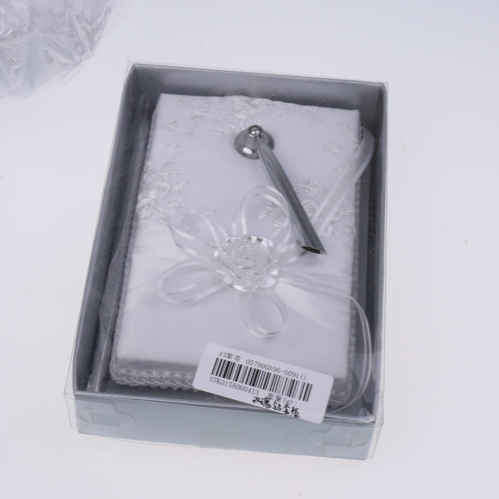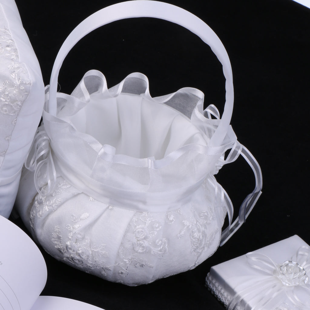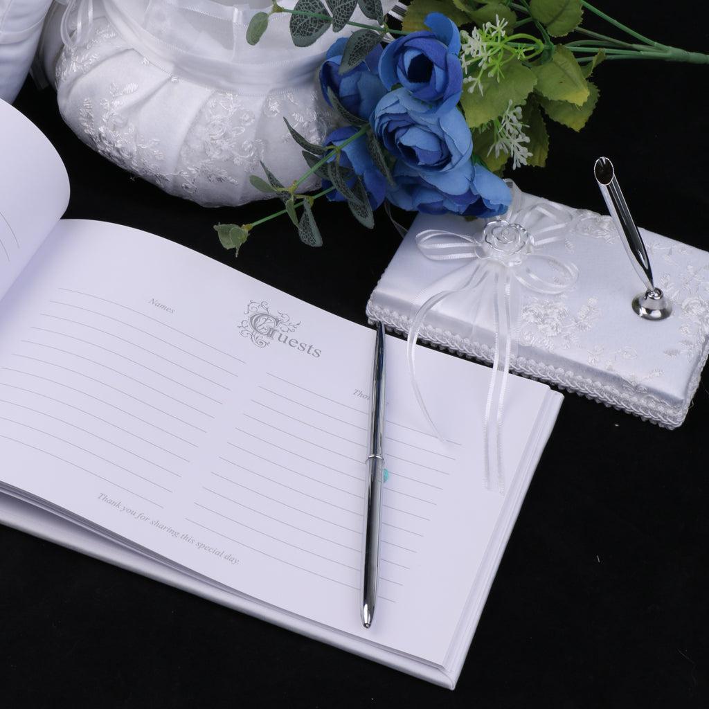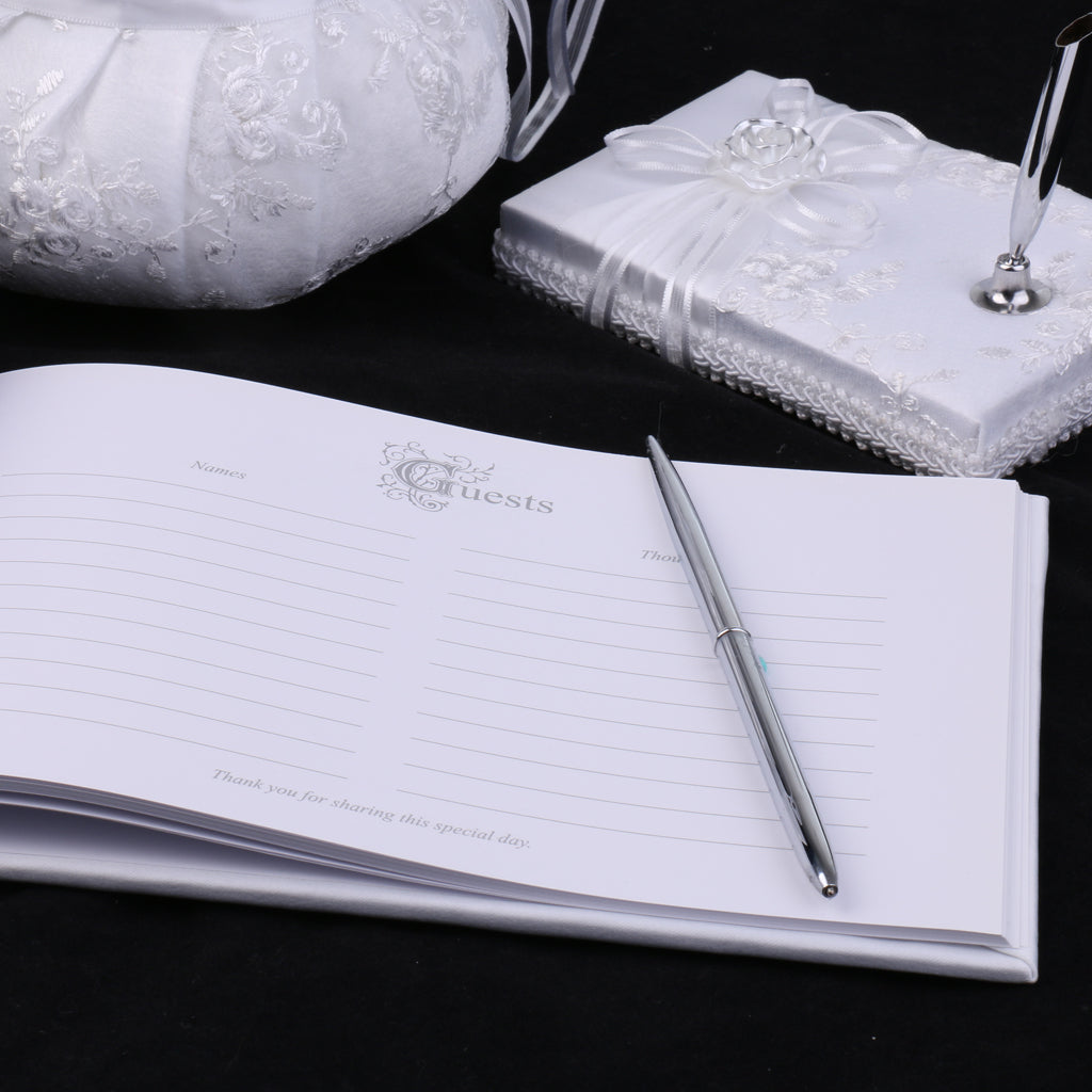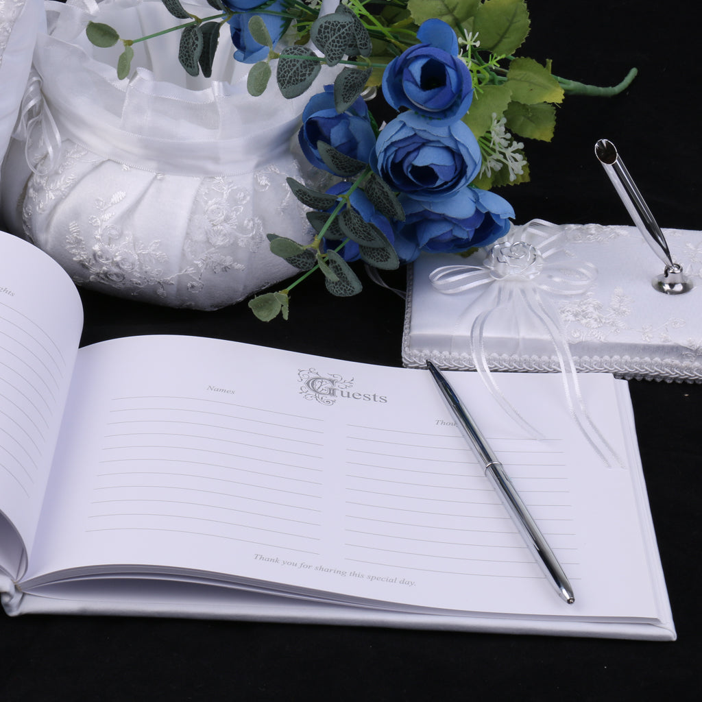 Including guest book,signing pen,pen stand,ring pillow,flower basket.