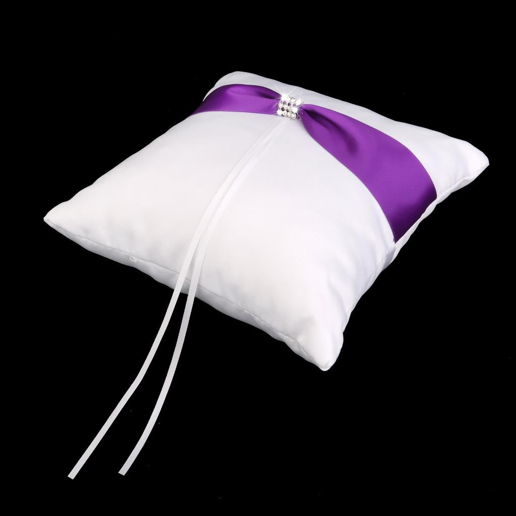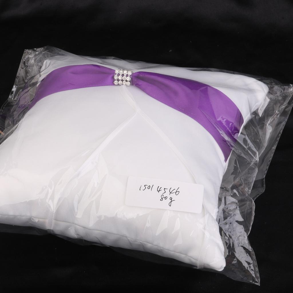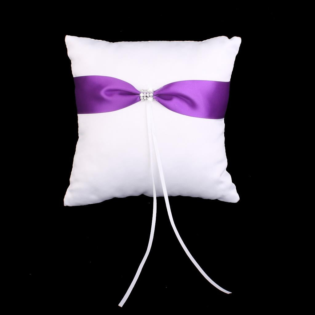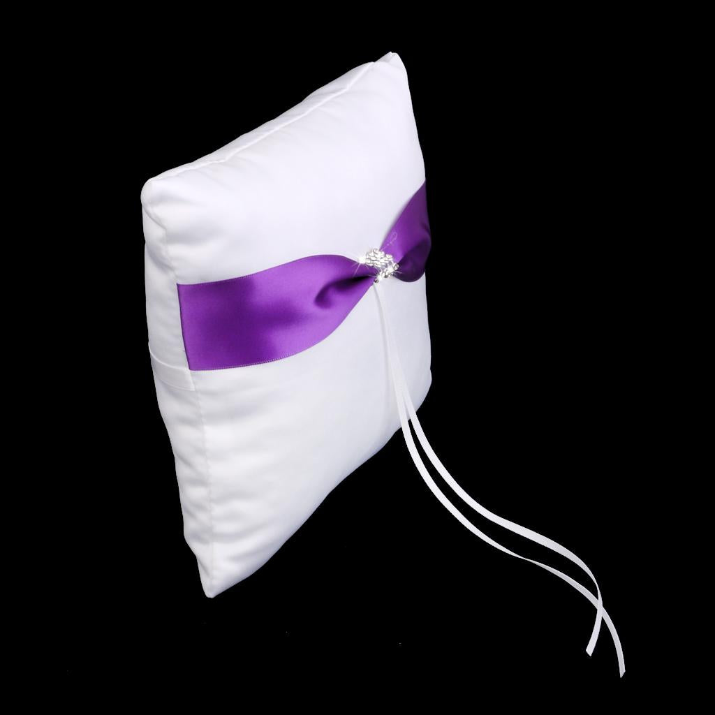 Wedding White Satin Ring Bearer Pillow Purple Ribbon & Diamante Decor