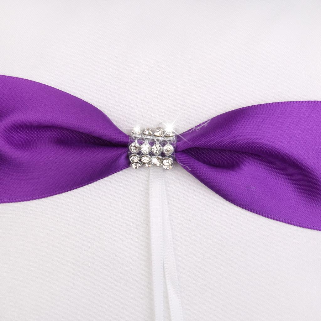 • White ring pillow decorated with purple satin ribbon and sparking diamante buckle to tie the ring