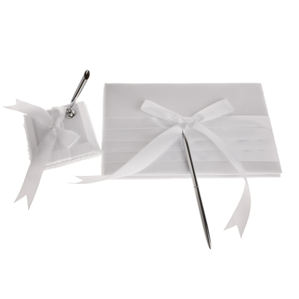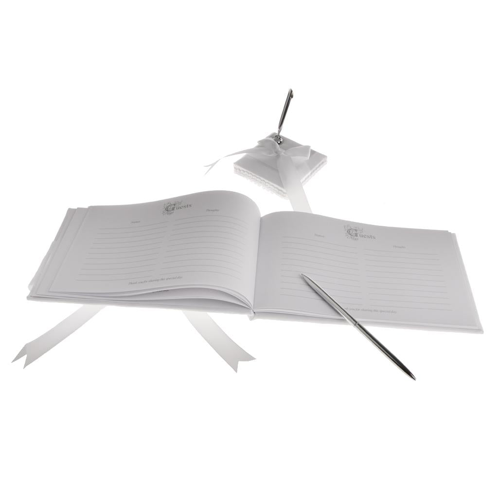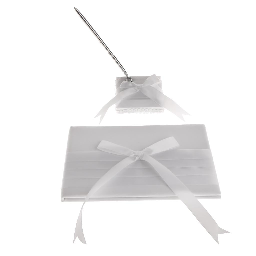 The listing comes with a pen set and guest book for a perfect wedding party.Guest book,pen stand,signing pen,graceful white color,smooth satin material,diamante buckle and ribbon bow accent,add a permanent wonderful memory for your big day.