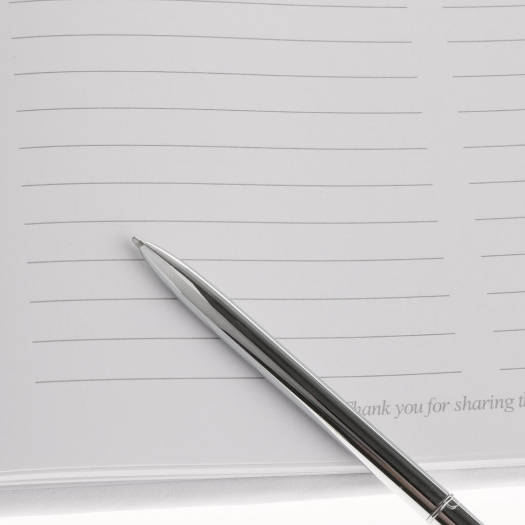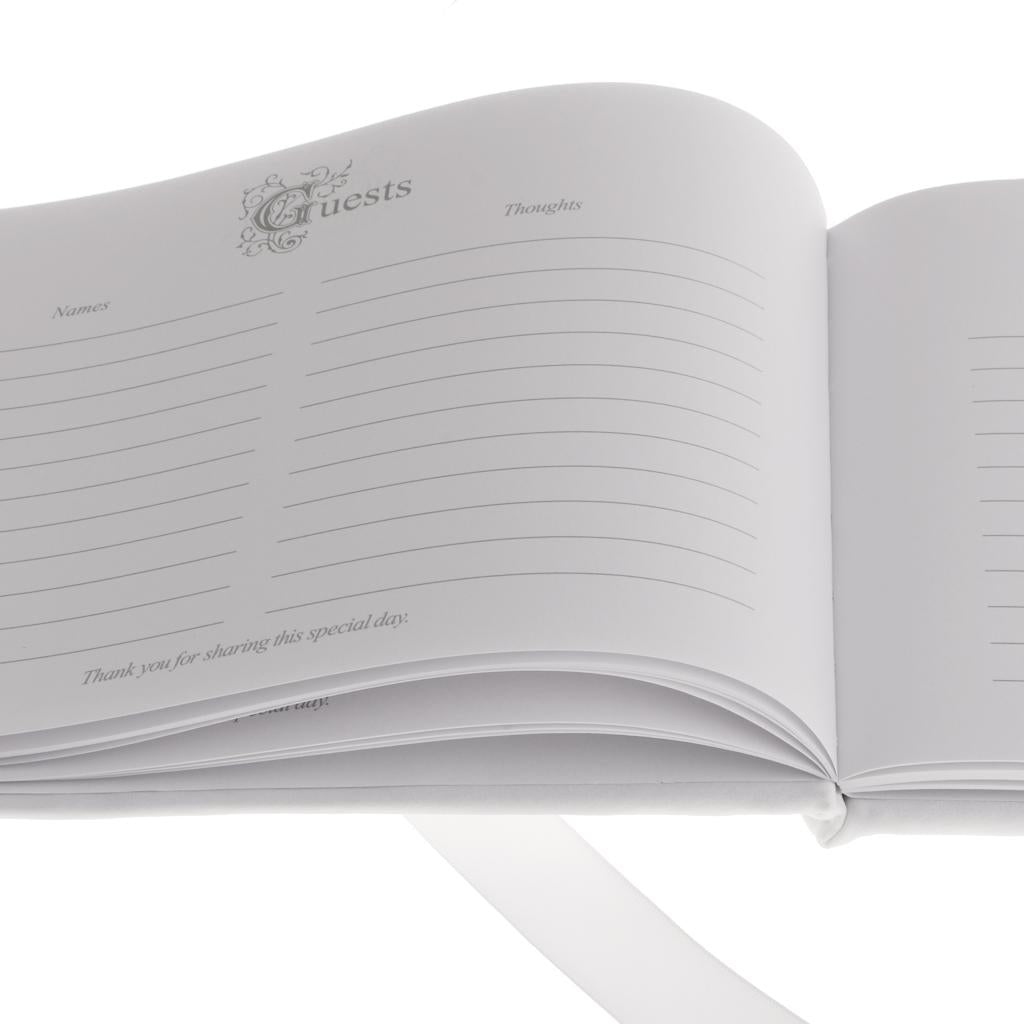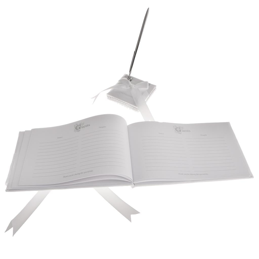 The listing comes with a pen set and guest book for a perfect wedding party.Guest book,pen stand,signing pen,graceful white color,smooth satin material,diamante buckle and ribbon bow accent,add a permanent wonderful memory for your big day.