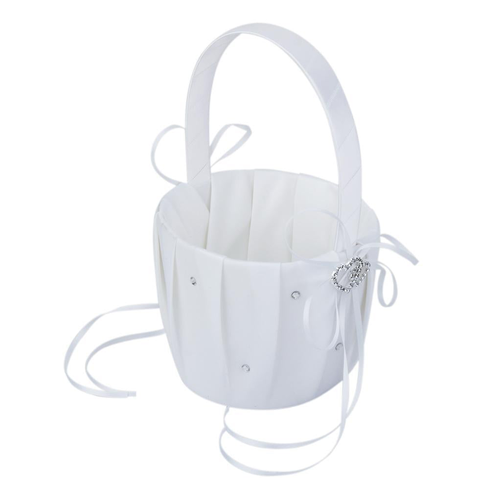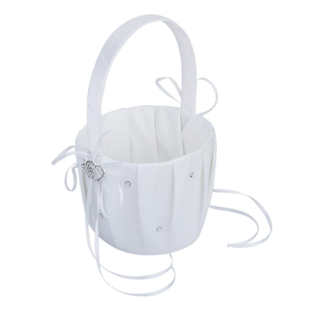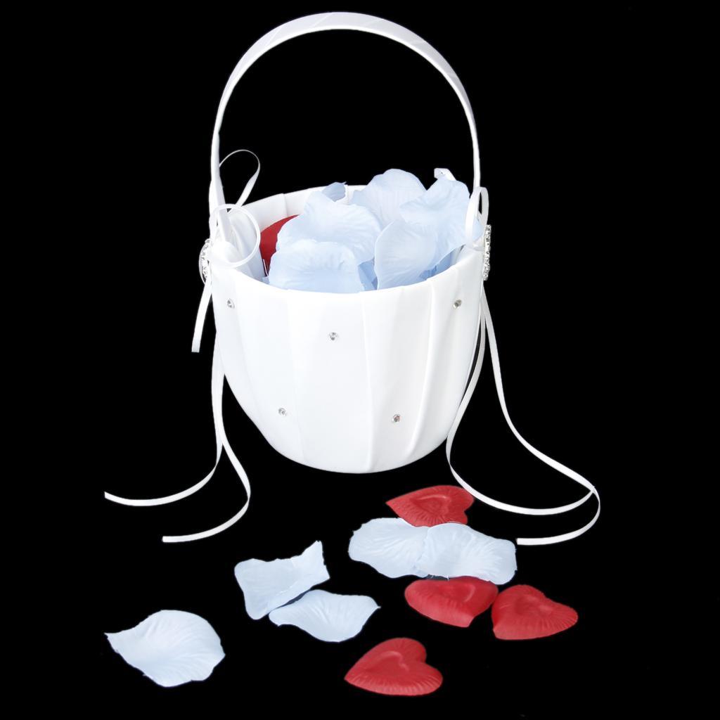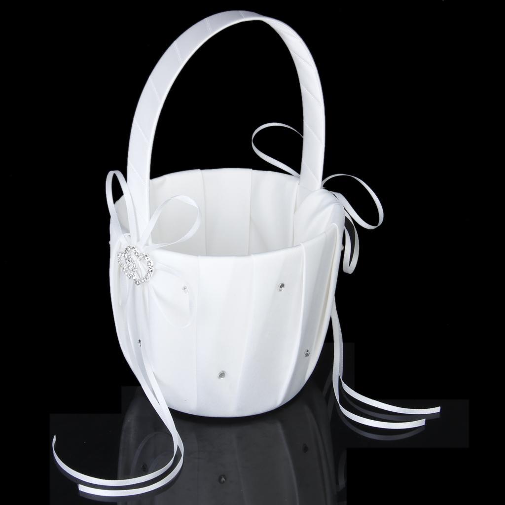White Satin Double Heart Wedding Flower Girl Basket Crystal Rhinestone Decor