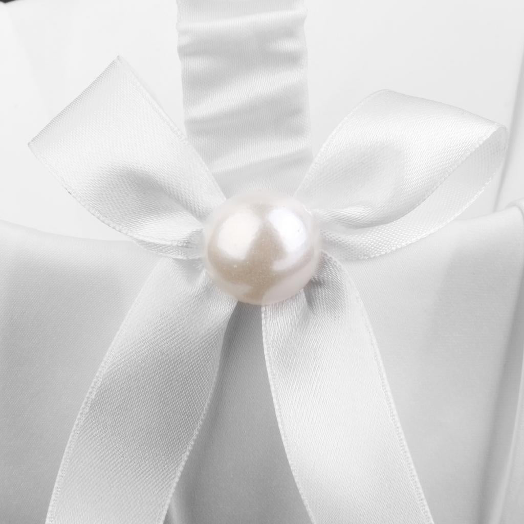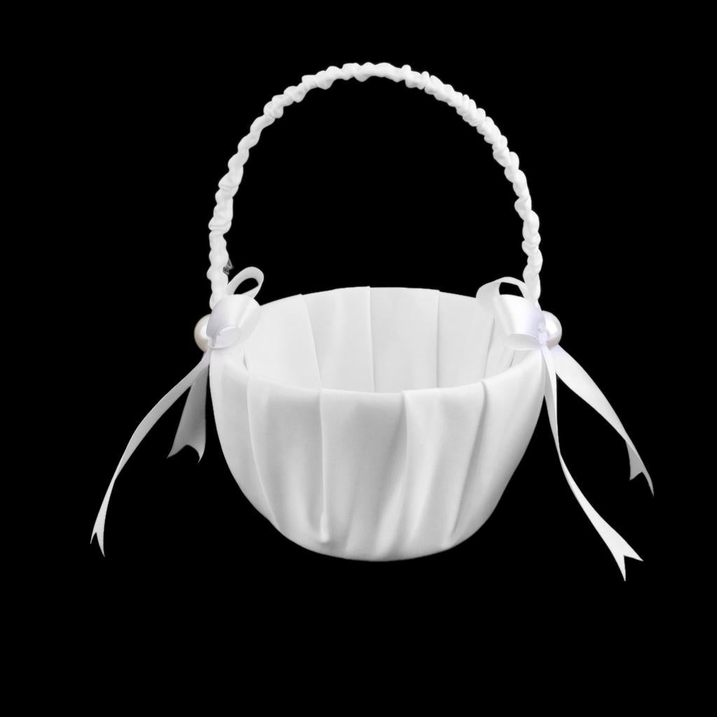 White Satin Pearl Wedding Flower Girl Basket Bowknot Decor