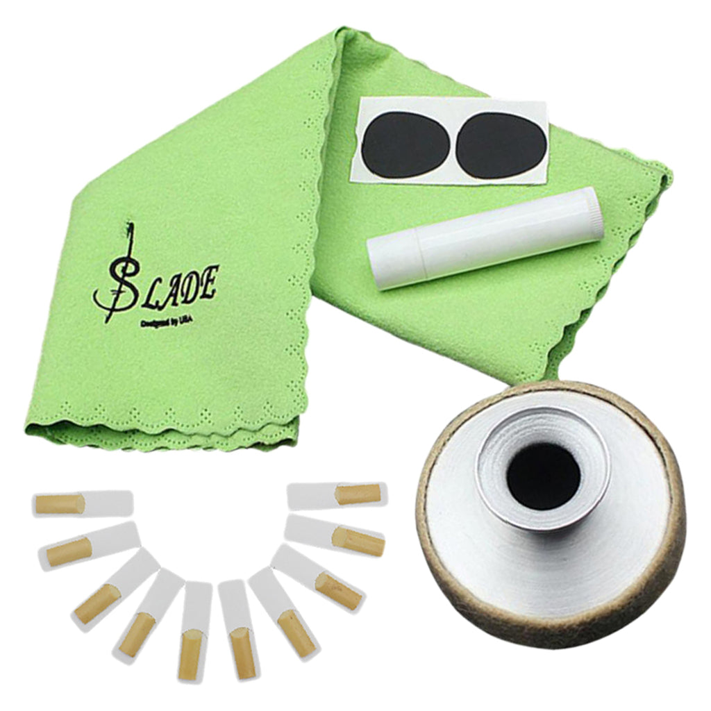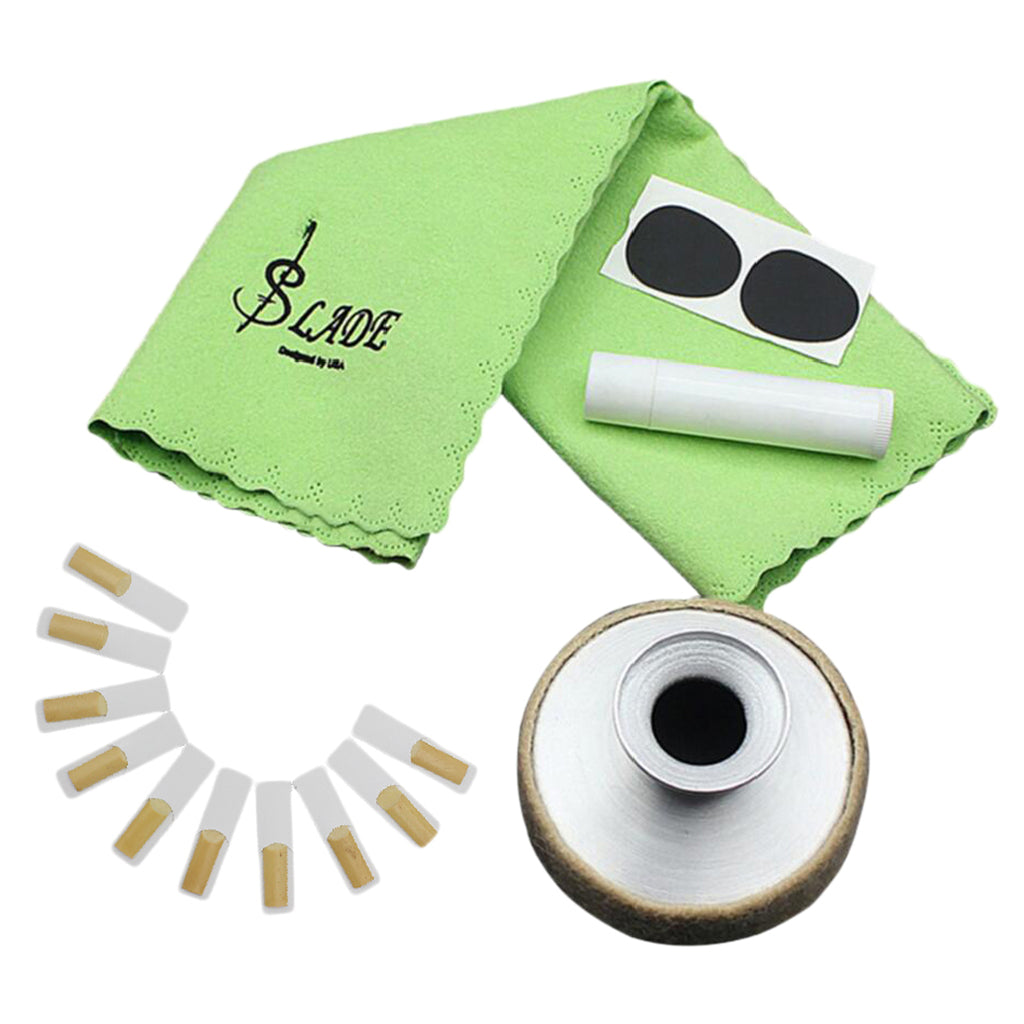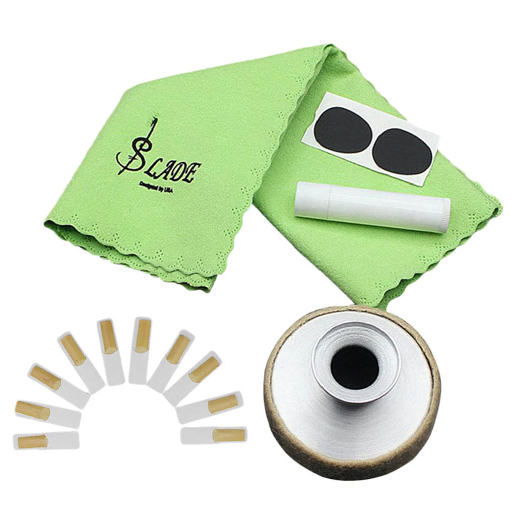 5 in 1 alto sax saxophone kit, includes cleaning cloth, mute, mouthpiece patch, cork grease, and reeds.