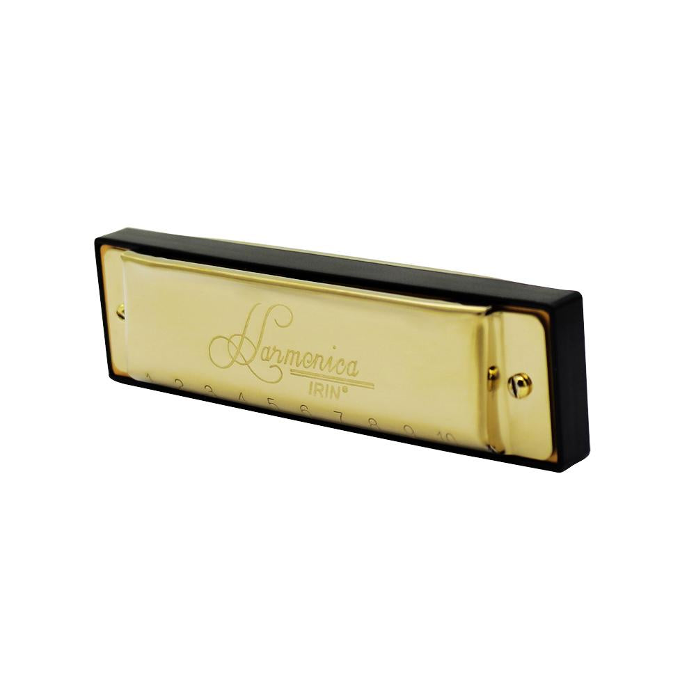 It contains a silver blues harmonica and a golden blues harmonica & accessories.