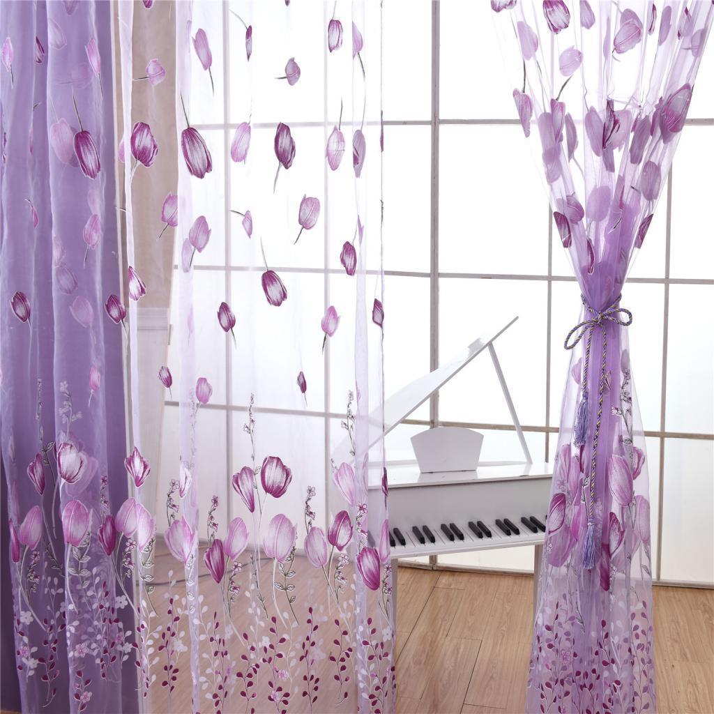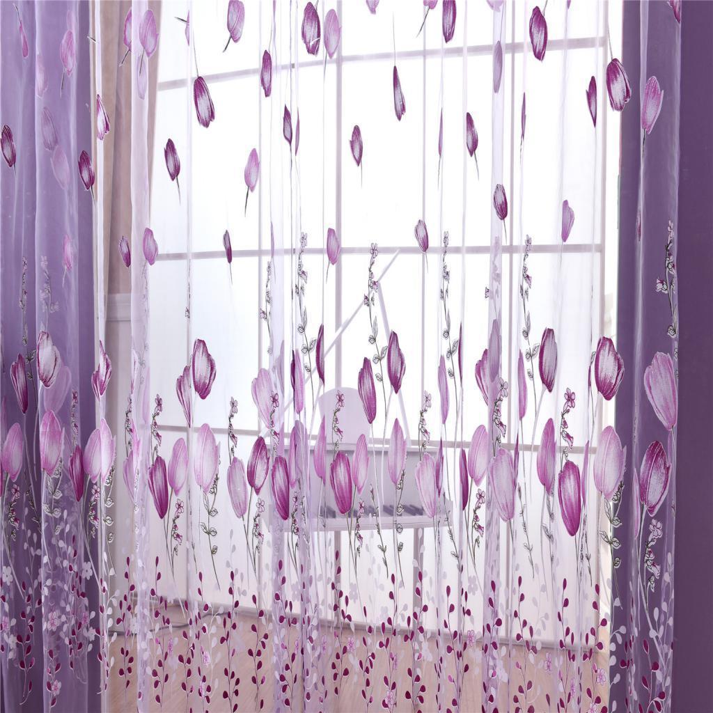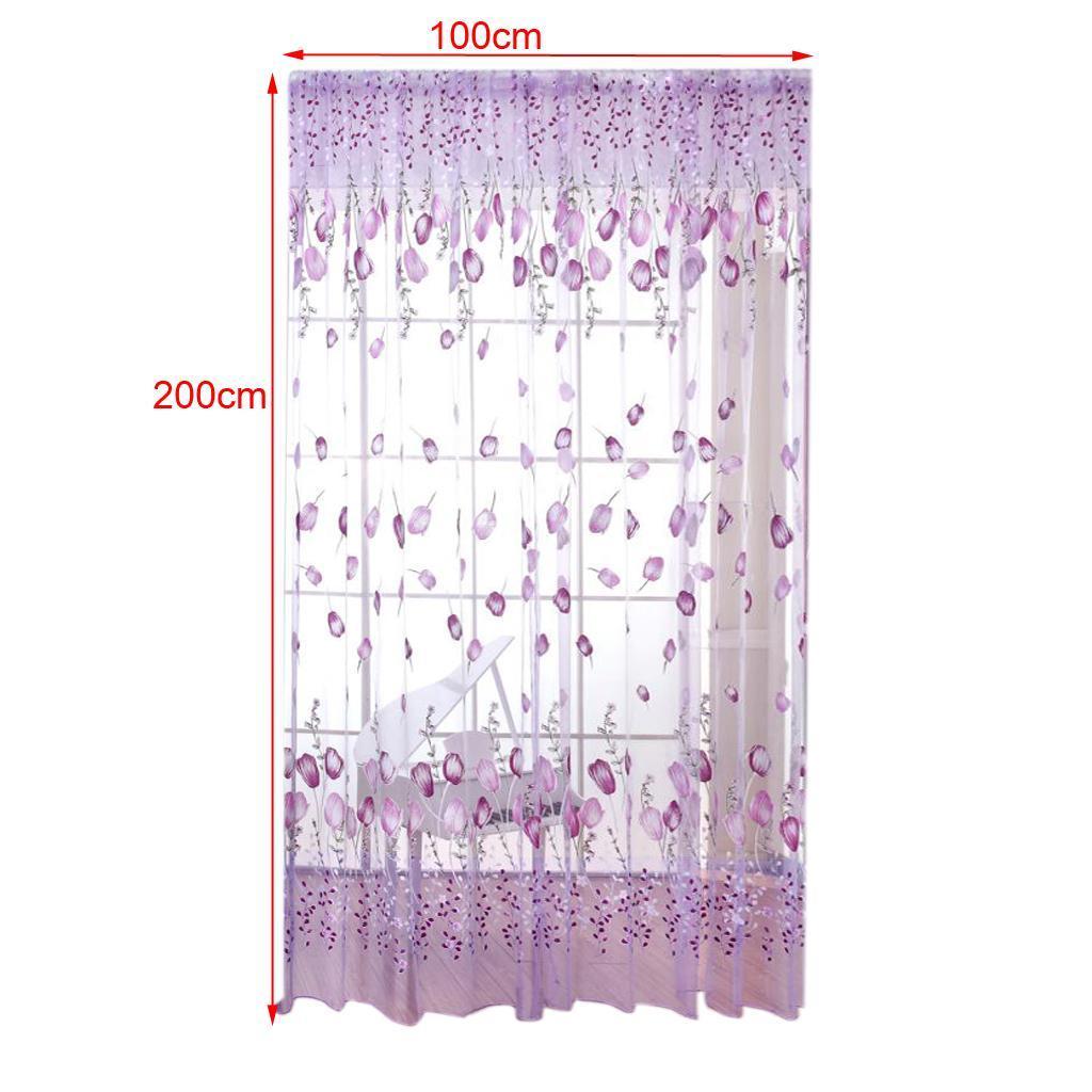 100*200cm Window Voile Curtain Panel Sheer Tulle Drape Tullip Flower Purple