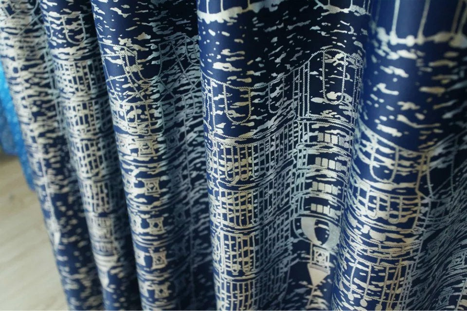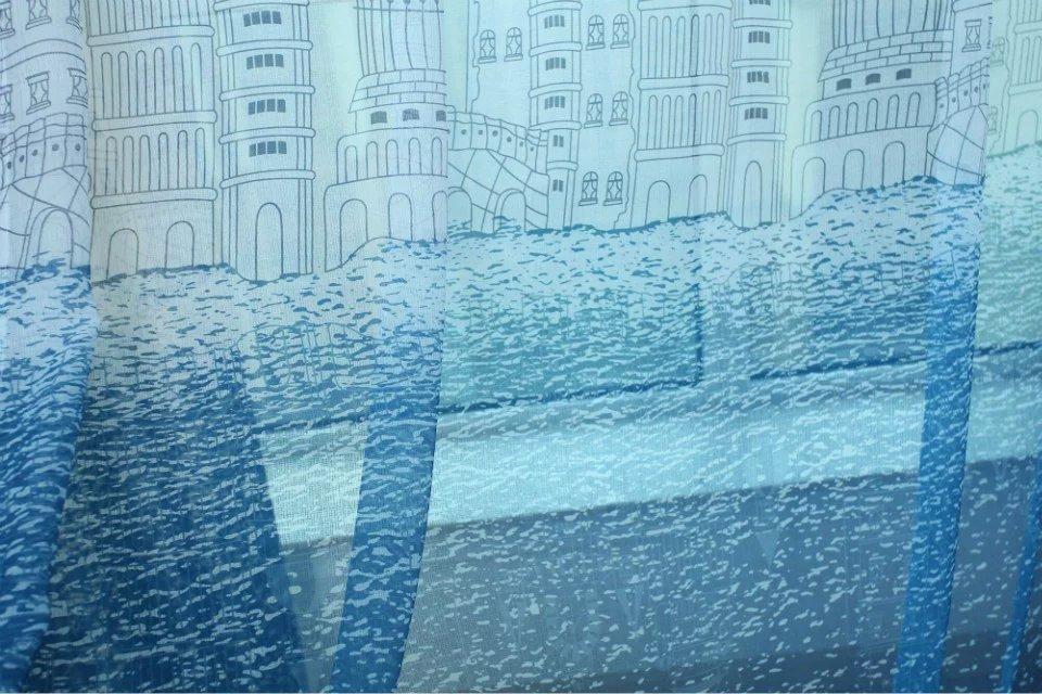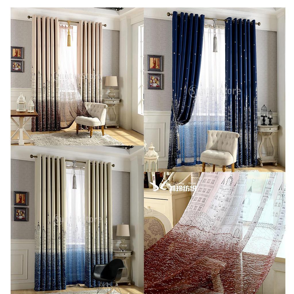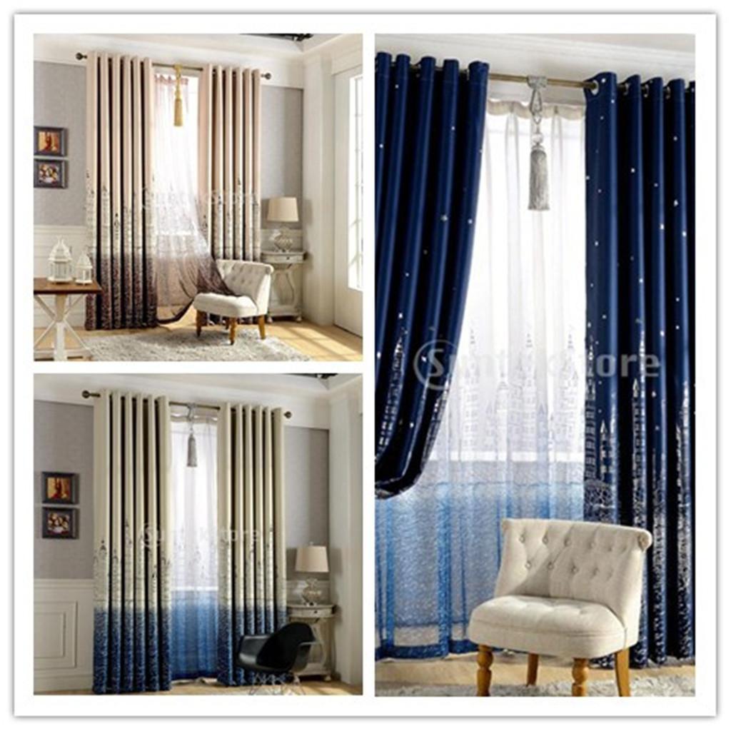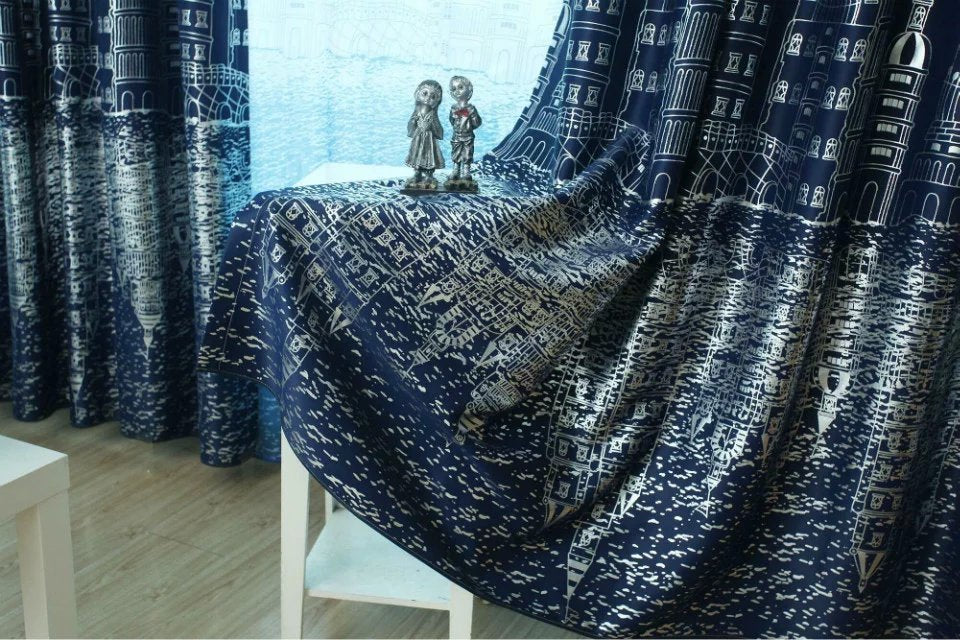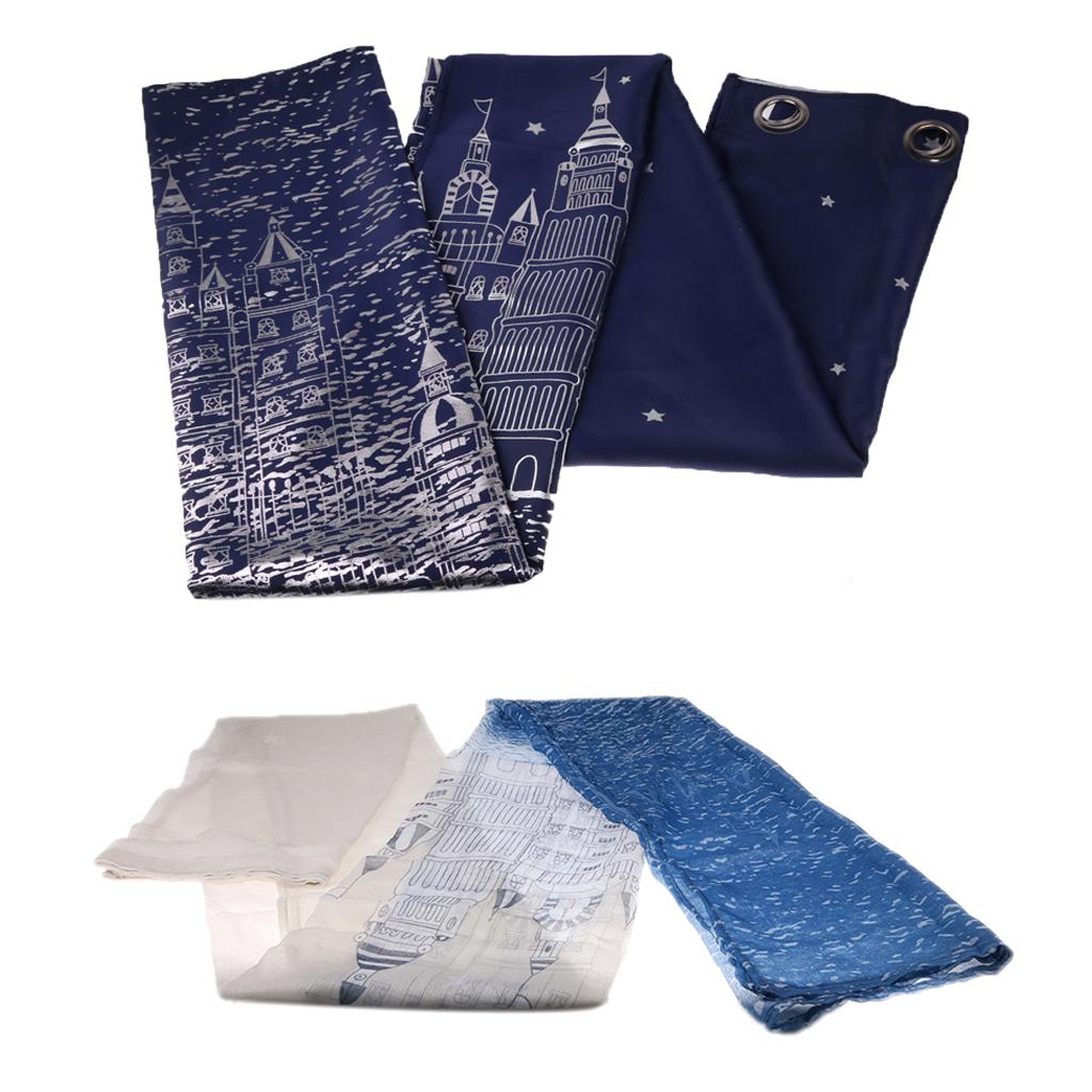 2 Piece Castle Print Window Panel Curtain Set, Sheer Gauze Curtain+Blackout Drape Curtain - Blue