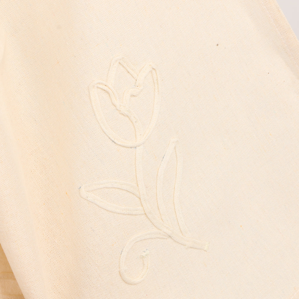 Features with crochet gridding bottom and exquisitely embroidered flowers in the middle.