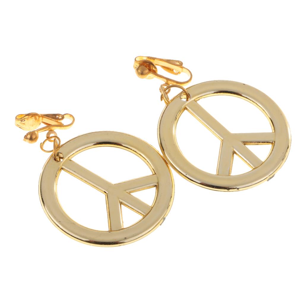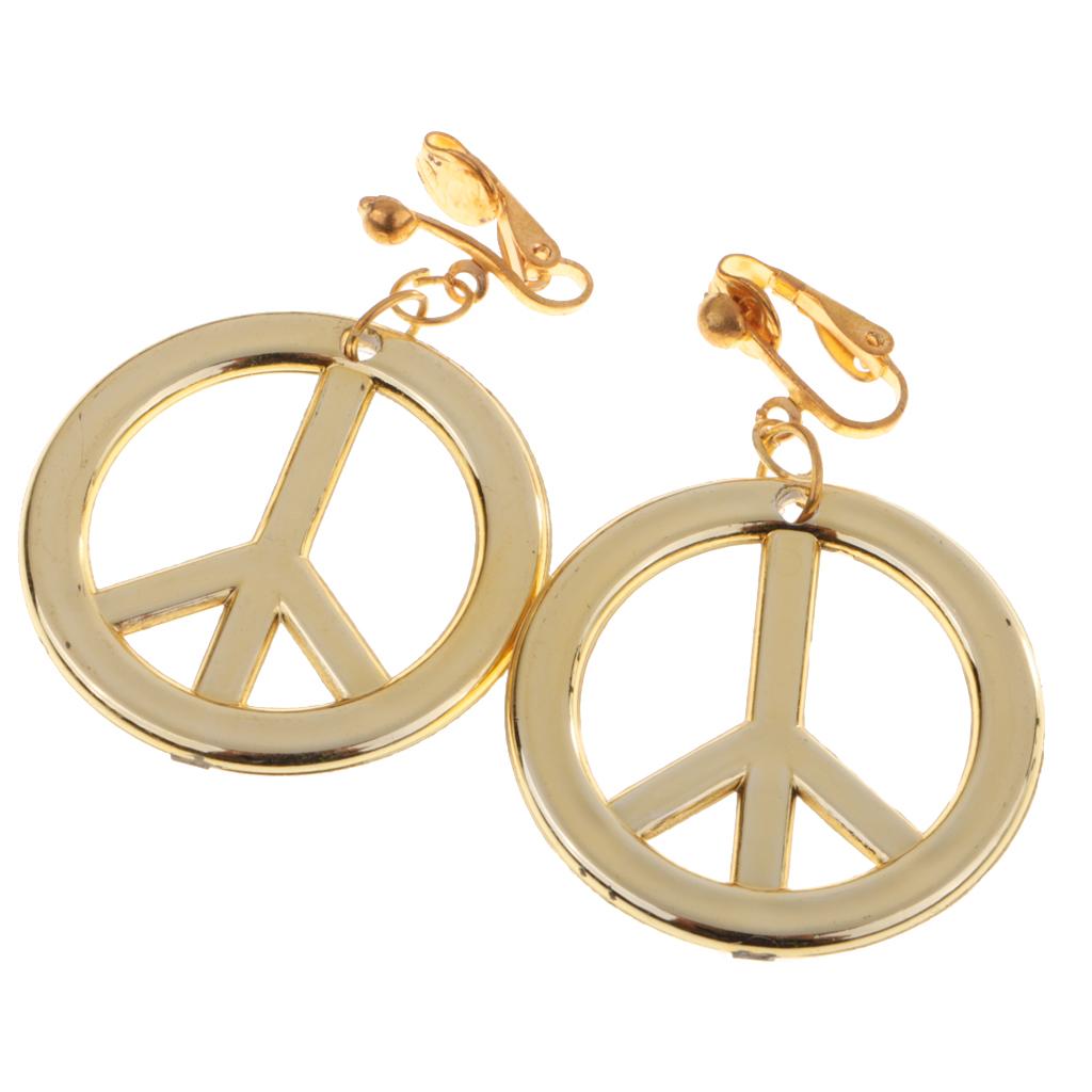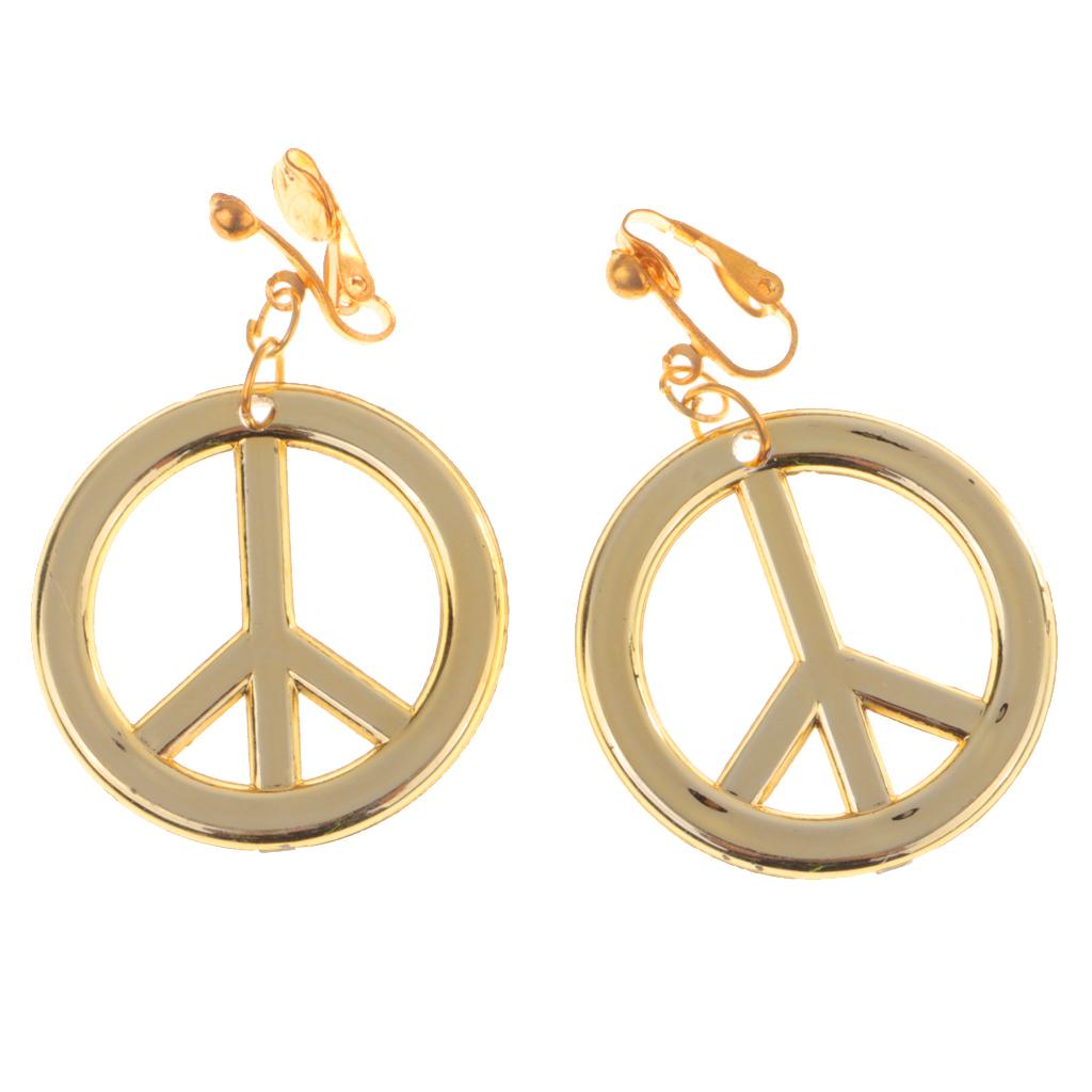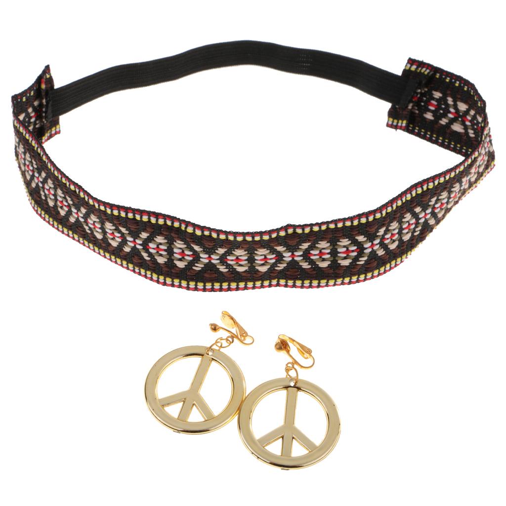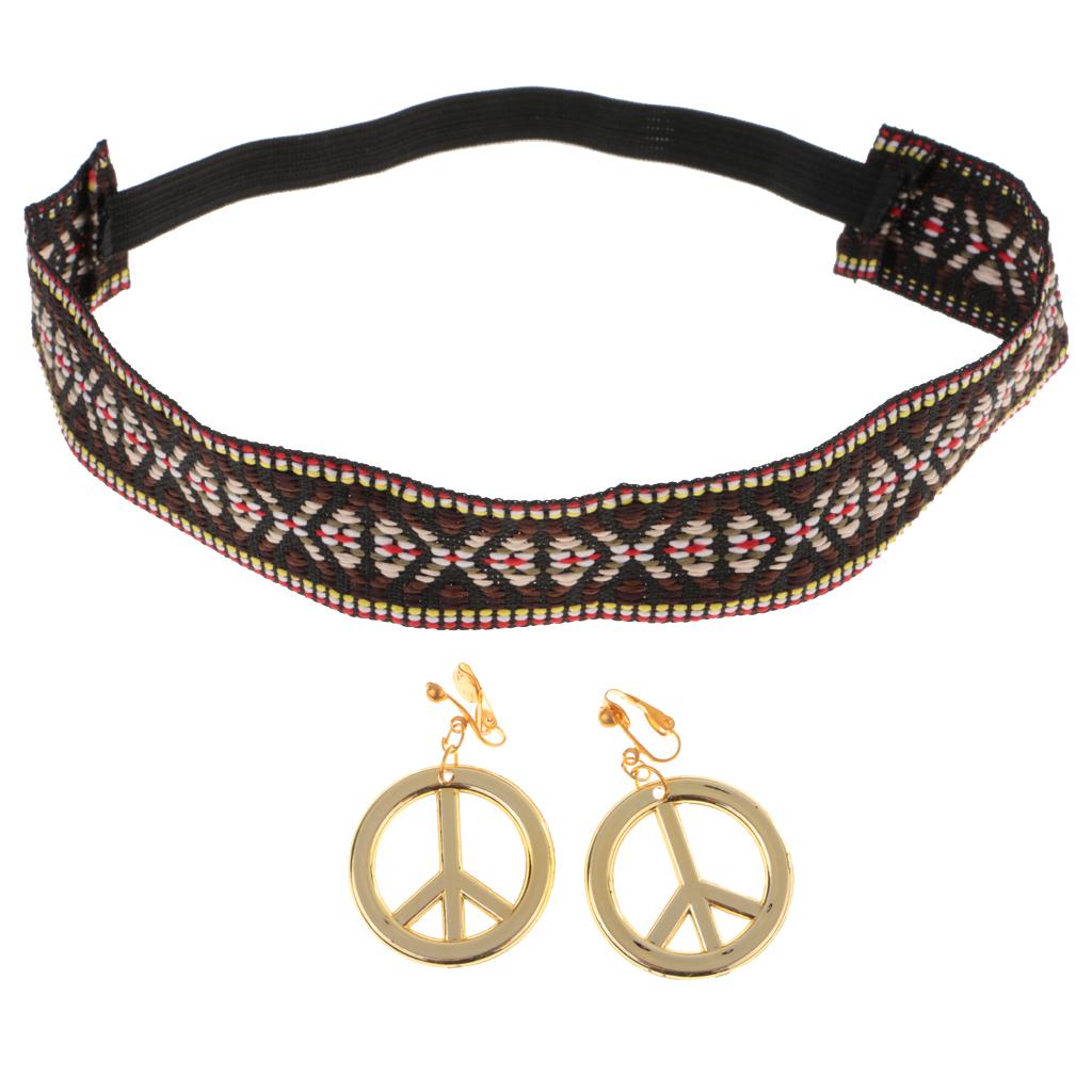 Boho Hippie Embroidered Headband & Gold Peace Symbol Earrings Costume Accessories