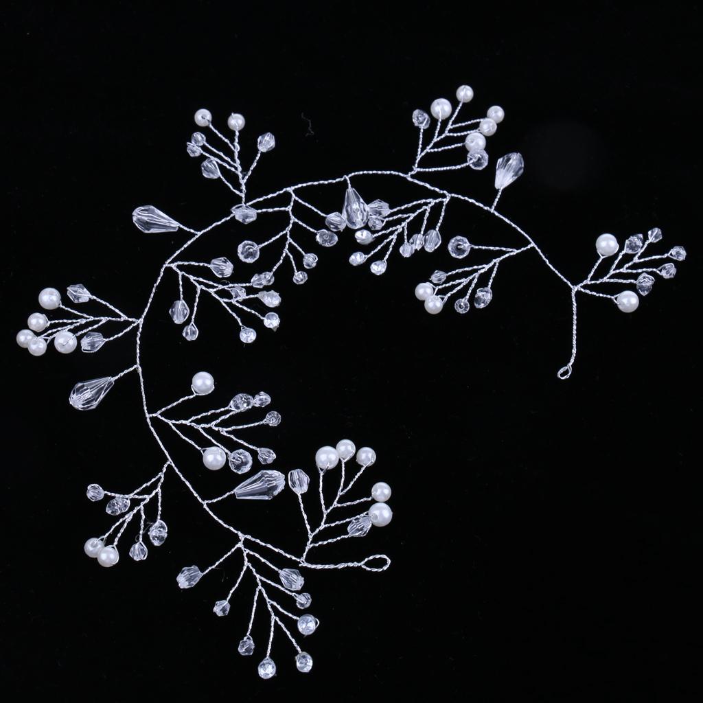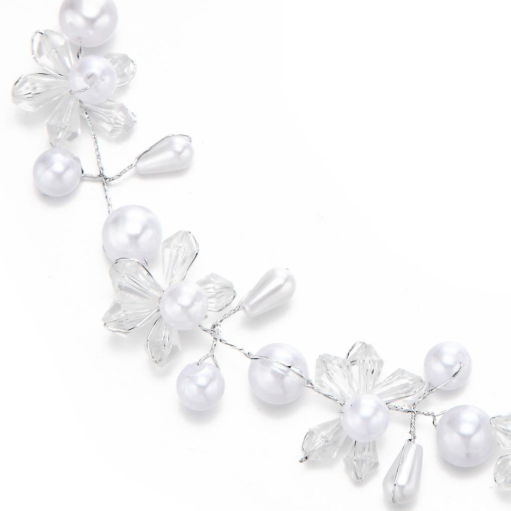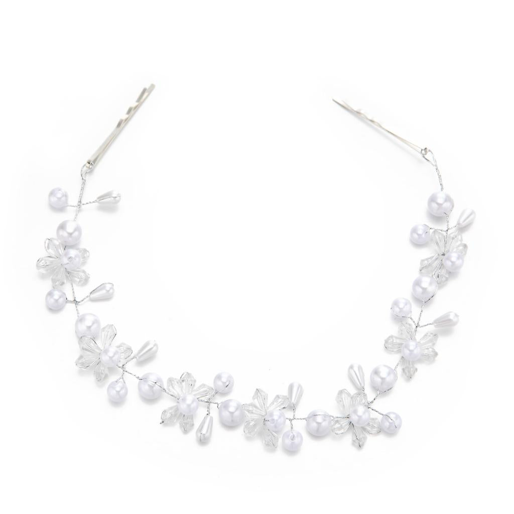 A delicate headband for women and girls, featuring vines with dangling clear beads and pearls