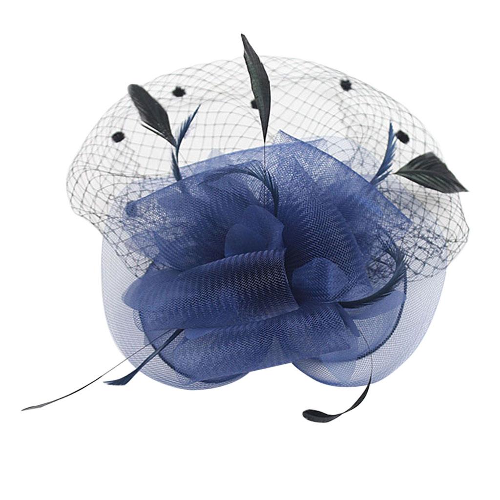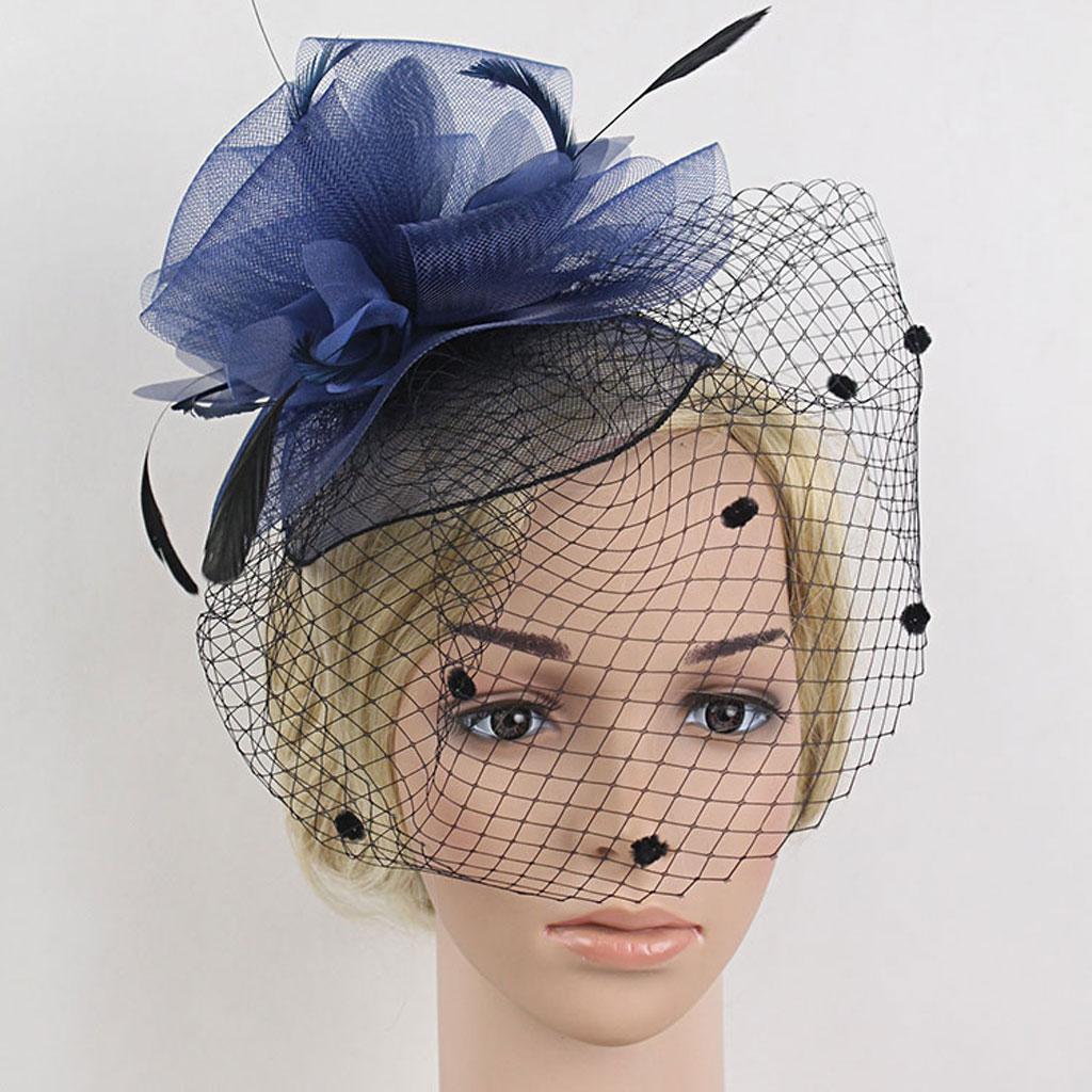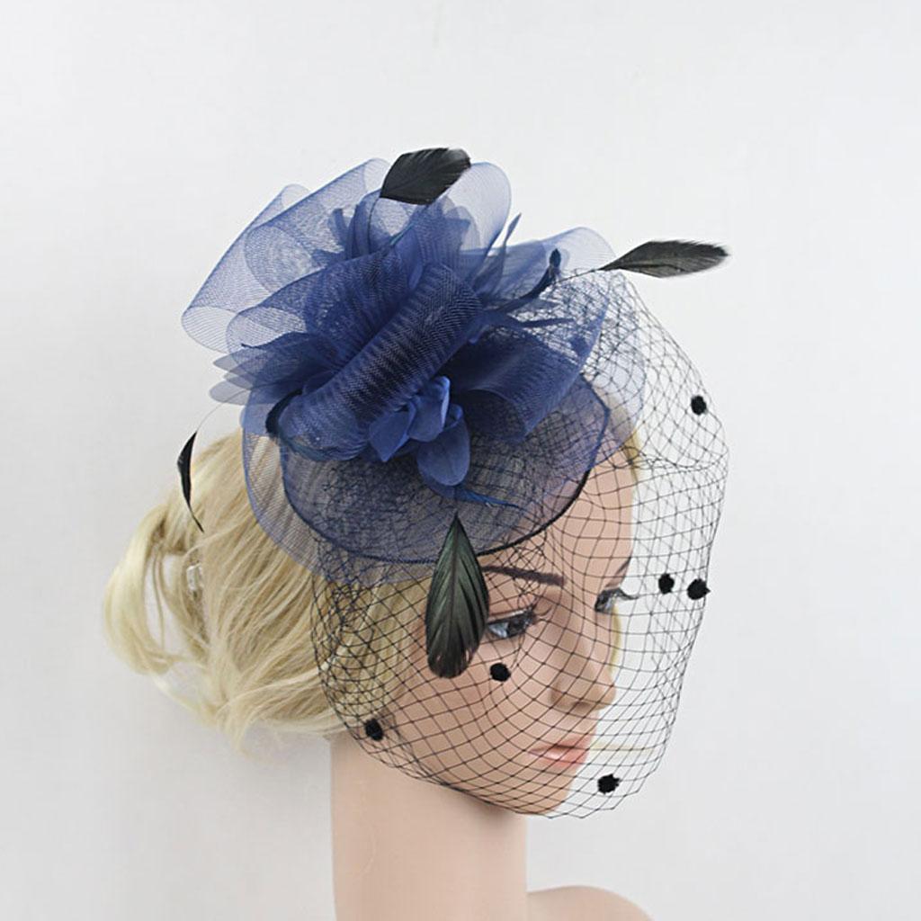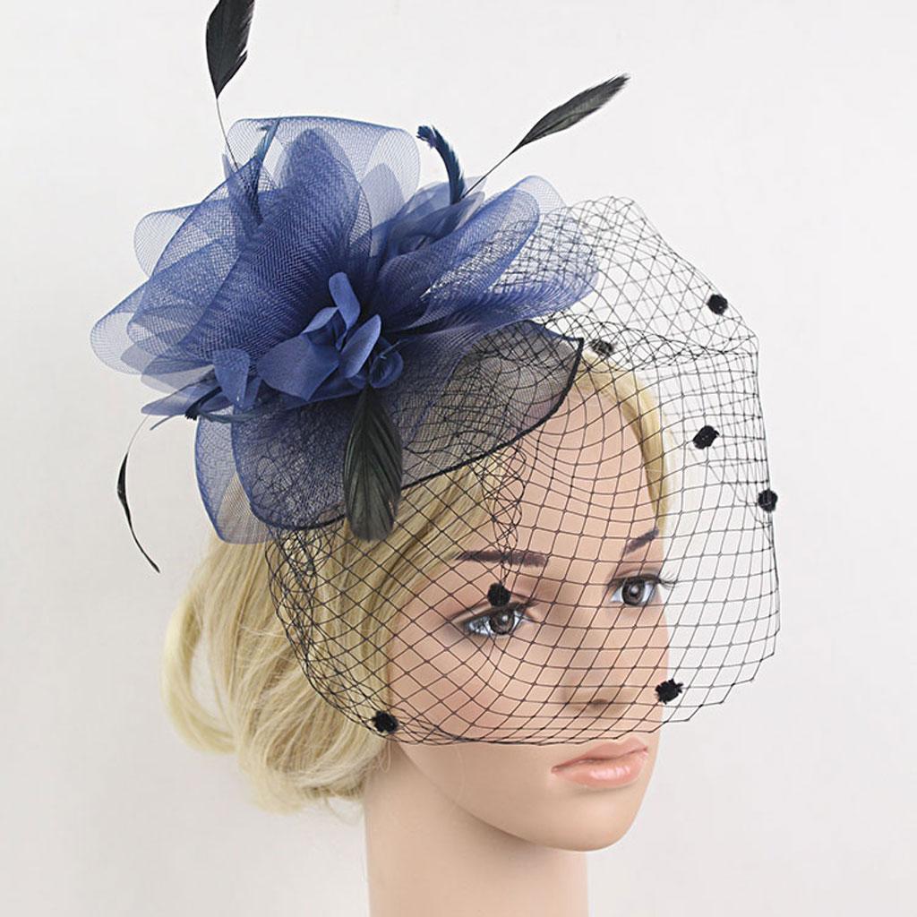 Wedding Bridal Ladies Prom Mesh Veil Feather Fascinator Hair Clip Dark Blue