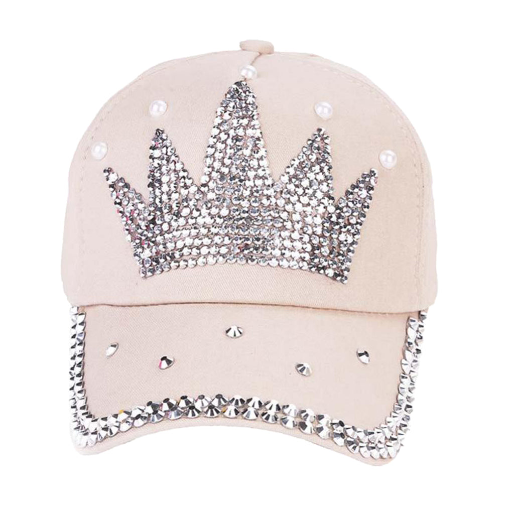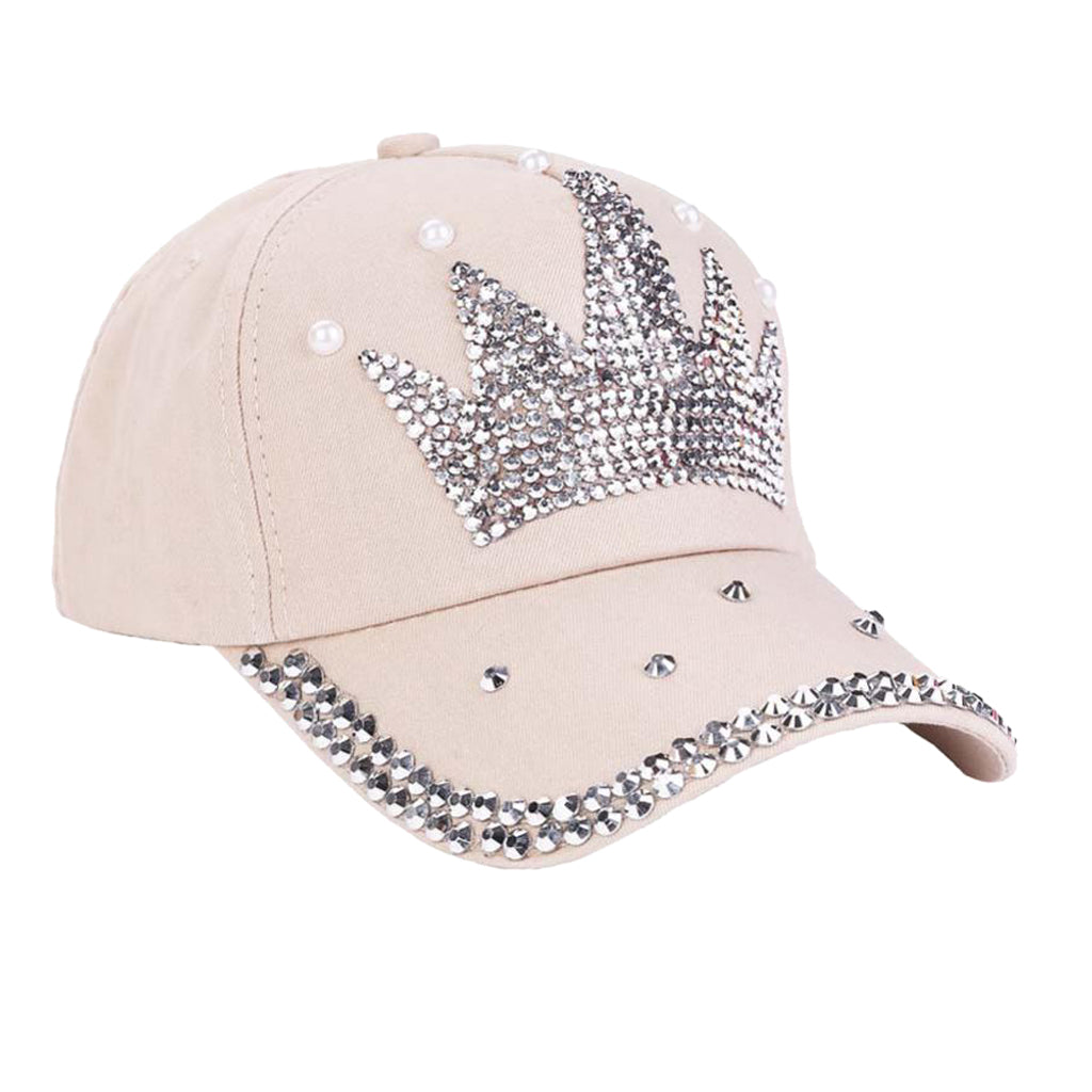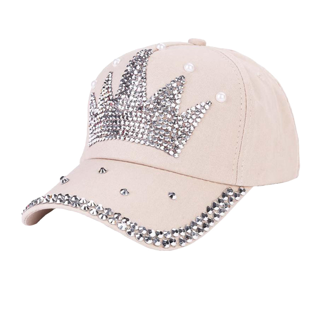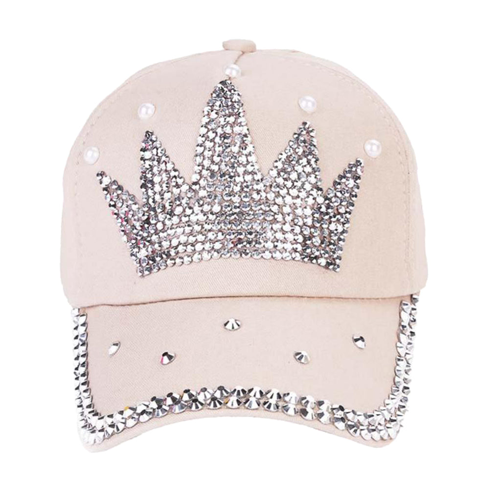 Womens Baseball Cap Crown Rhinestone Snapback Adjustable Sport Sun Hat Beige