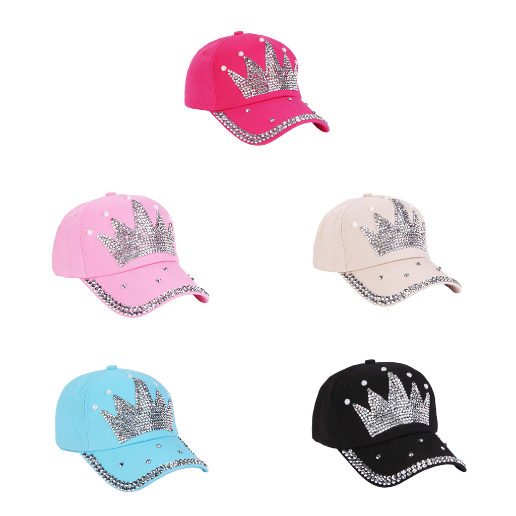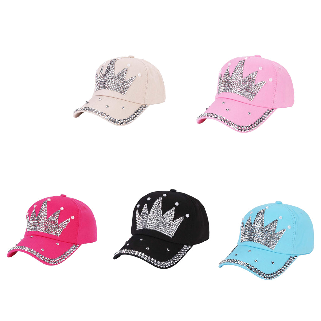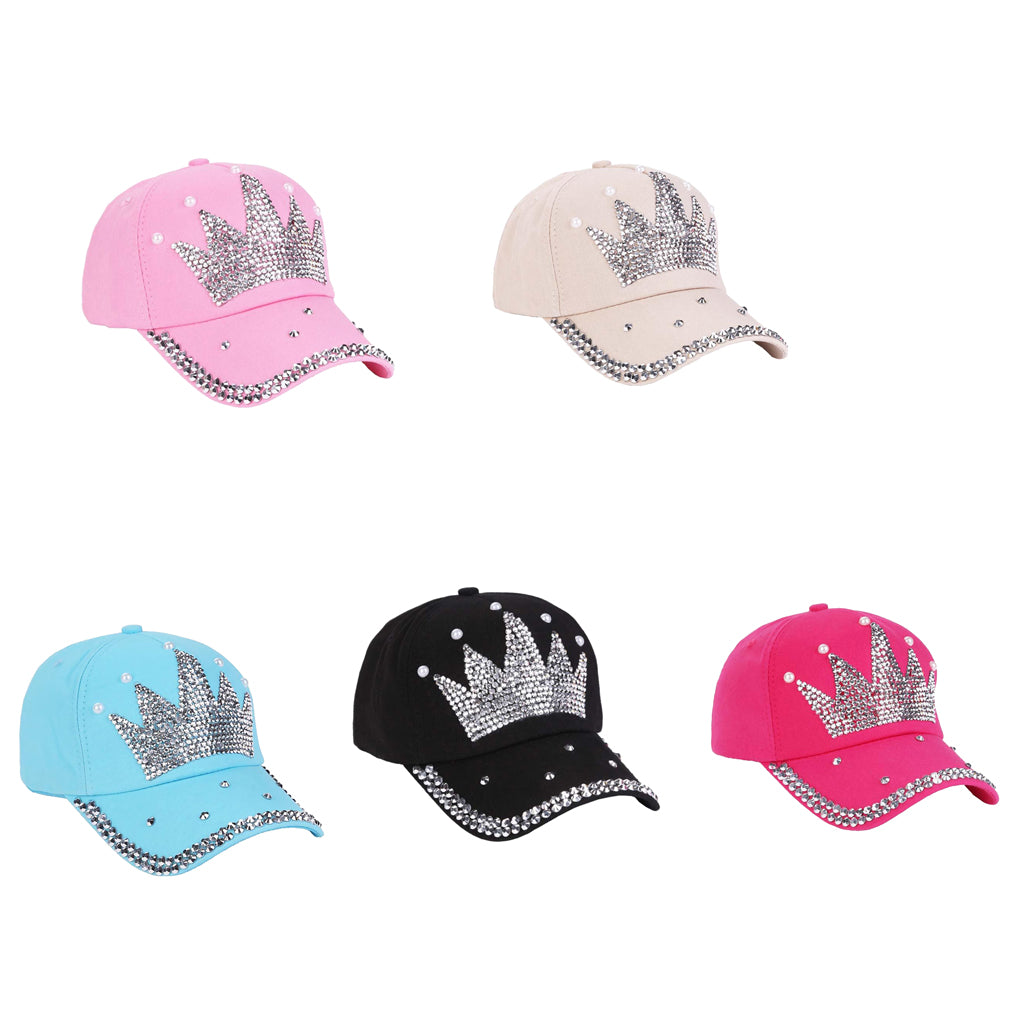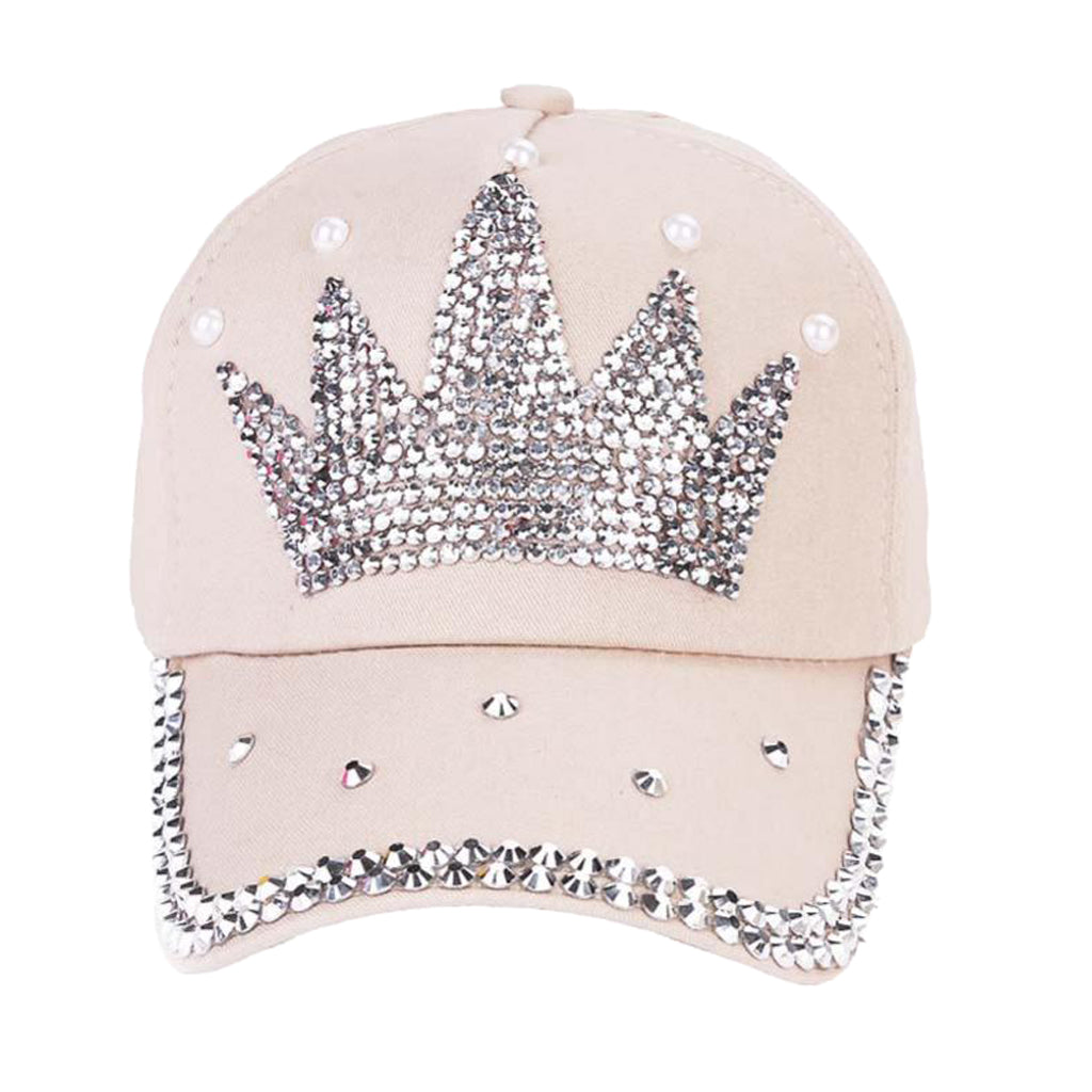 Womens Baseball Cap Crown Rhinestone Snapback Adjustable Sport Sun Hat Beige