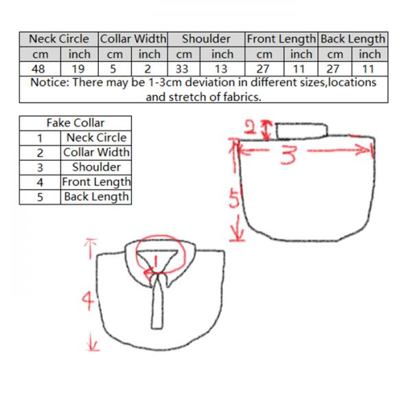 Neck Circle:48cm/19inch; Collar Width:5.3cm/2inch; Shoulder:33cm/13inch; Front Length:27cm/11inch; Back Length:27cm/11inch.