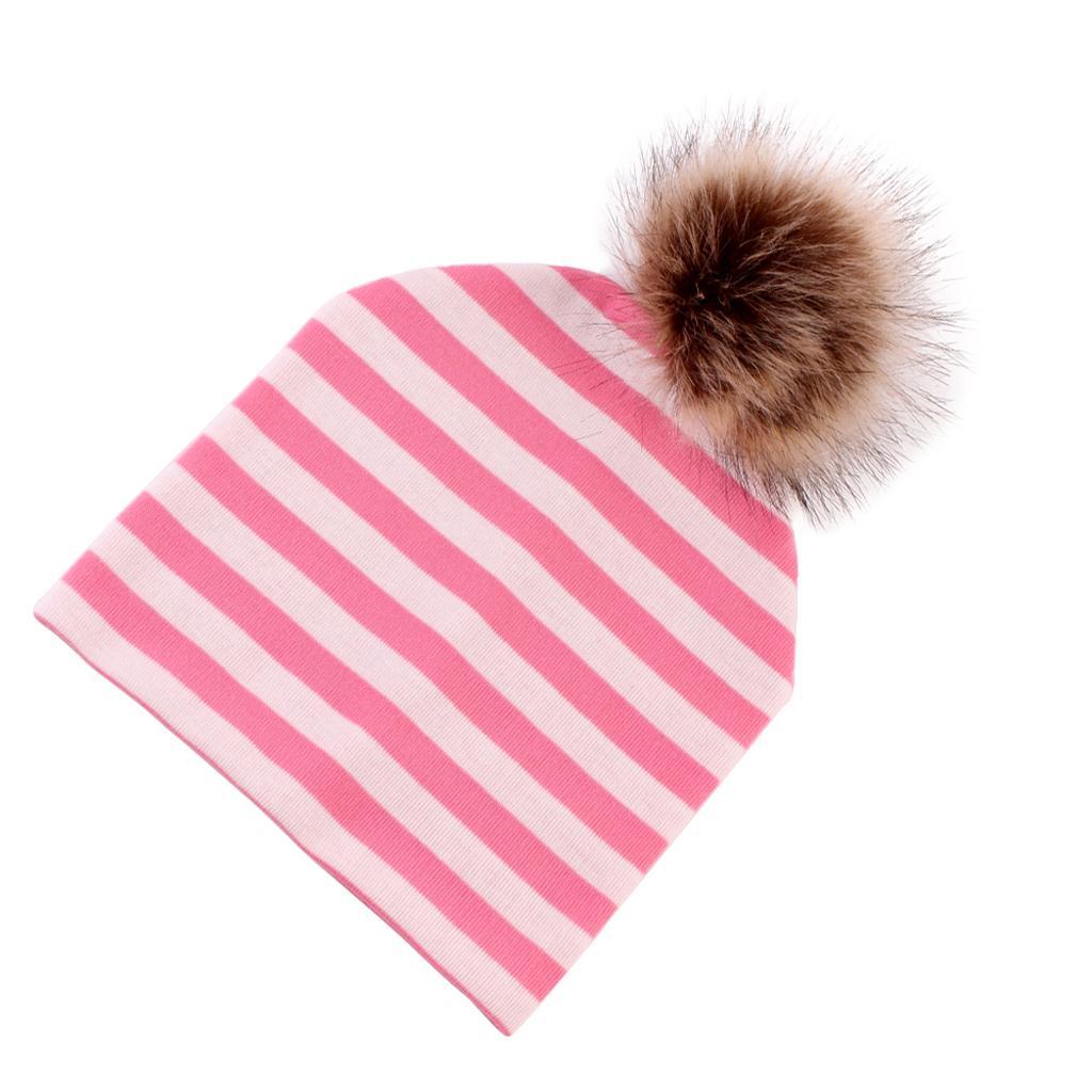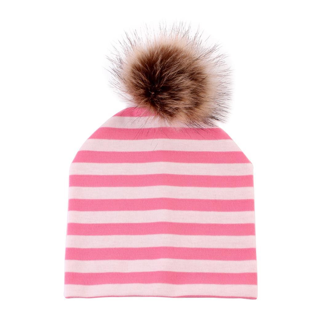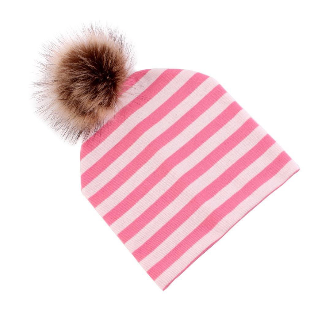 Womens Warm Winter Cotton Knit Beanie Large Pom Hat Pink White Striped