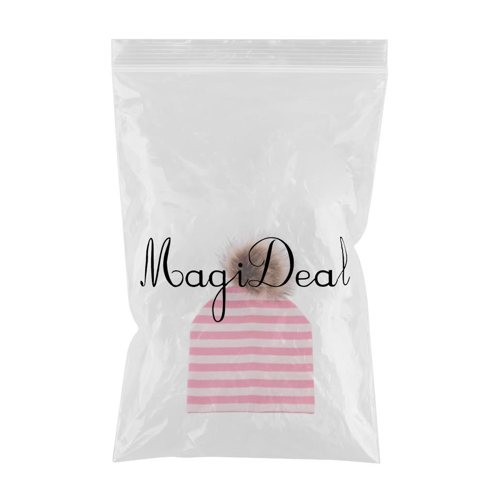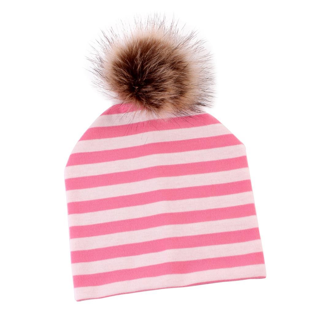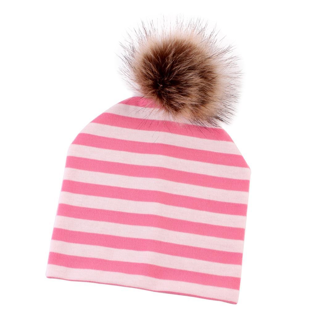 Womens Warm Winter Cotton Knit Beanie Large Pom Hat Pink White Striped