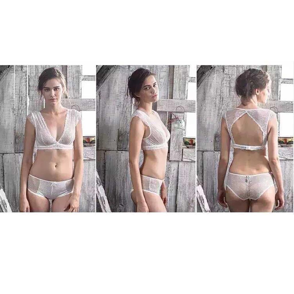 Set Of Women Girls Ladies Wire Free Seamless Deep V Neck Open Back Lace Plunging Bra Briefs 75C White