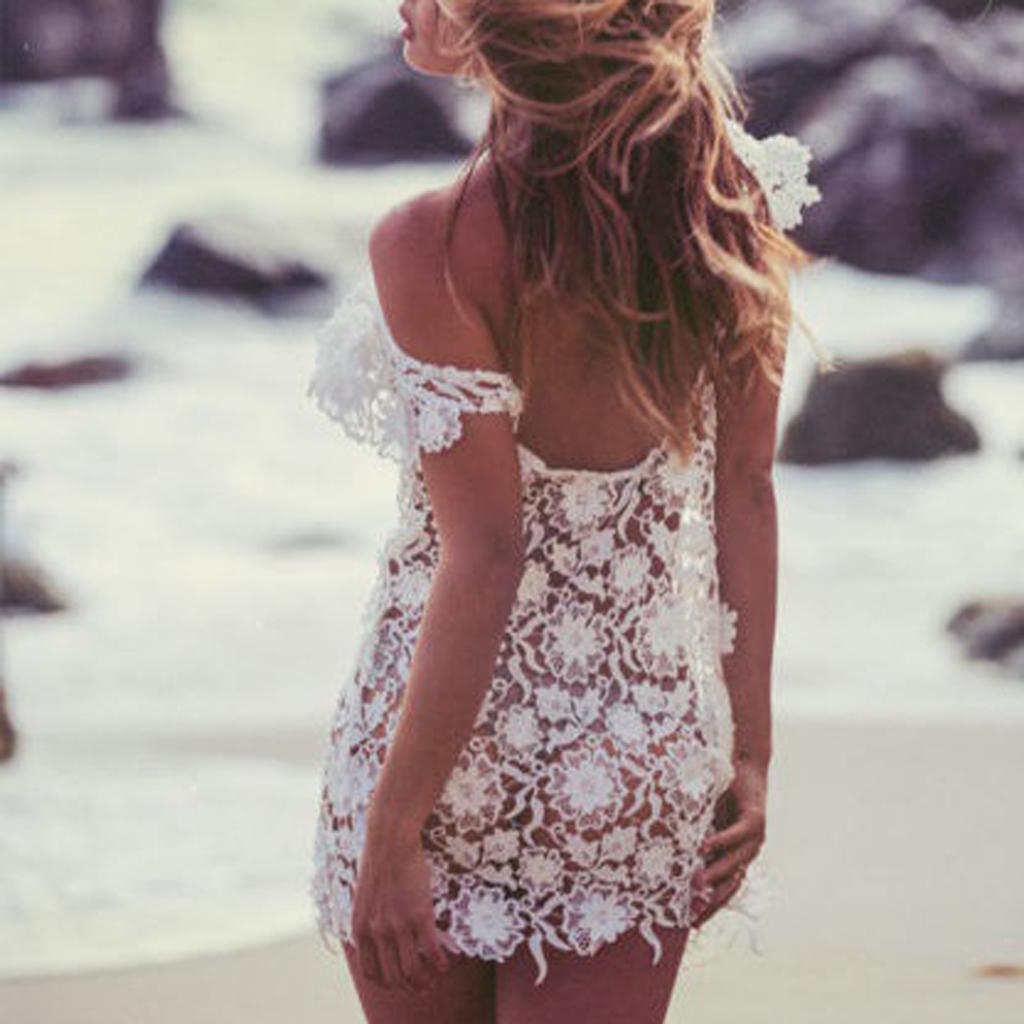 Introducing this season's love of all things into this sexy,adorable mini dress for your wardrobe with this short-sleeved lace dress.lts chic lace and flower works for your wardrobe. while the cinched shoulders with update your summer edit with a little hippie inspiration. These will give you soft and comfortable feeling in summer. This short-sleeved style Dress is Super modern,sexy and easy to wear. will give a slim look. Material is comfortable for beachwear. boho party. other summer party and any other occasion. Made with fine cotton material white artistic semi transparent dress flower design.