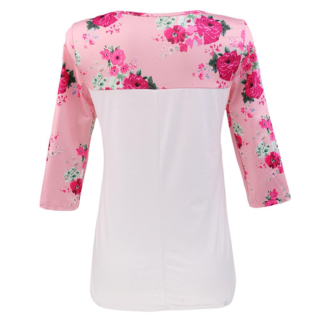 Women Splice Contrast Color Floral Print 3/4 Sleeve Blouse Shirts S White