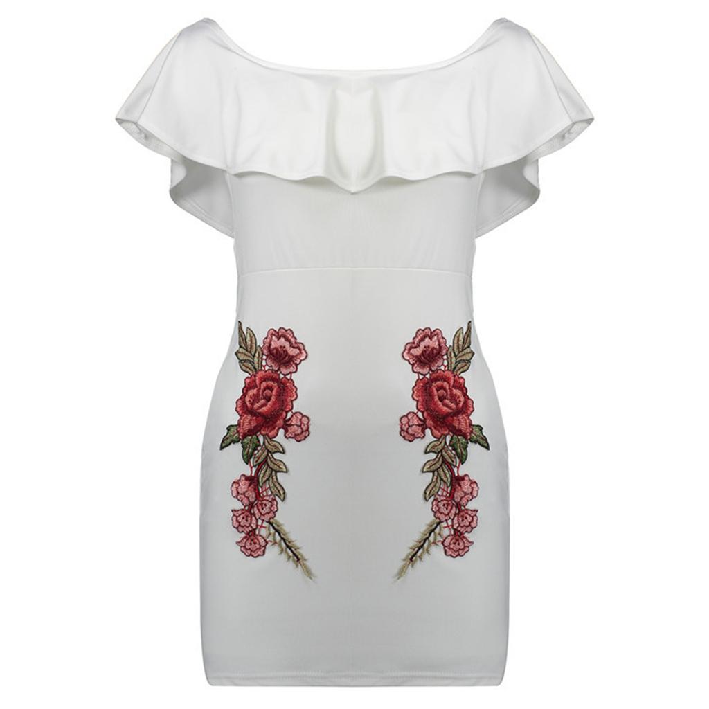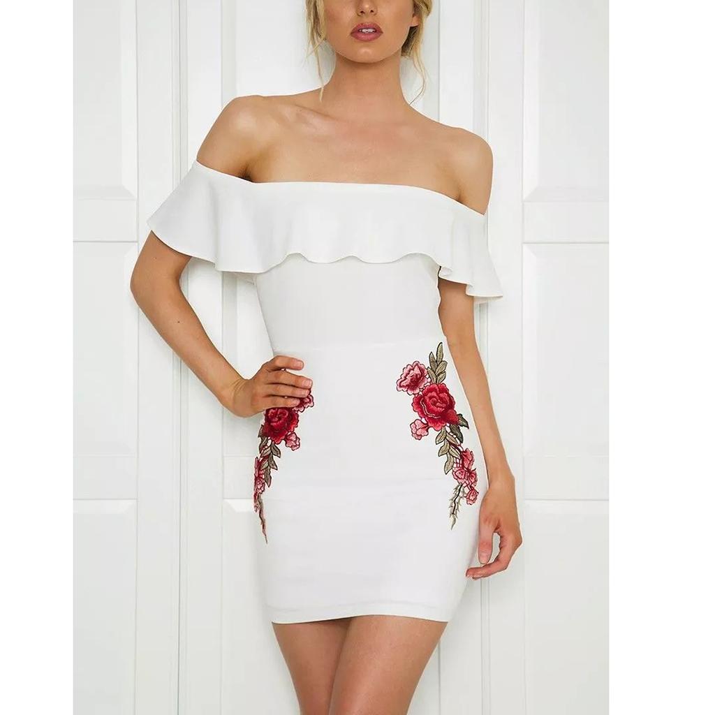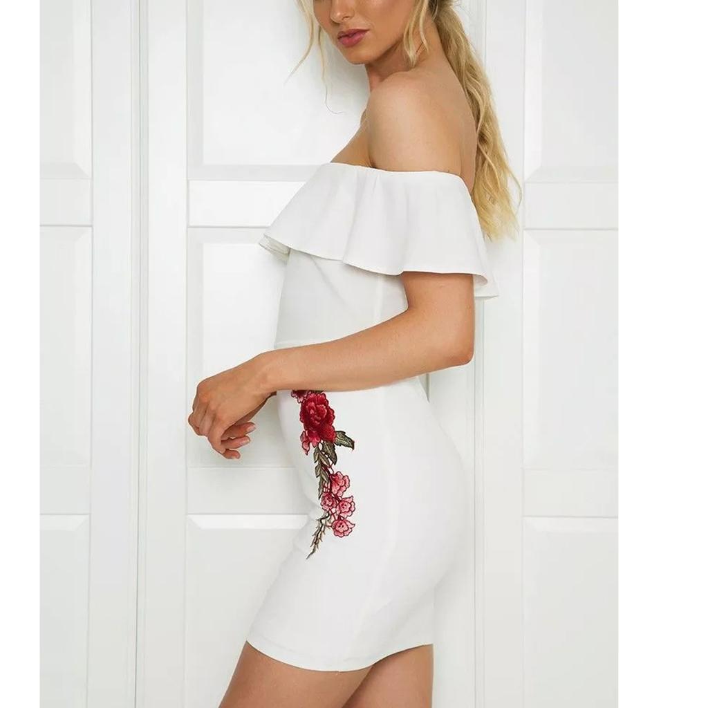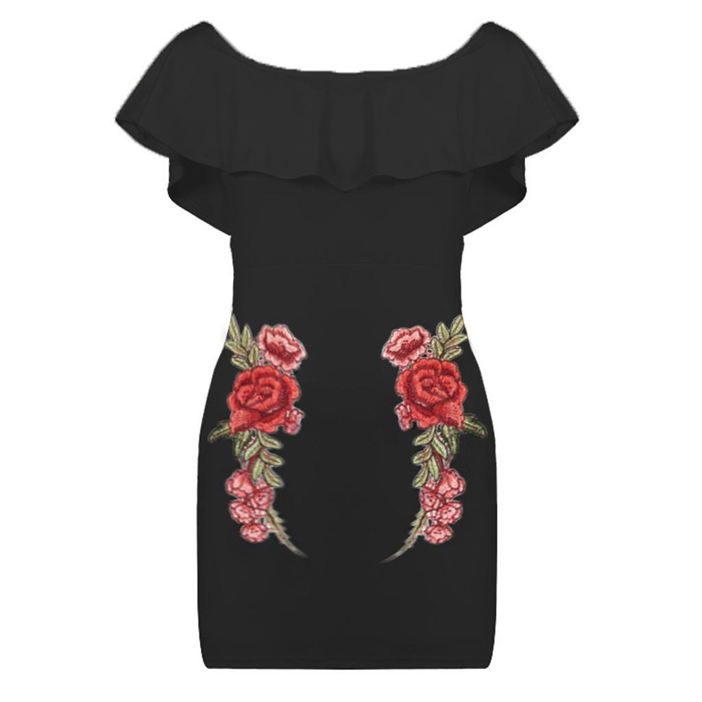 Women Sexy Ruffles Off the Shoulder Embroidered Floral Bodycon Party Dress.